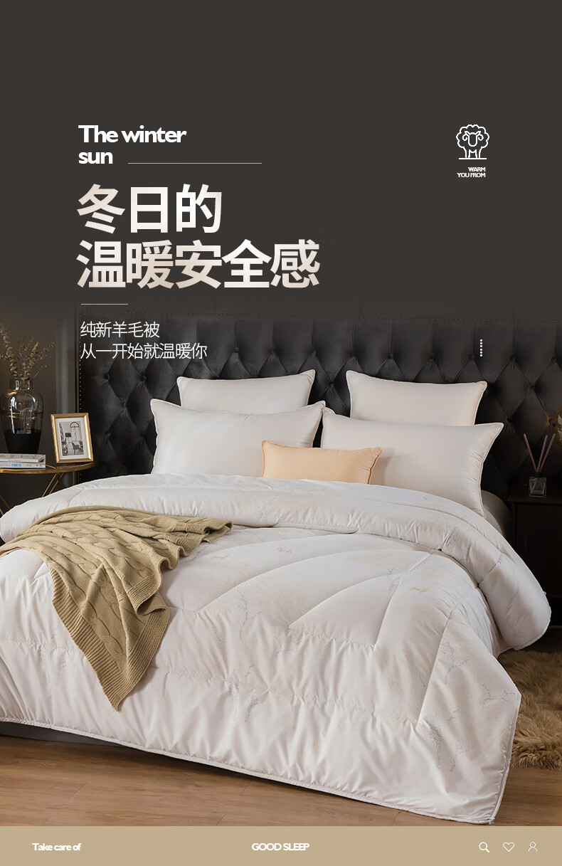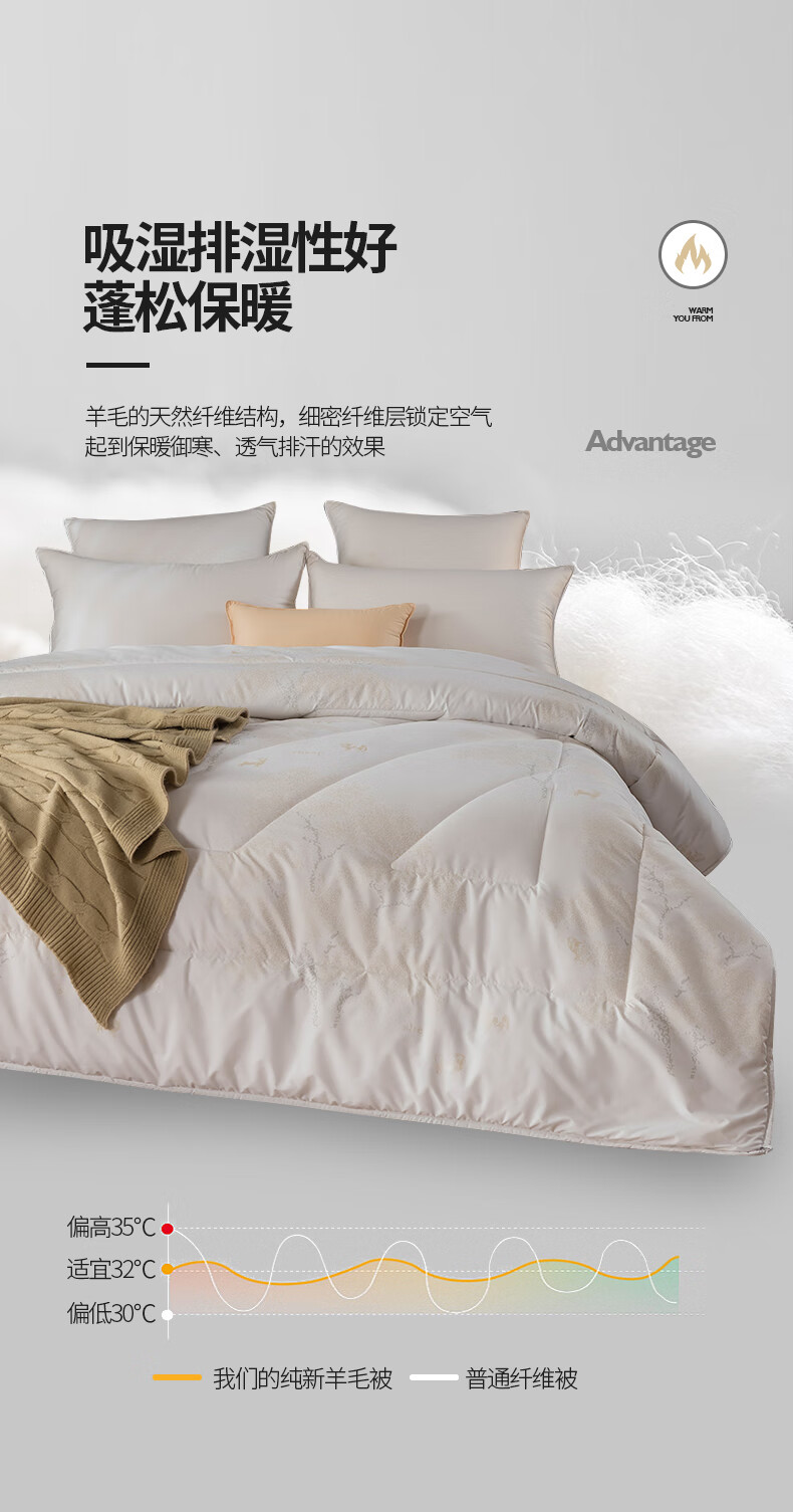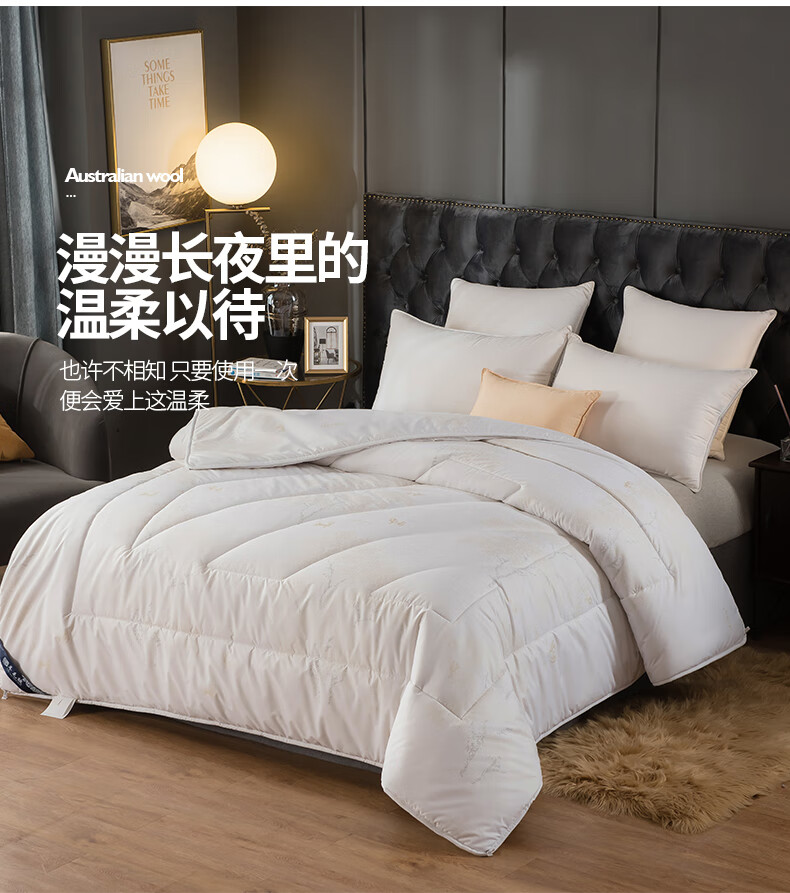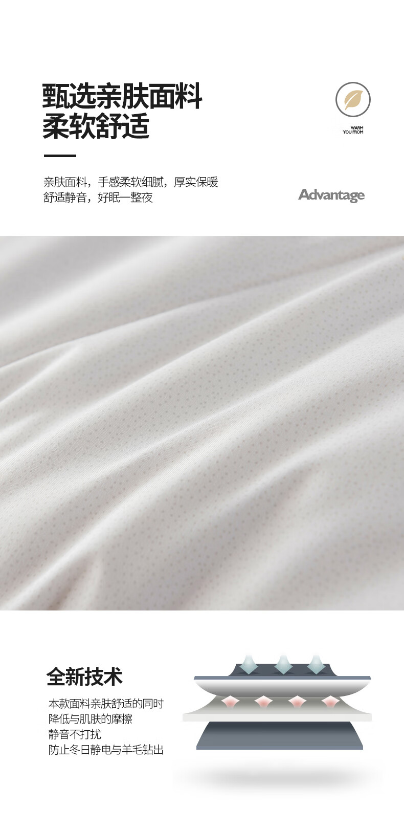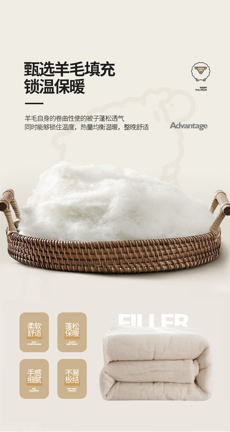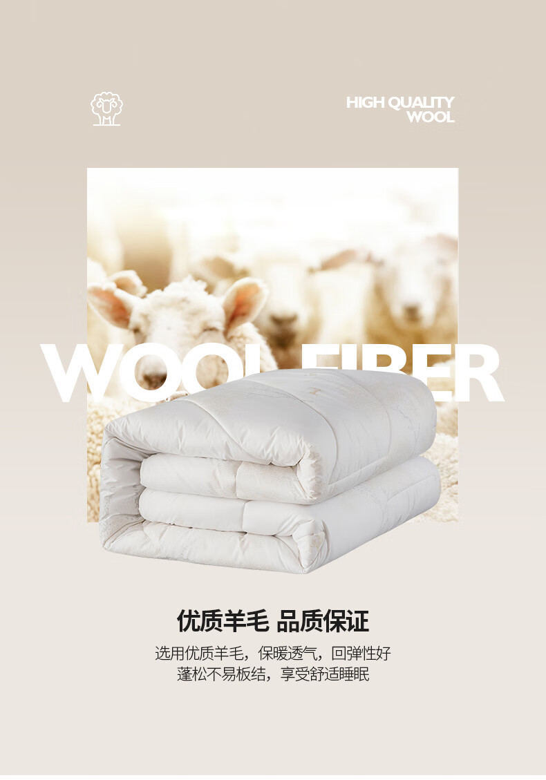 羊毛被优选品质均匀柔软性佳,有弹性强度高的羊毛材料;羊毛自身的卷曲性使被子蓬松透气同时能够很好的锁住温;使热量均衡不流失,保持温暖,整晚舒适