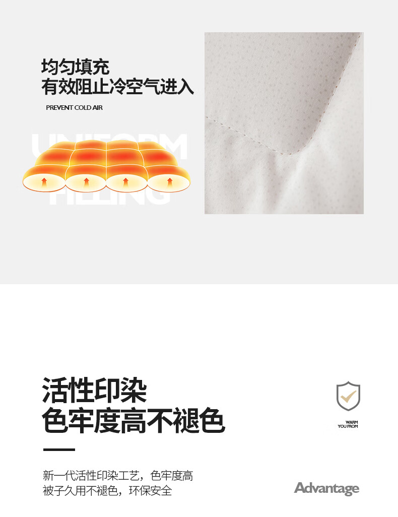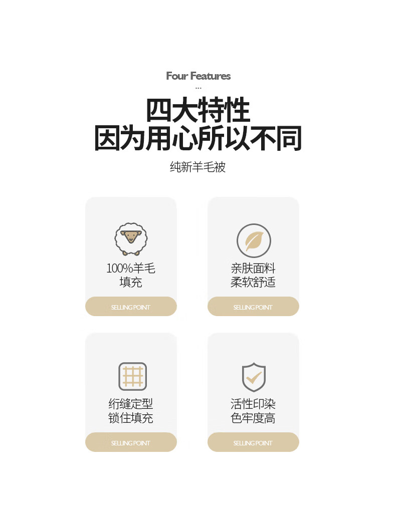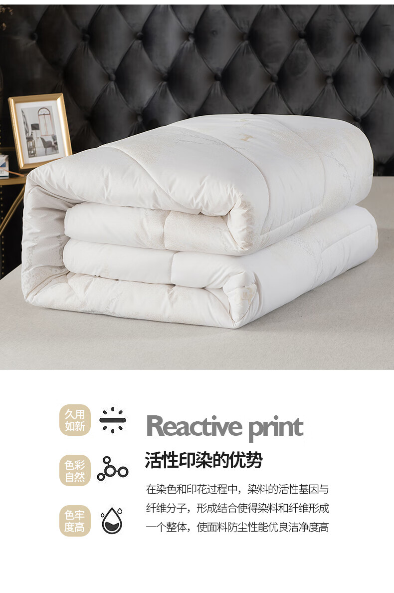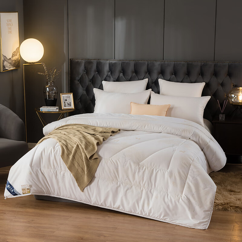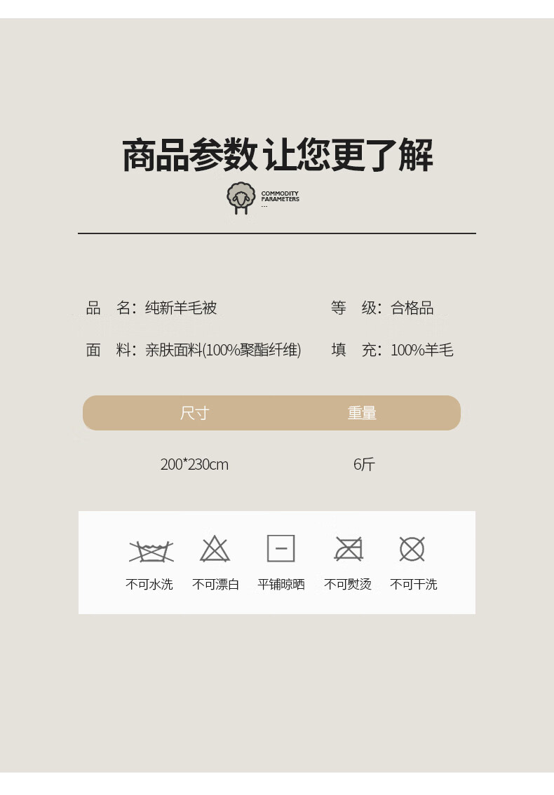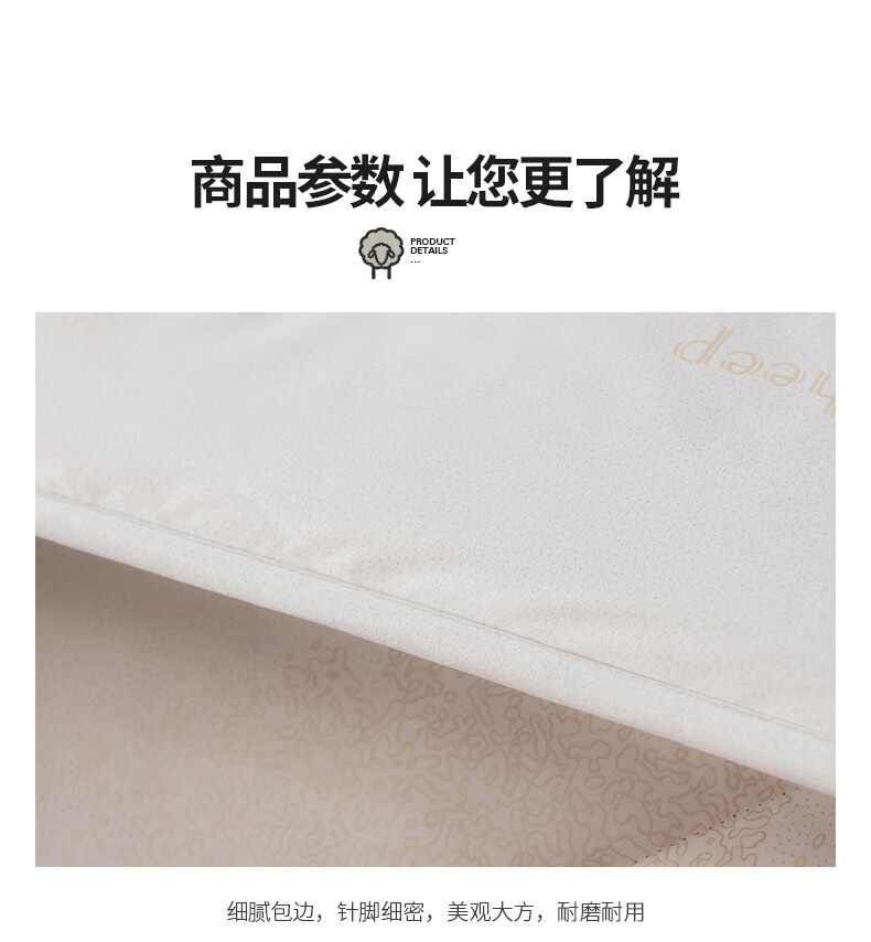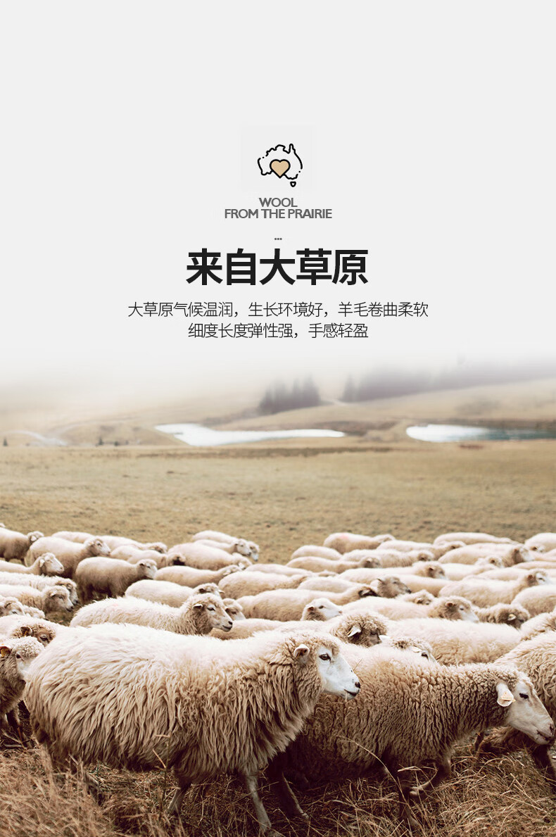 羊毛被优选品质均匀柔软性佳,有弹性强度高的羊毛材料;羊毛自身的卷曲性使被子蓬松透气同时能够很好的锁住温;使热量均衡不流失,保持温暖,整晚舒适