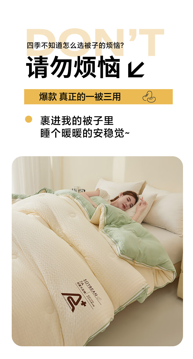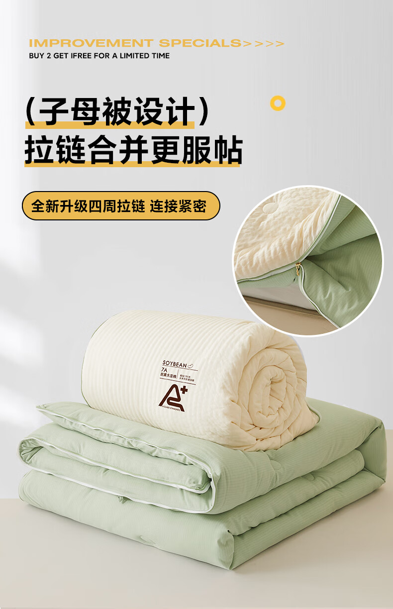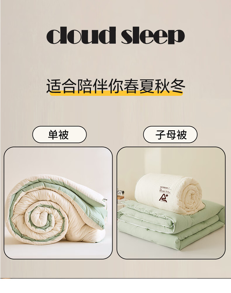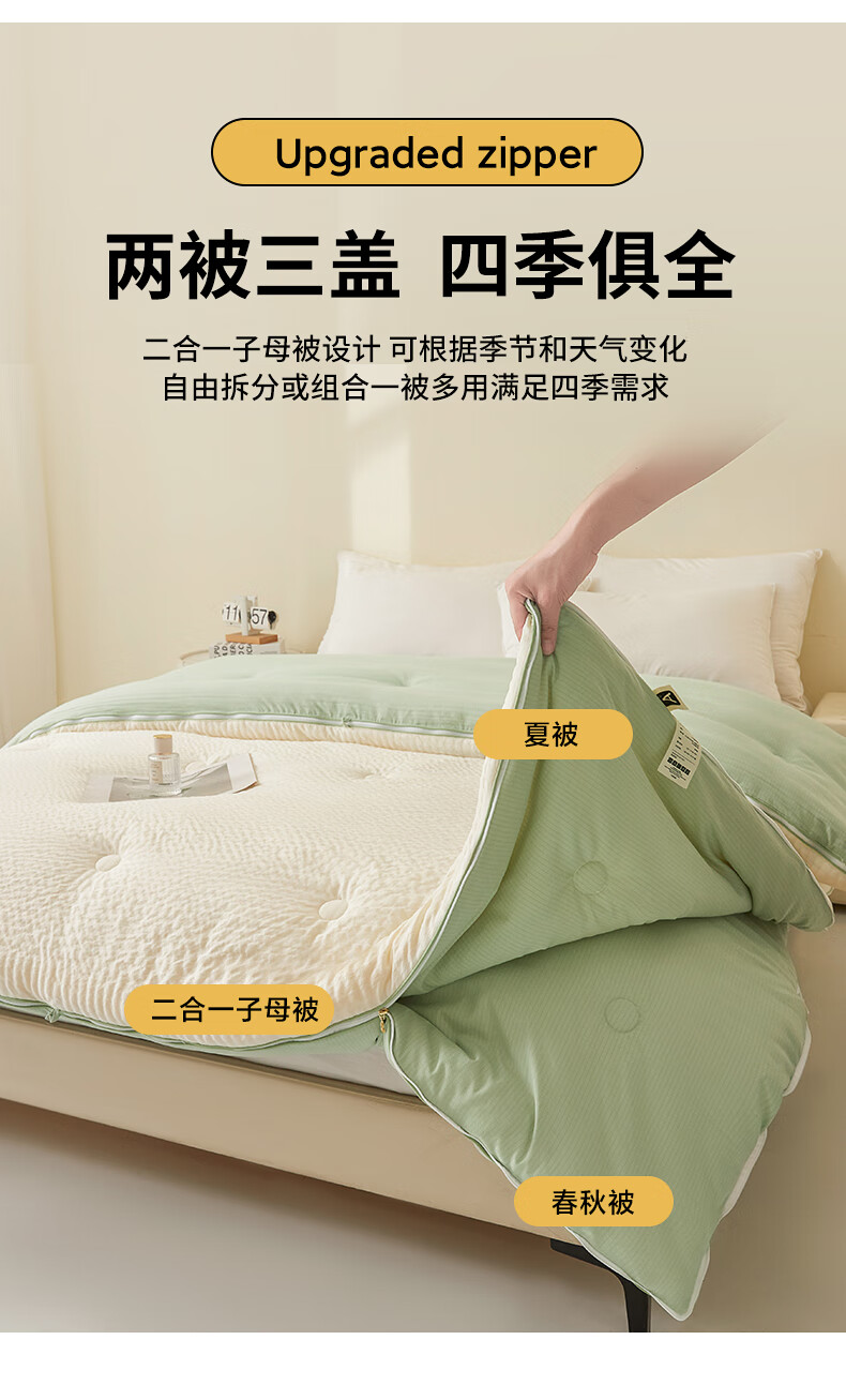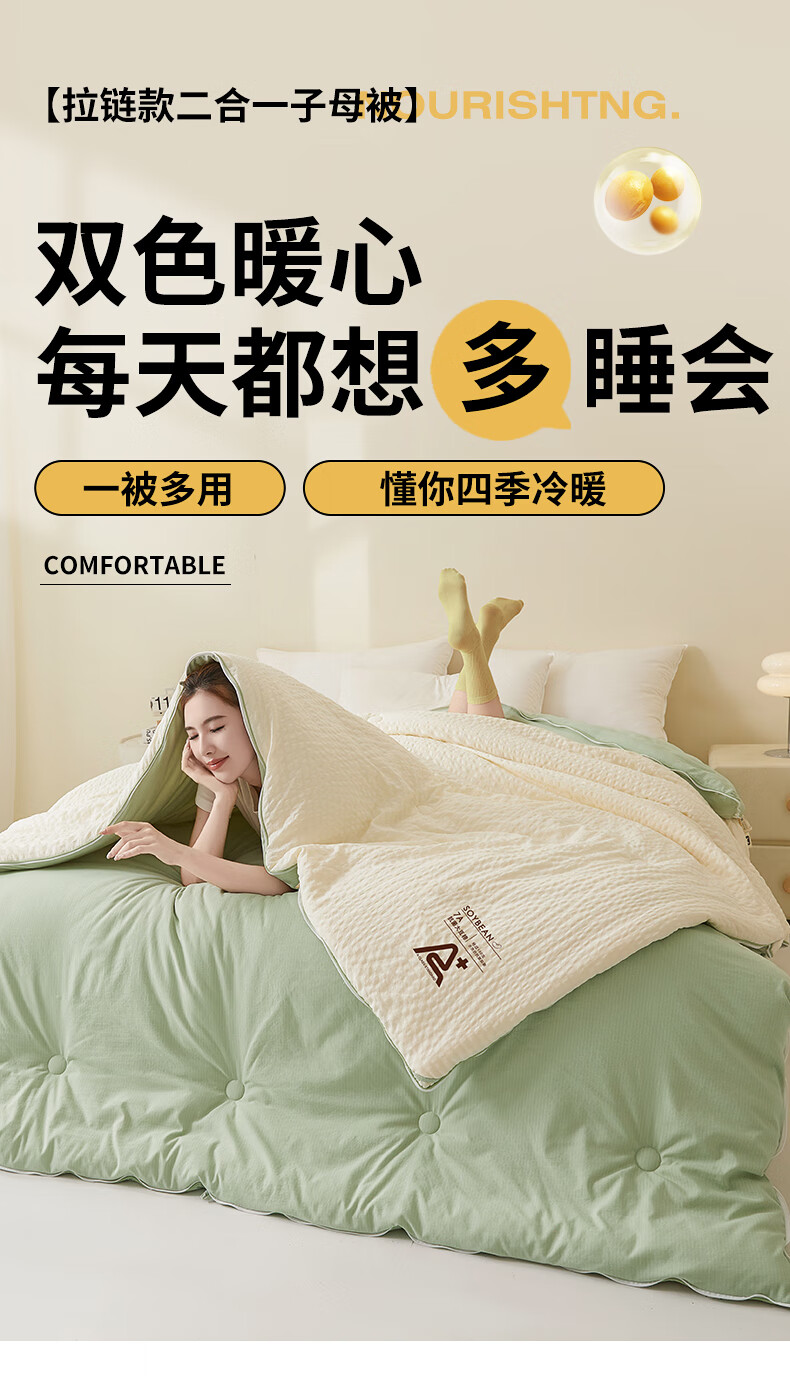 二合一子母被设计,一被三用四季无忧 满足不同需求;拉链款设计,采用采用大豆纤维1:9配比;均匀填充蓬松饱满 回弹性好;滋养肌肤轻盈不压身,舒适酣睡一整夜。