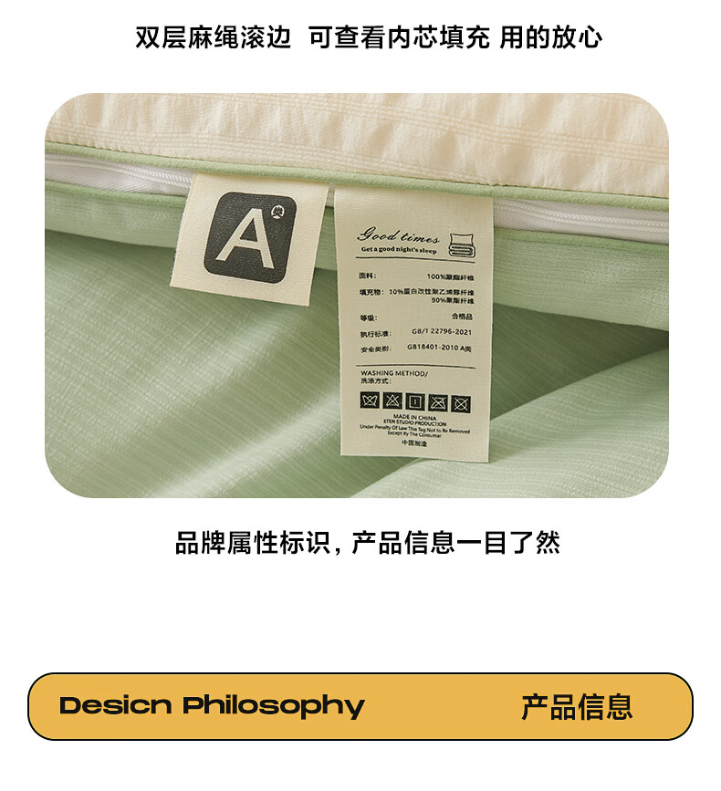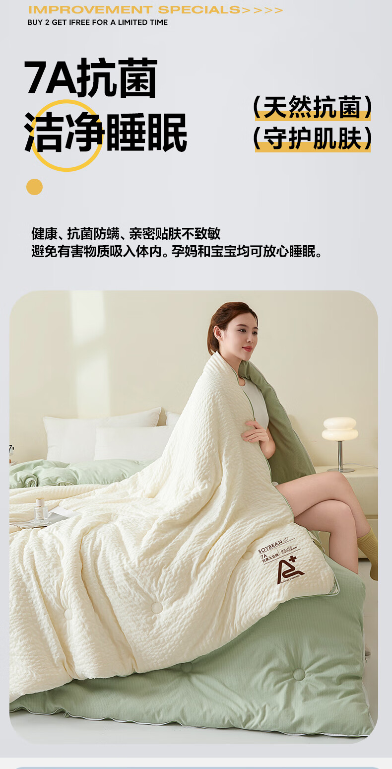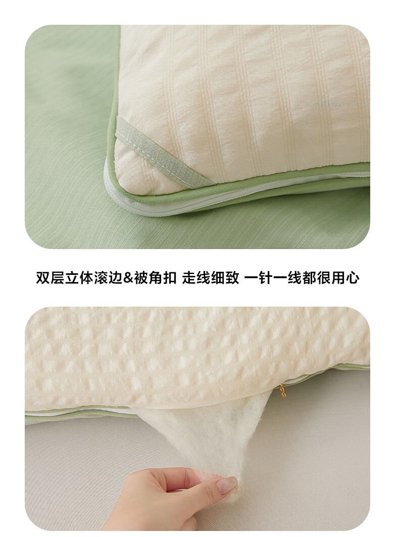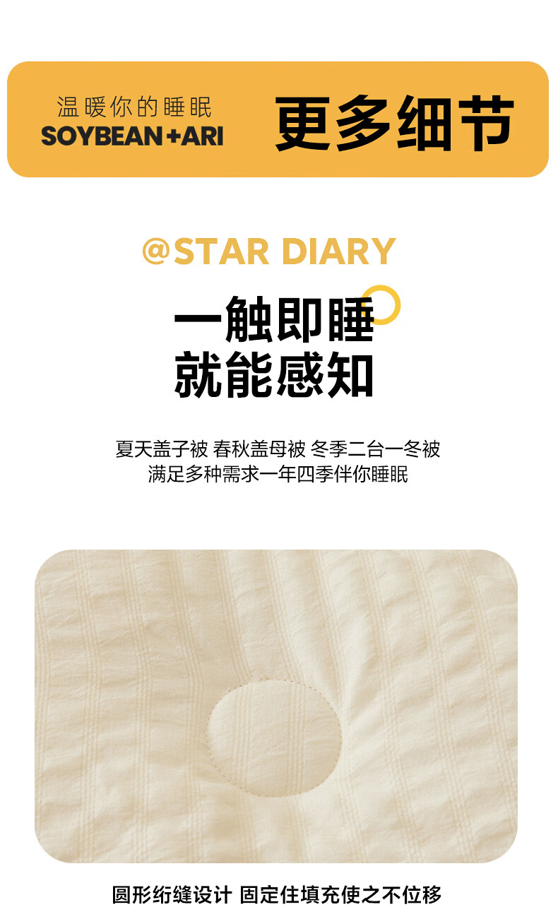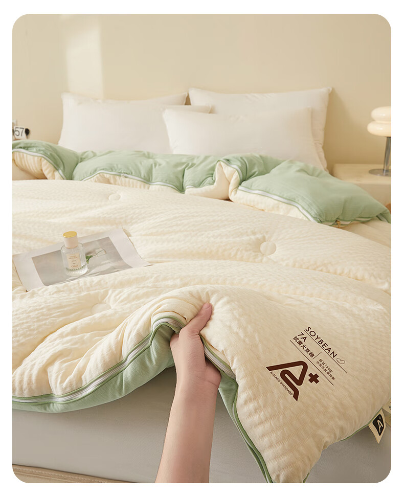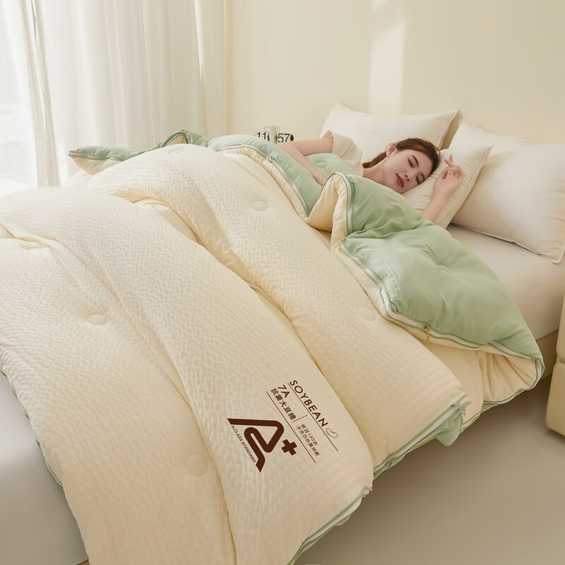 二合一子母被设计,一被三用四季无忧 满足不同需求;拉链款设计,采用采用大豆纤维1:9配比;均匀填充蓬松饱满 回弹性好;滋养肌肤轻盈不压身,舒适酣睡一整夜。