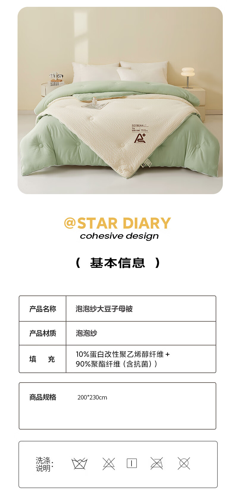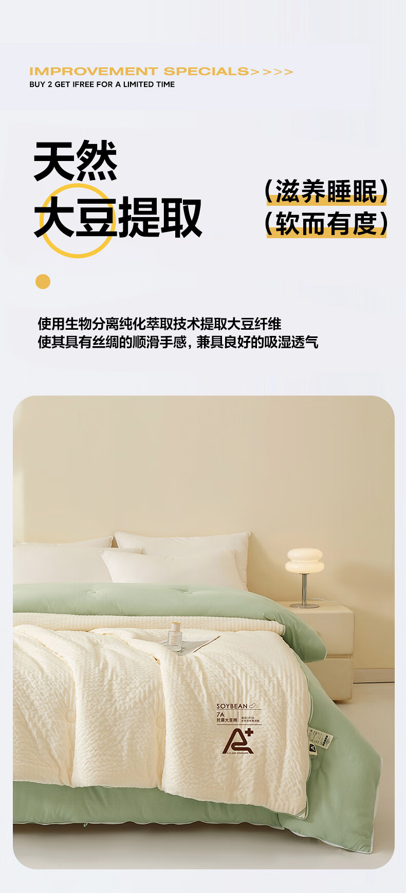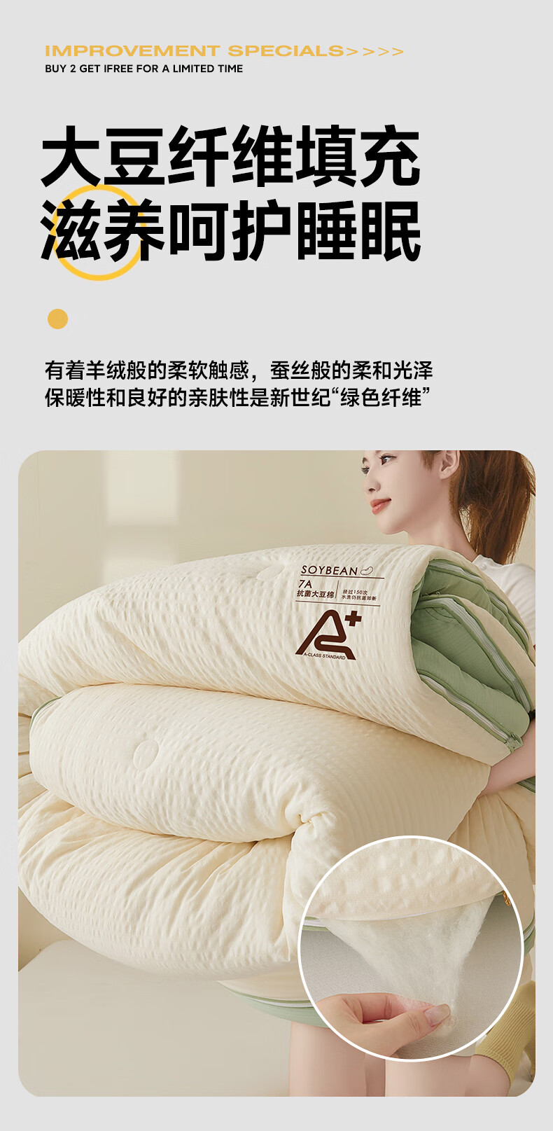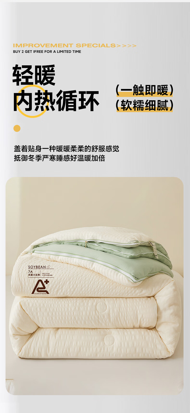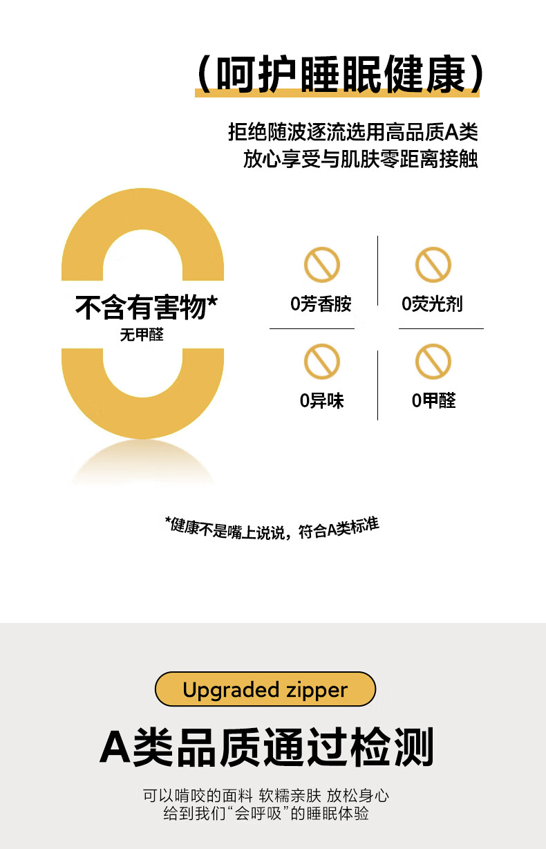 二合一子母被设计,一被三用四季无忧 满足不同需求;拉链款设计,采用采用大豆纤维1:9配比;均匀填充蓬松饱满 回弹性好;滋养肌肤轻盈不压身,舒适酣睡一整夜。