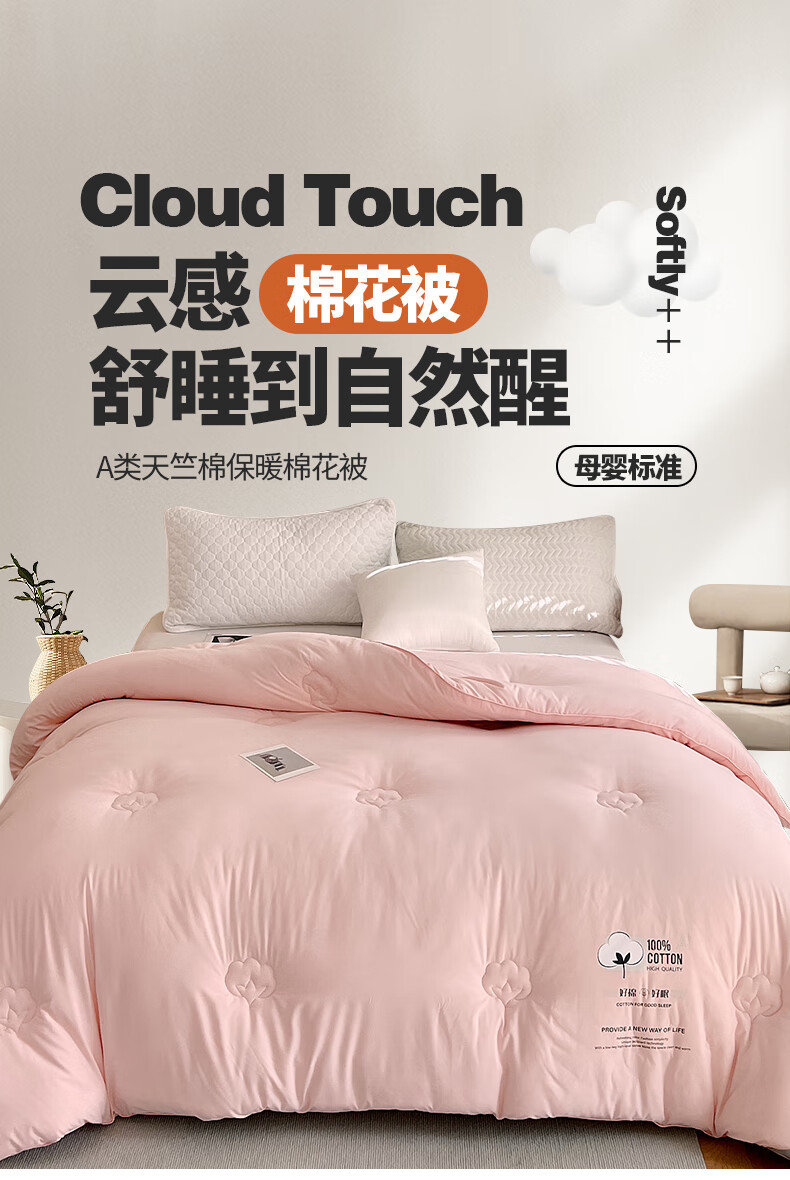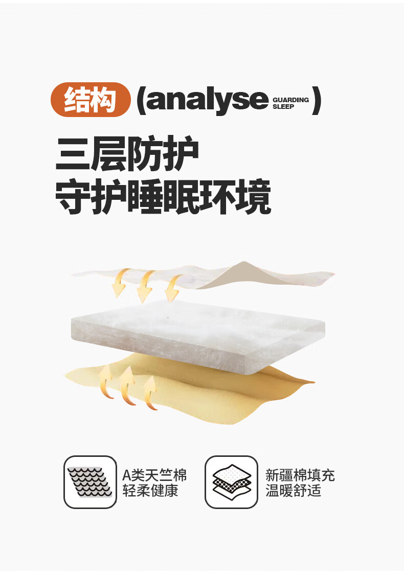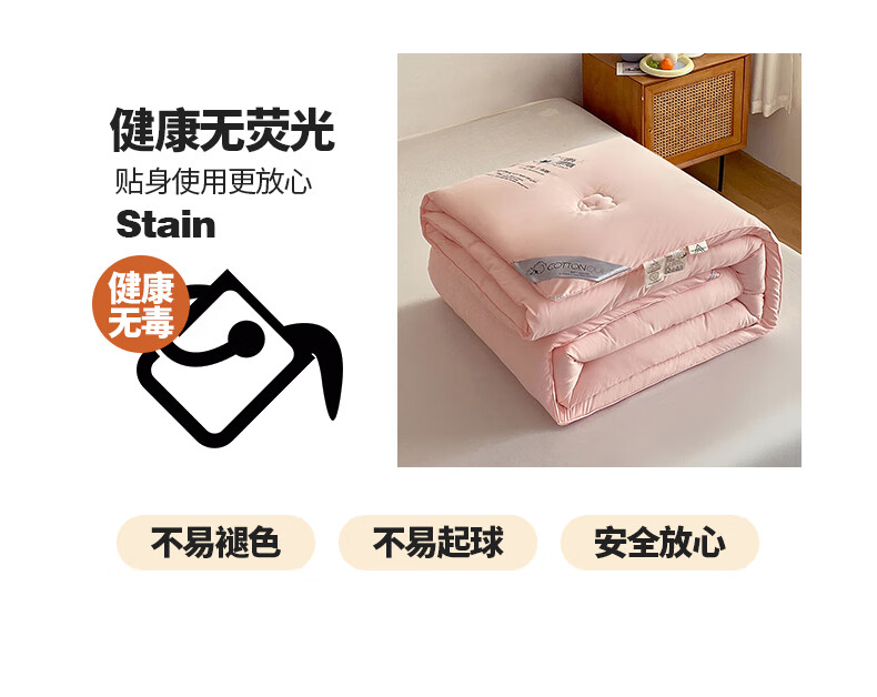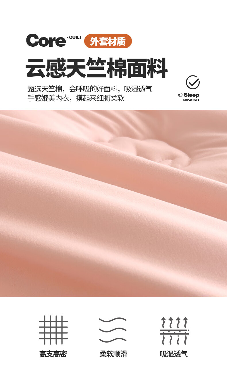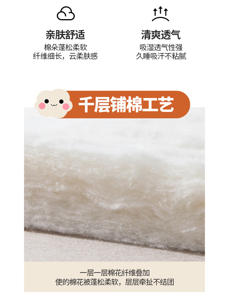 天竺棉面料,会呼吸的好面料,吸湿透气手感媲美内衣;摸起来细腻柔软,填充选用优质新疆棉花。;A类高标准,无刺激,适合敏感肌肤。