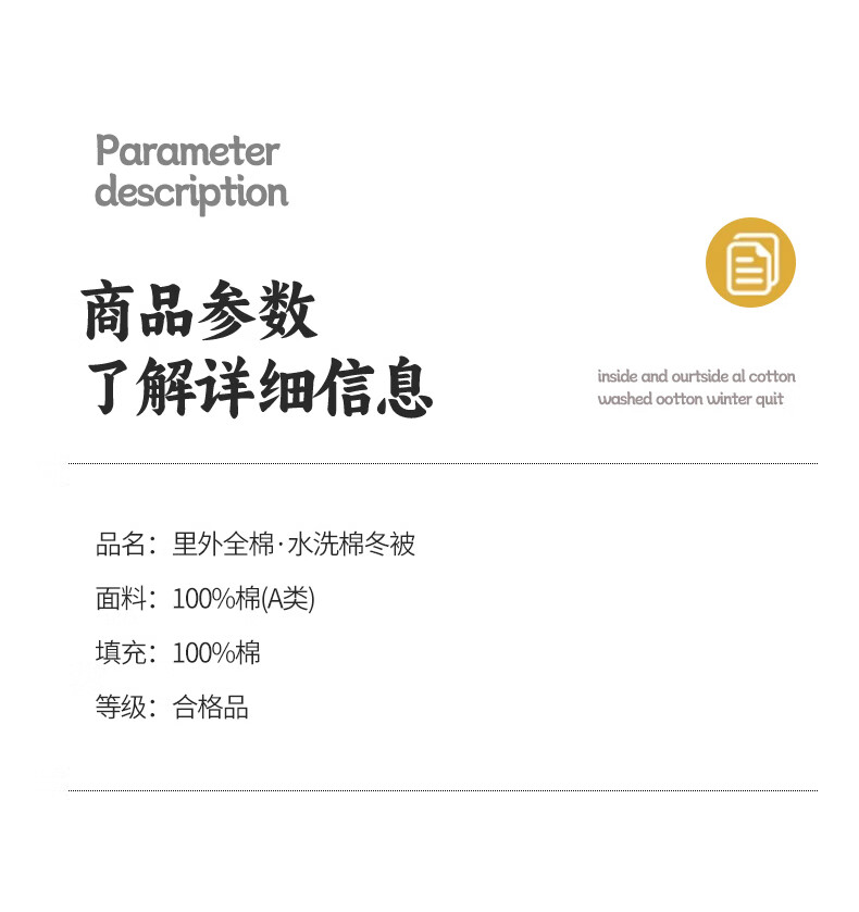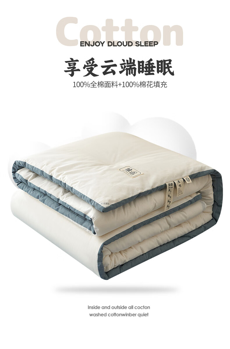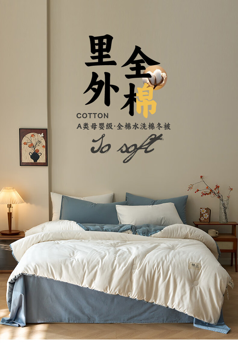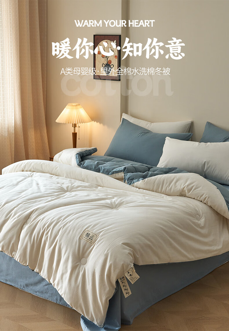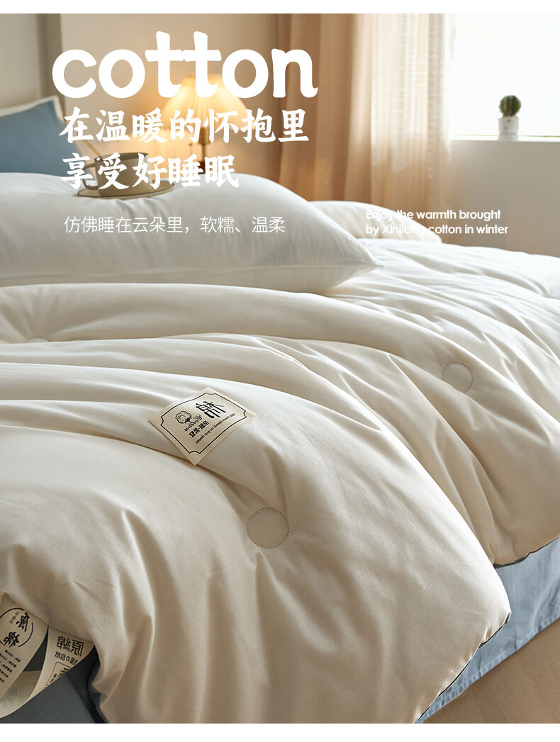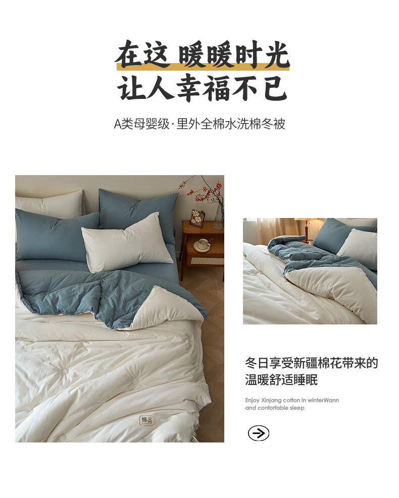 里外都是全棉的棉花冬被,吸湿透气手感暖糯,细腻柔软;填充选用优质新疆棉花;高标准,无刺激,适合敏感肌肤
