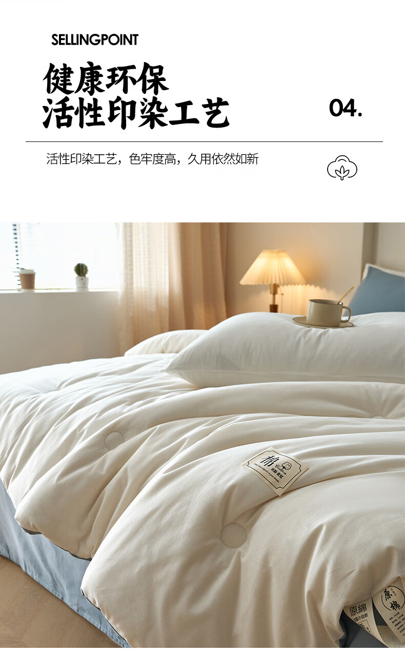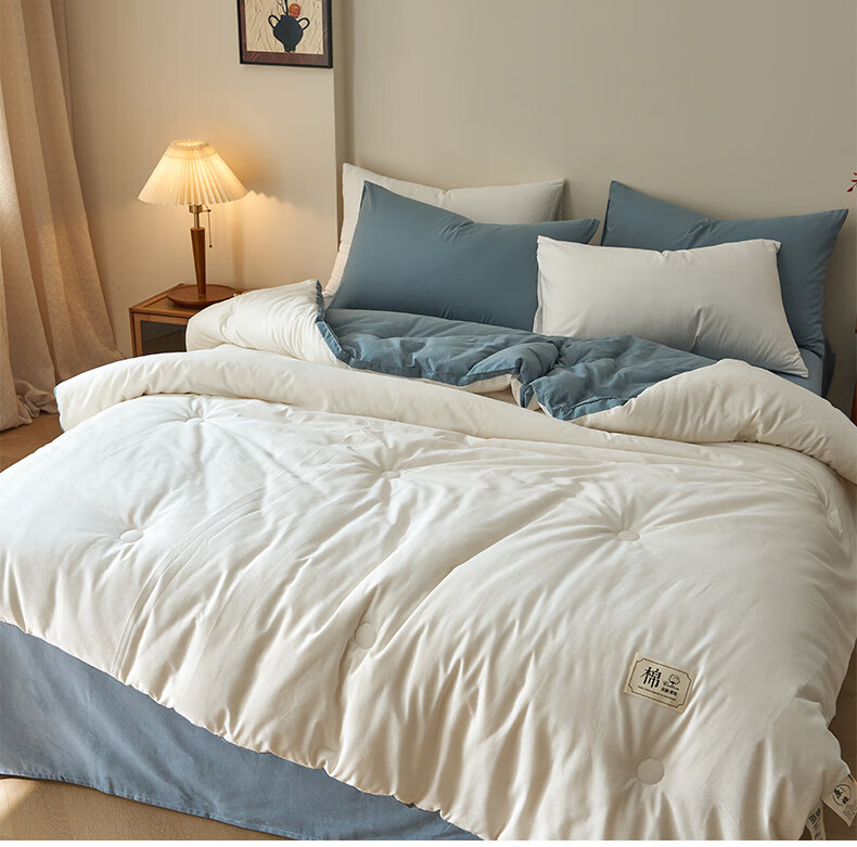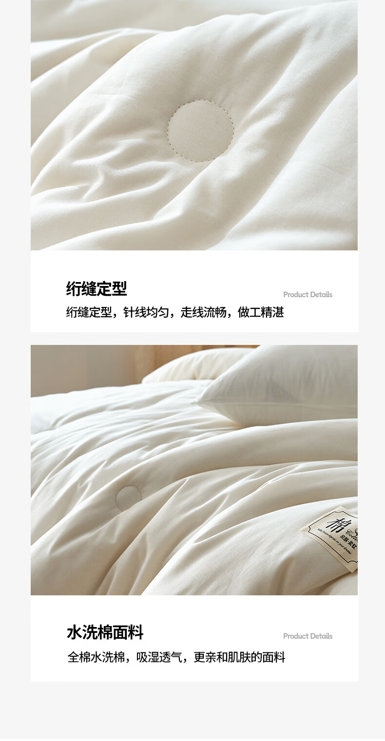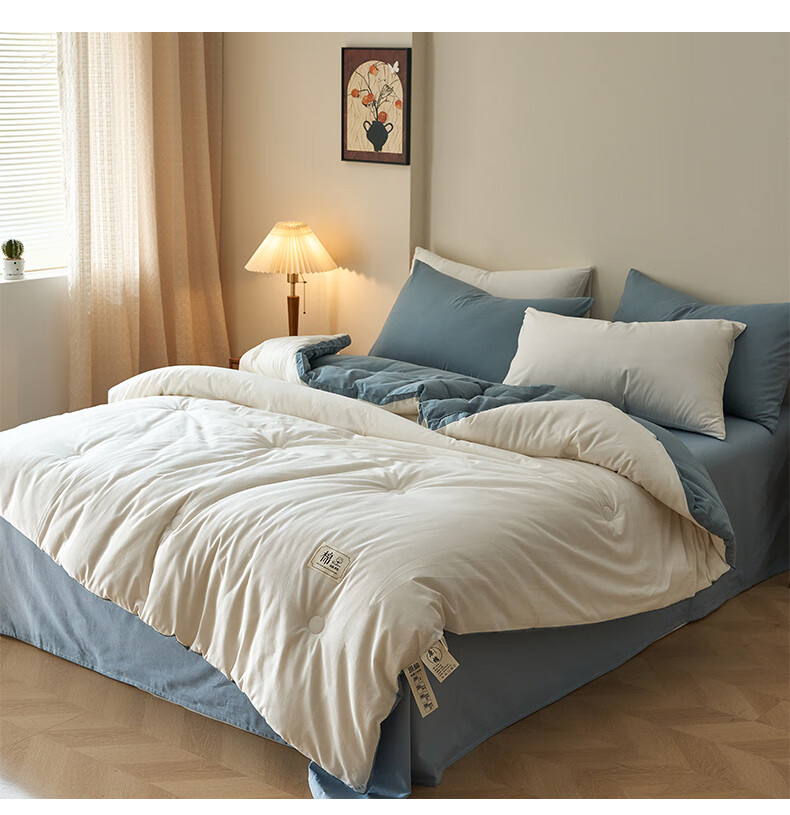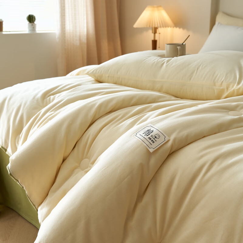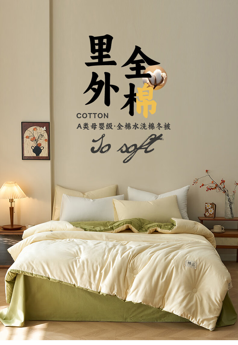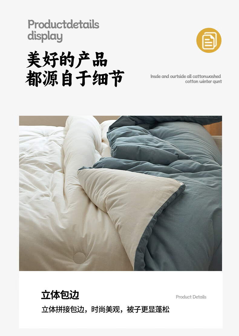 里外都是全棉的棉花冬被,吸湿透气手感暖糯,细腻柔软;填充选用优质新疆棉花;高标准,无刺激,适合敏感肌肤