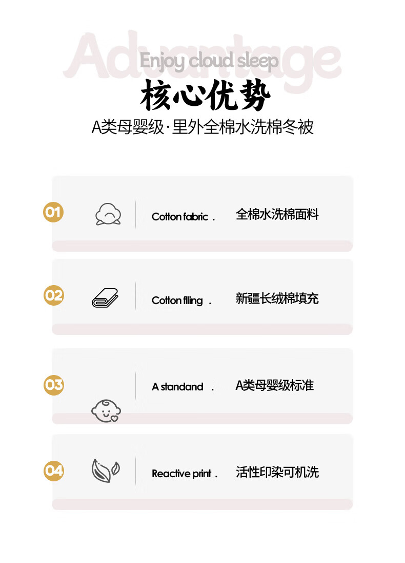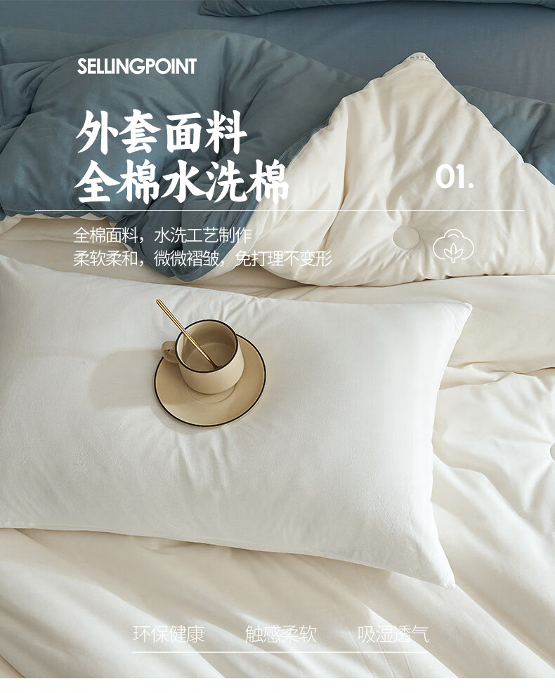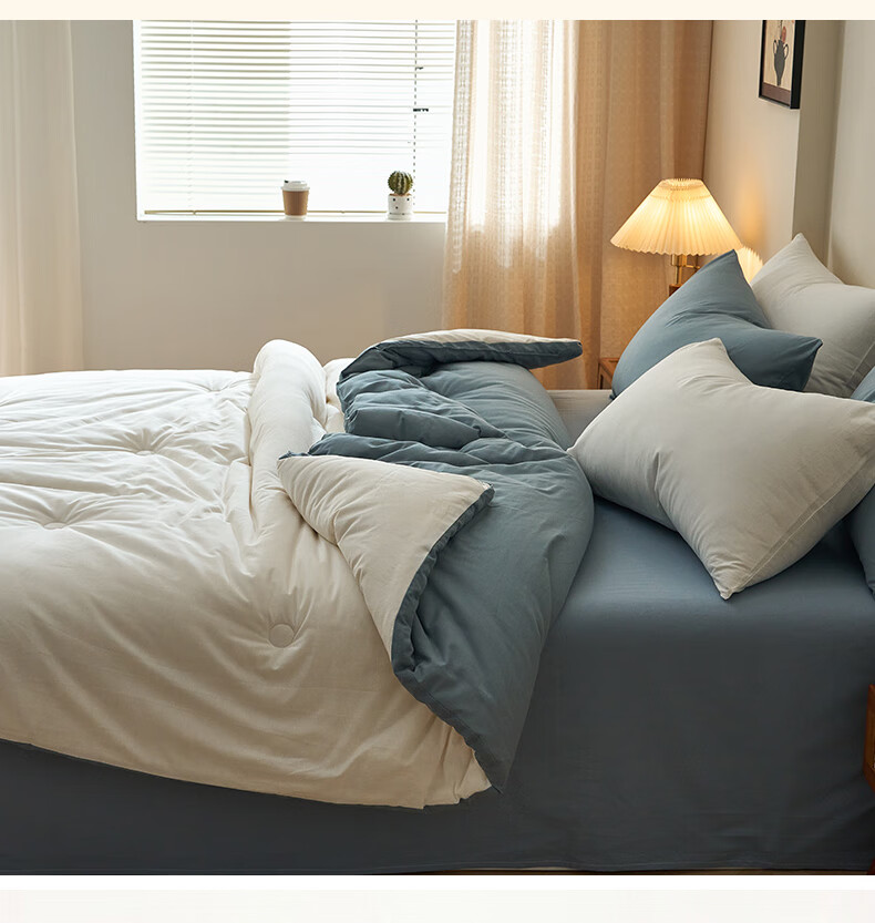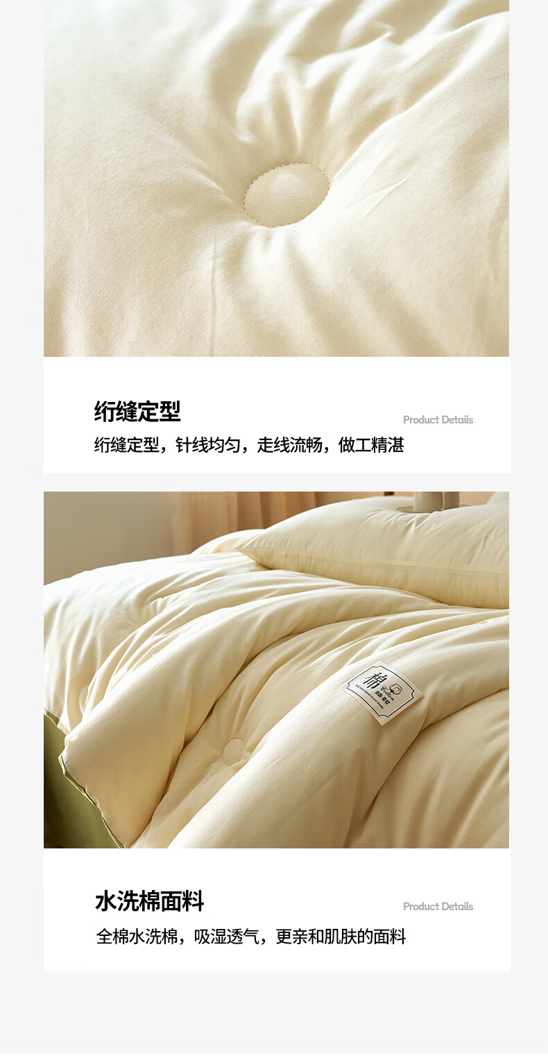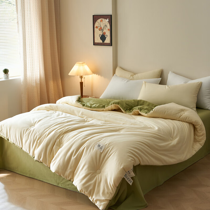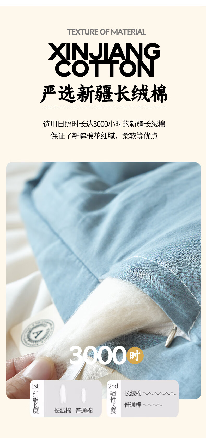 里外都是全棉的棉花冬被,吸湿透气手感暖糯,细腻柔软;填充选用优质新疆棉花;高标准,无刺激,适合敏感肌肤