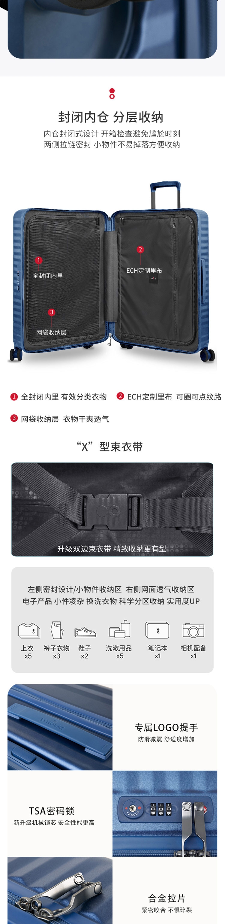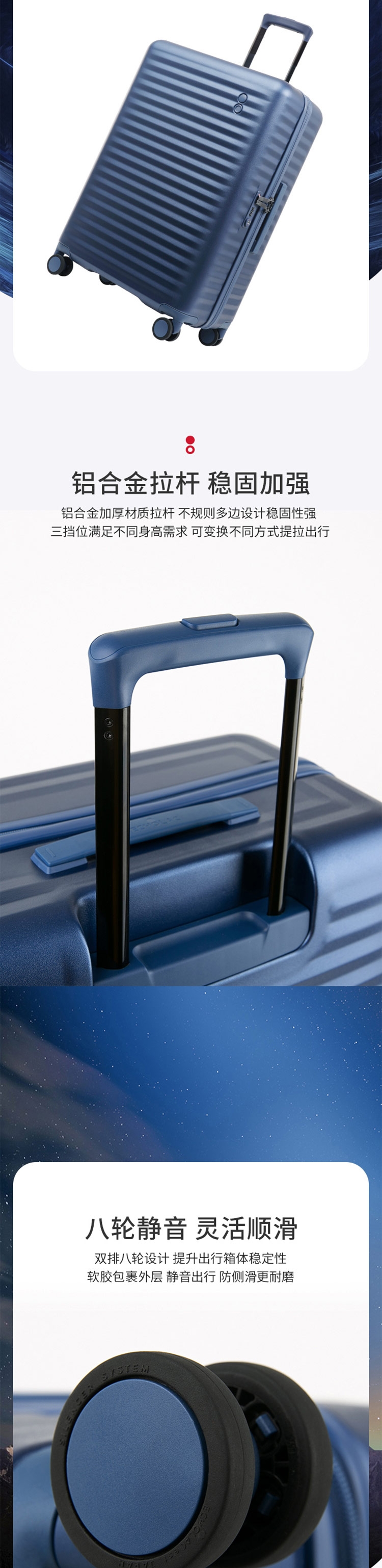 坚韧耐磨PC箱,更轻盈,便携出行;全封闭内里,有效分类衣物,网袋收纳层,衣服透气舒爽;打造硬核科技风,未来感十足静音八轮,铝合金拉杆