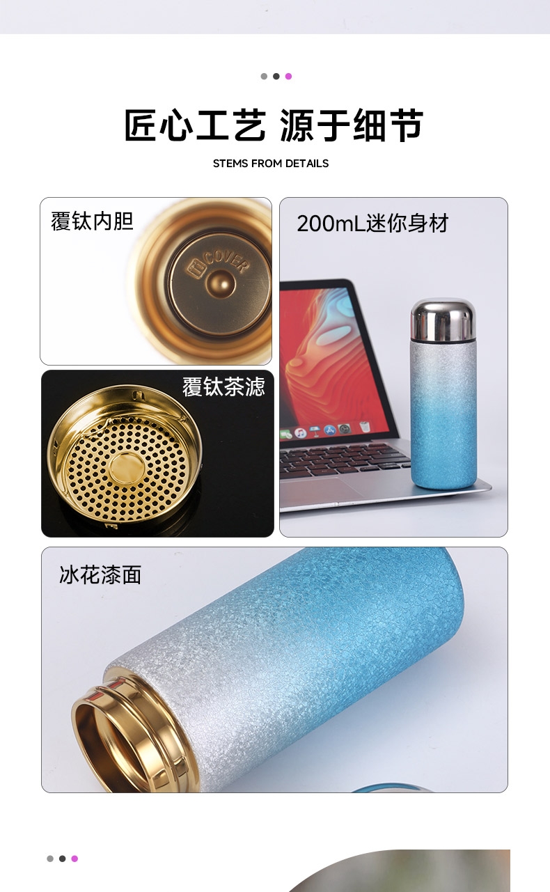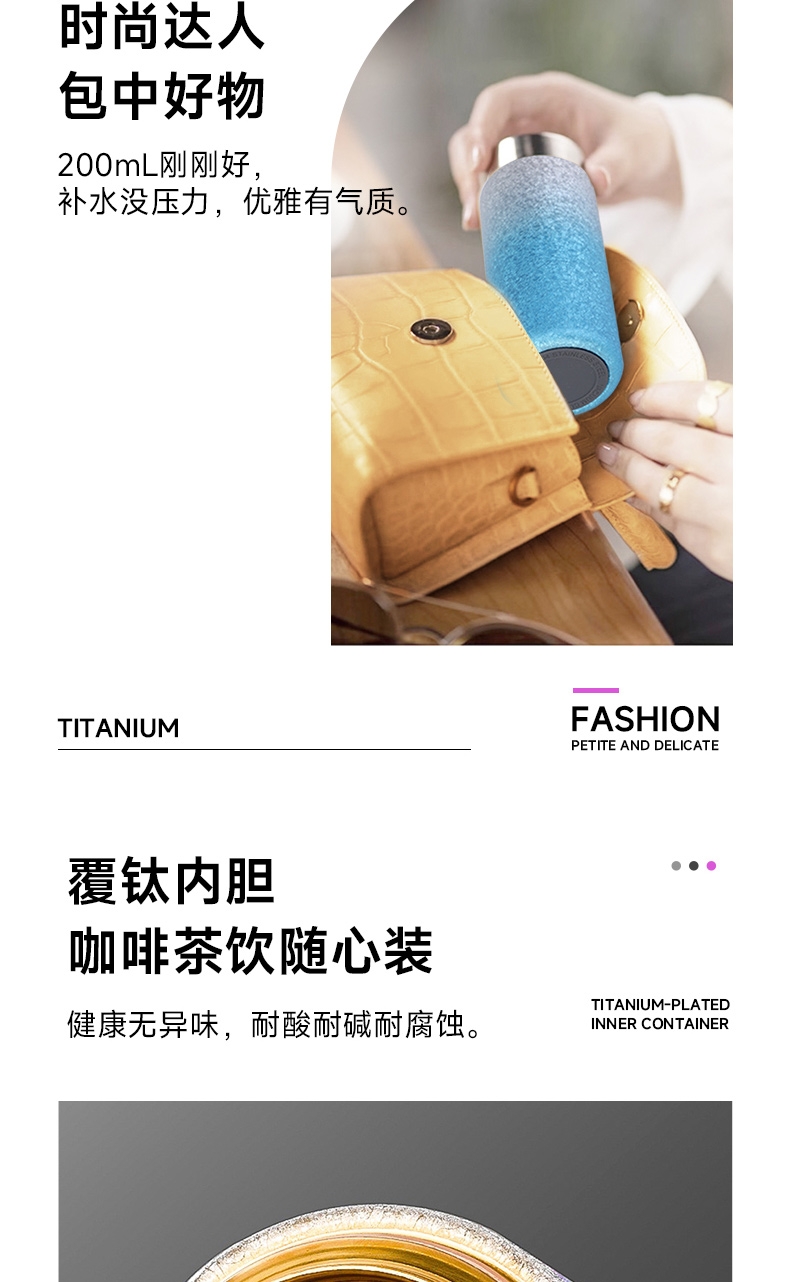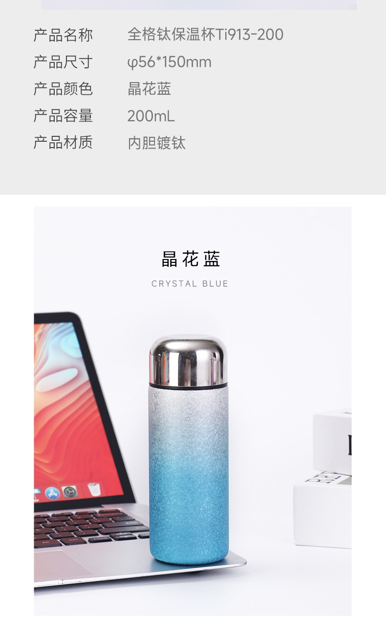 200ml迷你杯,轻盈小巧,携带方便;镀钛内胆,长效抑菌保鲜;杯身水晶纹晶花漆工艺