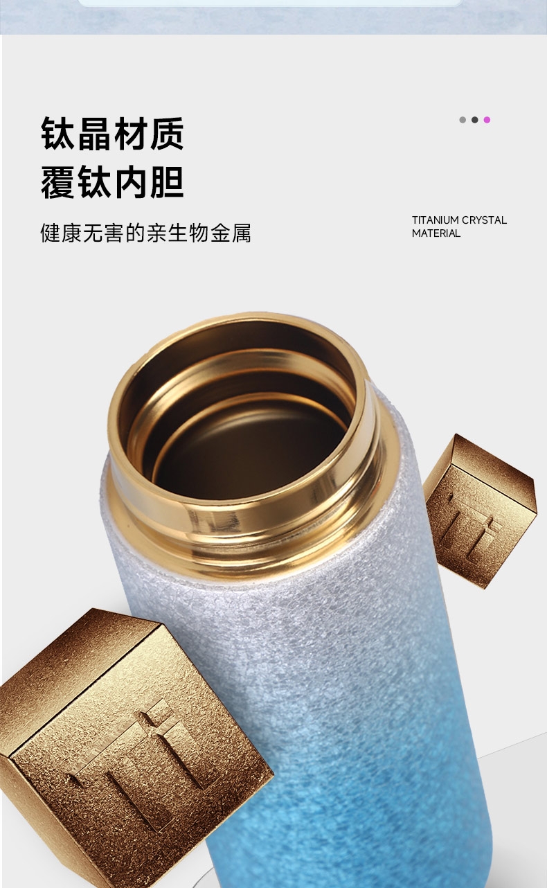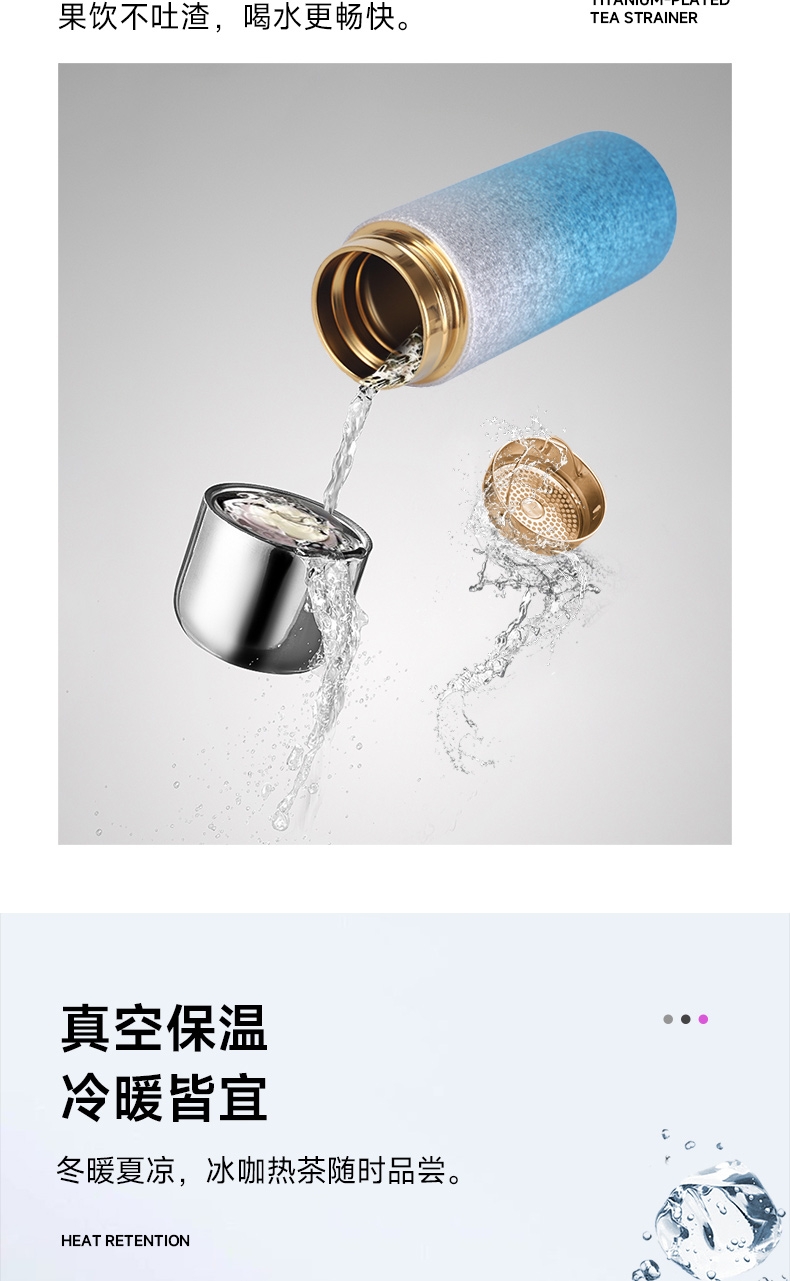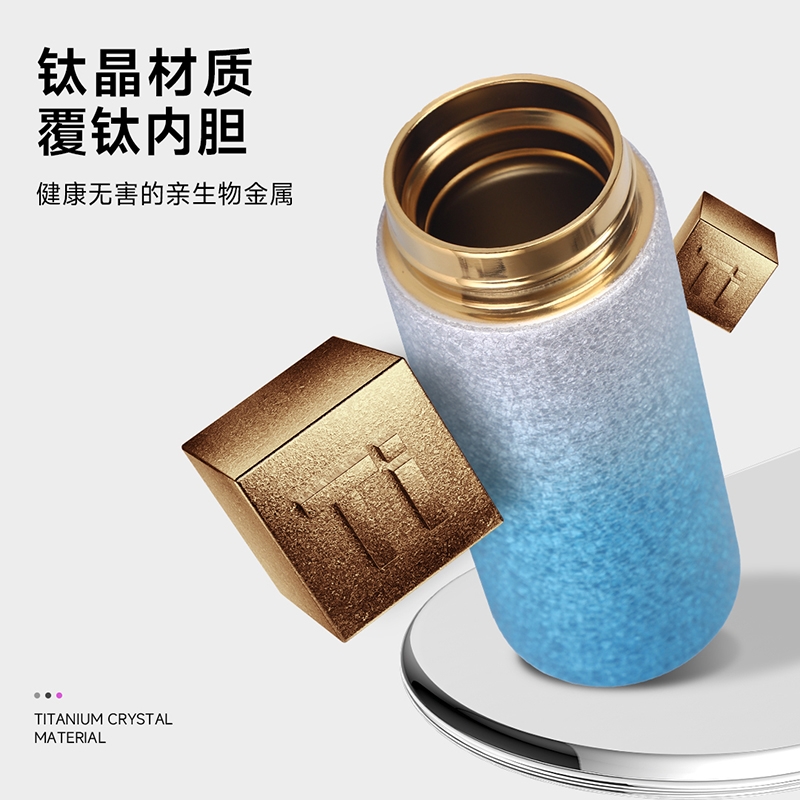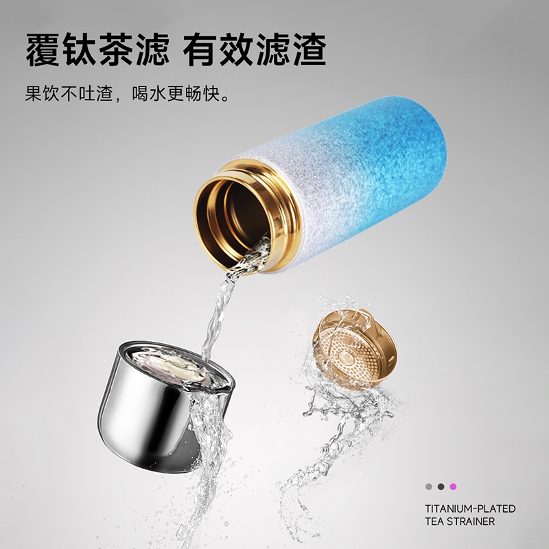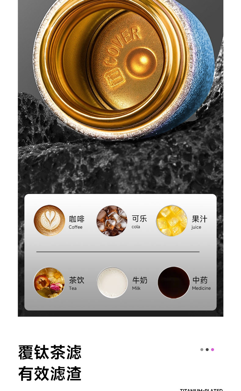 材质:内胆、茶滤SUS304+钛TA1(镀钛);杯盖:SUS304,杯盖:PP,密封圈:硅橡胶