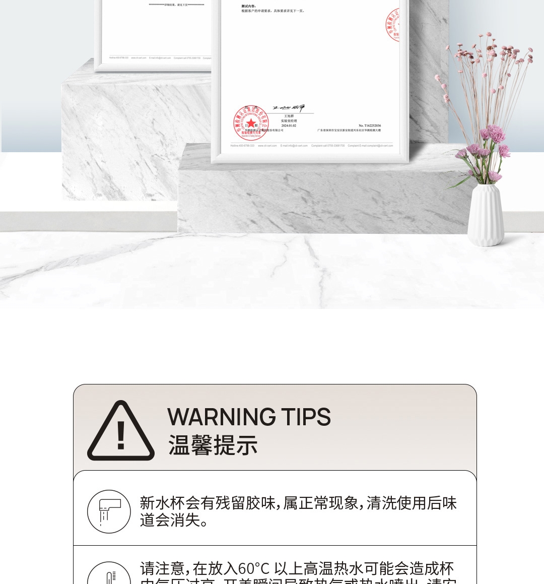 材质:内外胆、杯盖、茶漏:钛TA1 塑料件:PP;密封件:硅橡胶