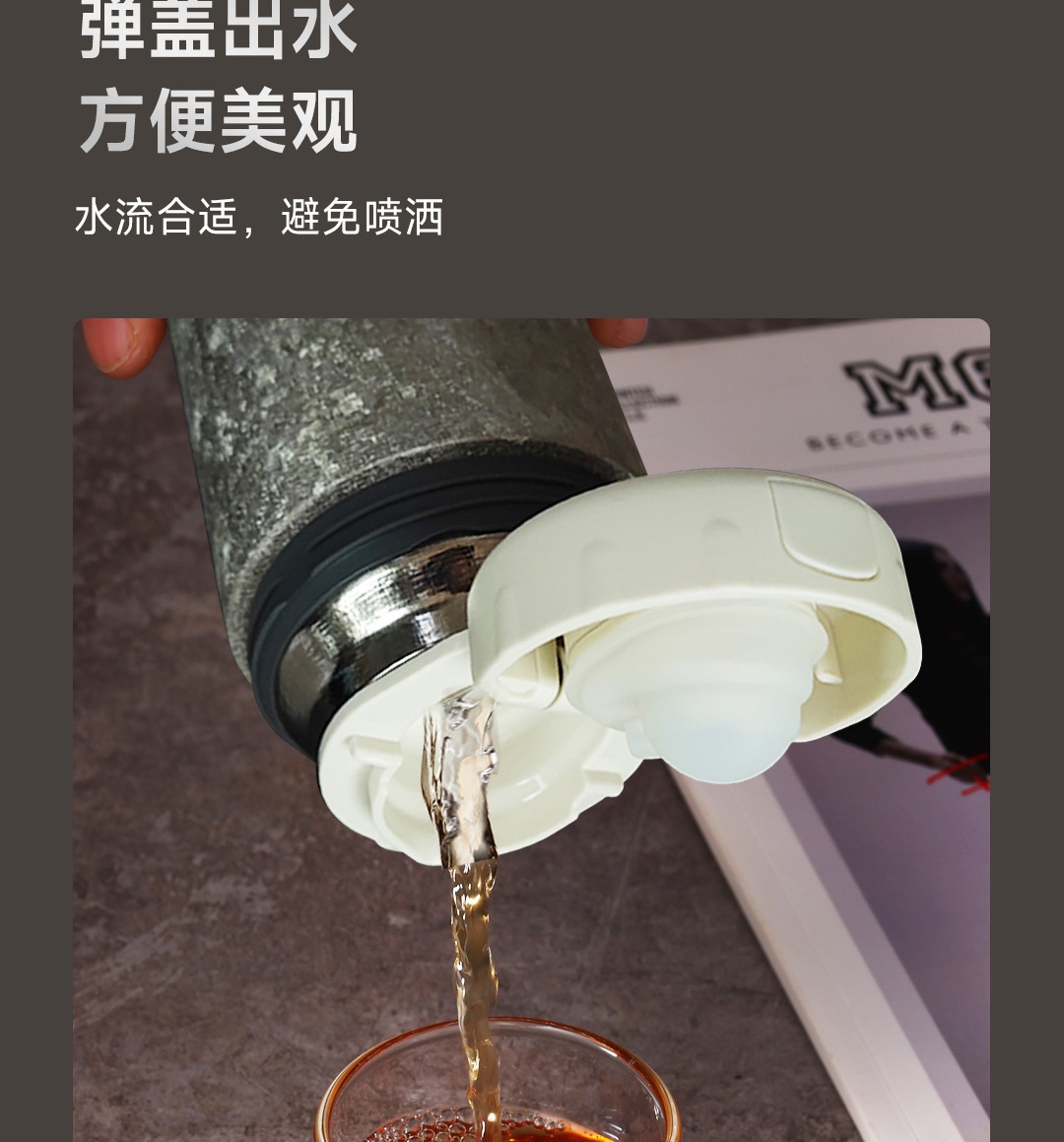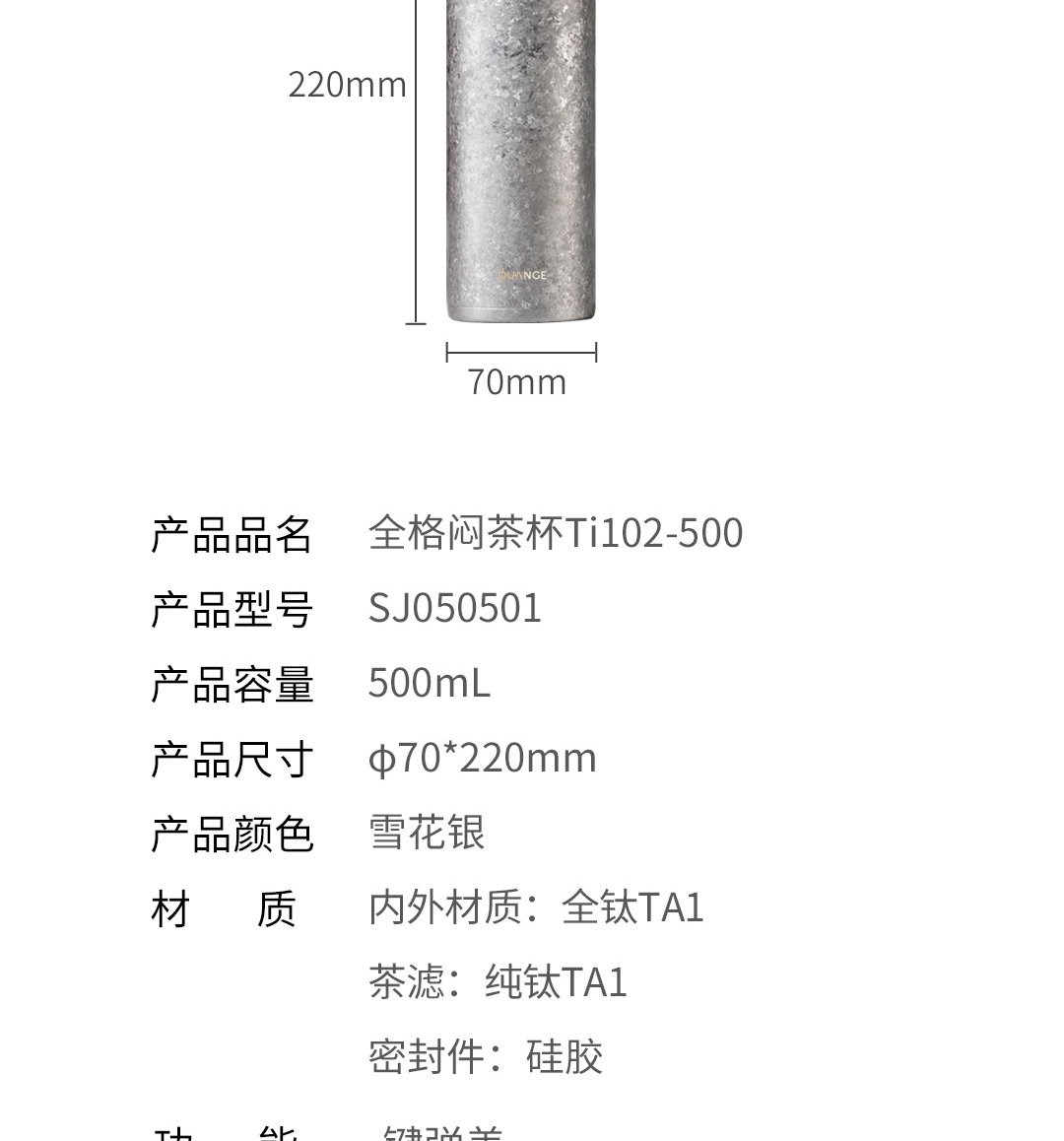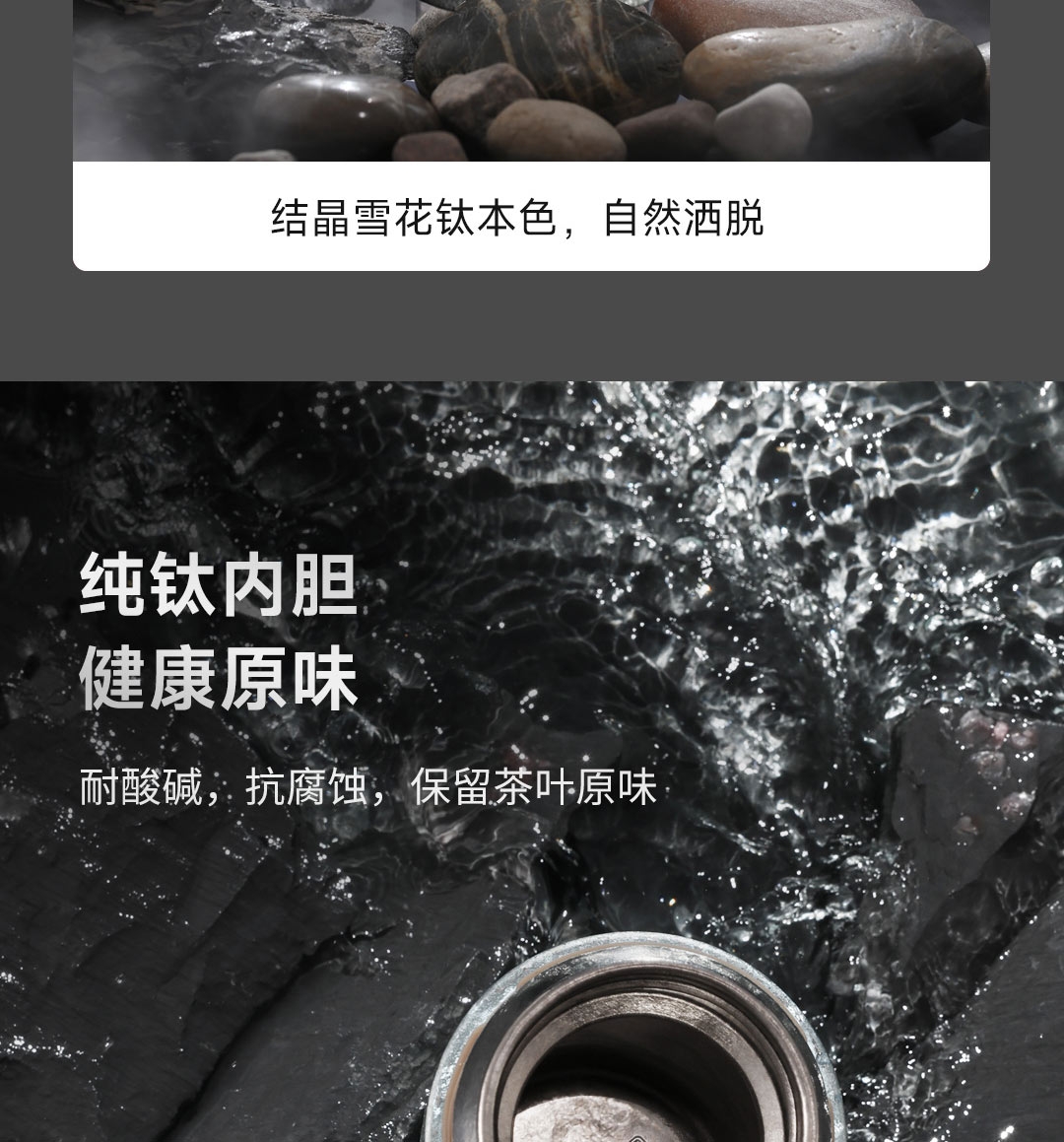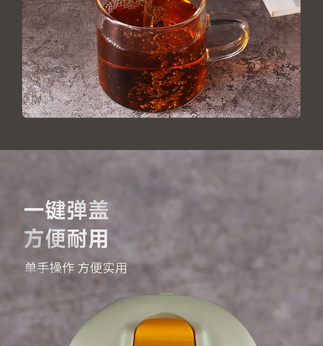 内外纯钛材质,抑菌锁鲜;内置隐藏式纯钛茶滤,可焖可泡;一键弹盖,饮茶方便