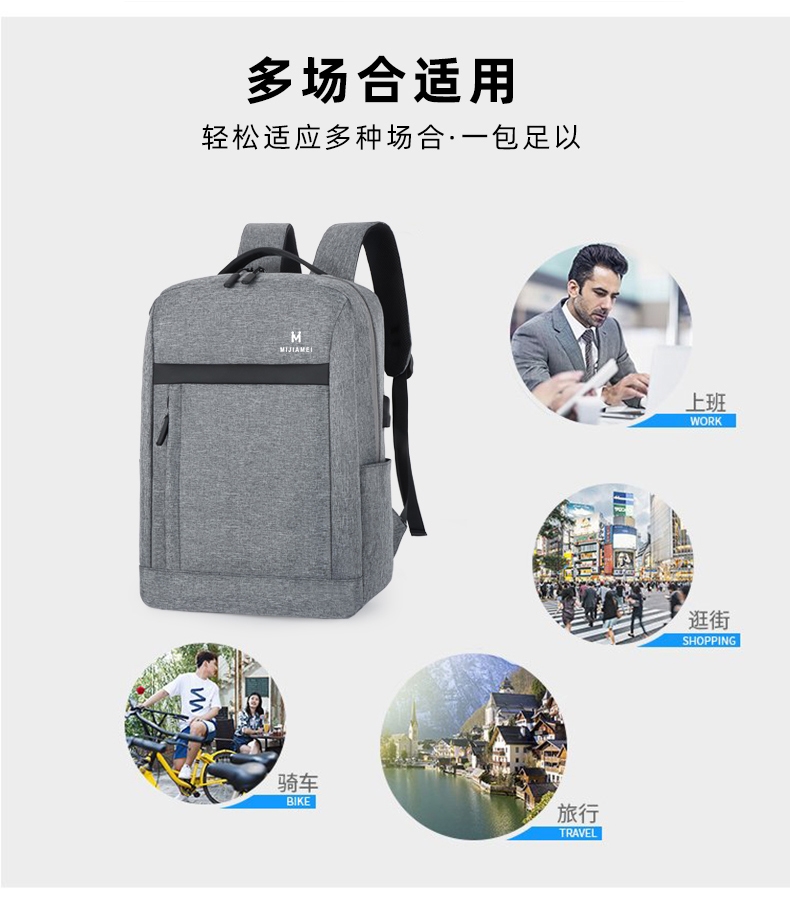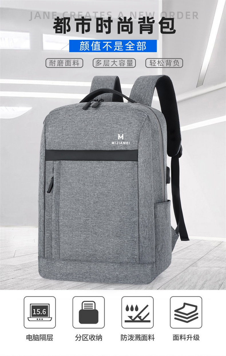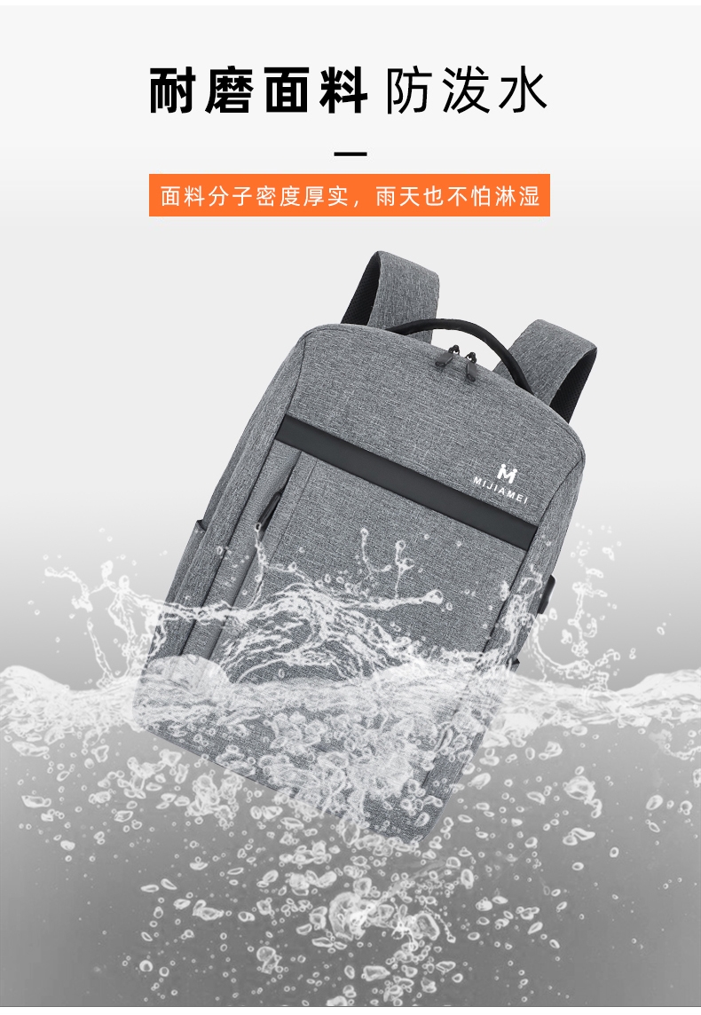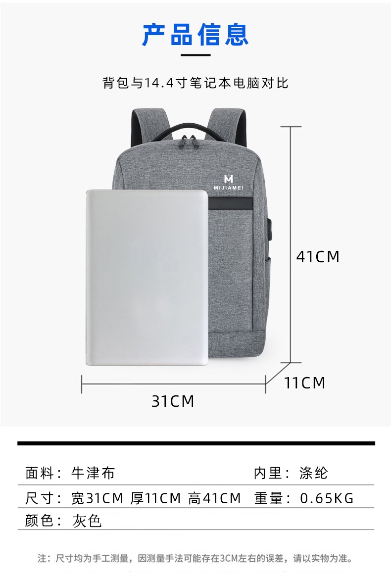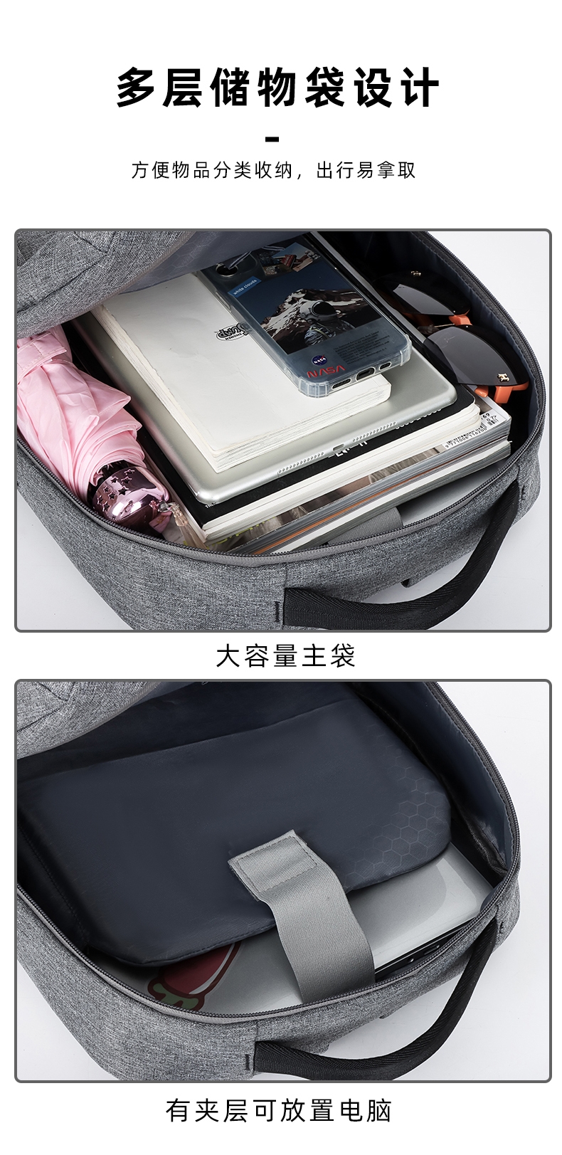 采用抗撕裂面料涤纶高弹牛津布,防泼耐磨材质;侧边配备水杯位。时尚新潮USB充电接口设计充电方便;拉杆箱固定带,轻松出行,减压利器。