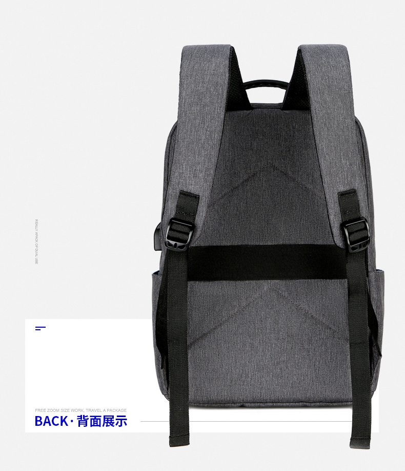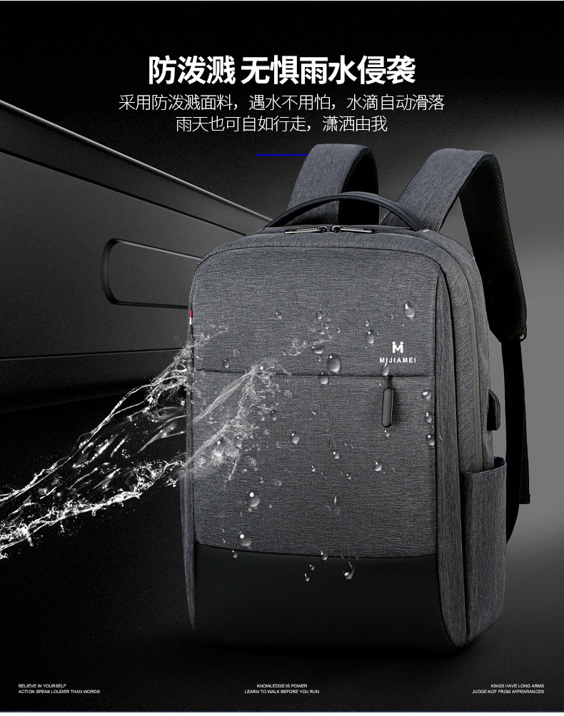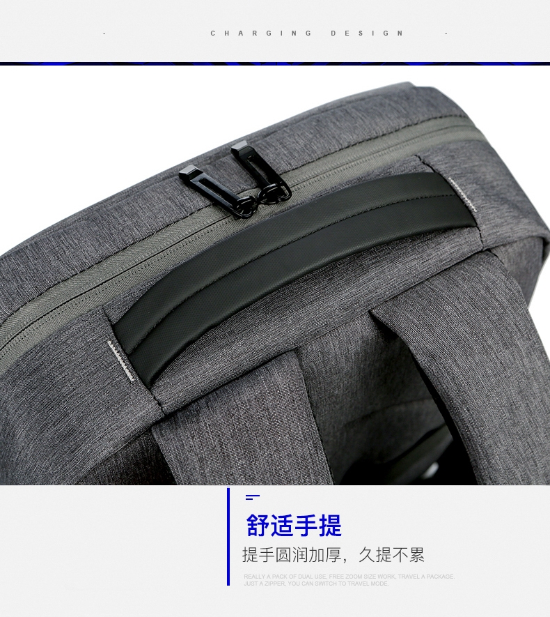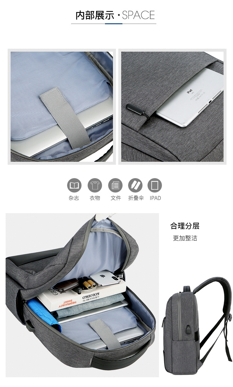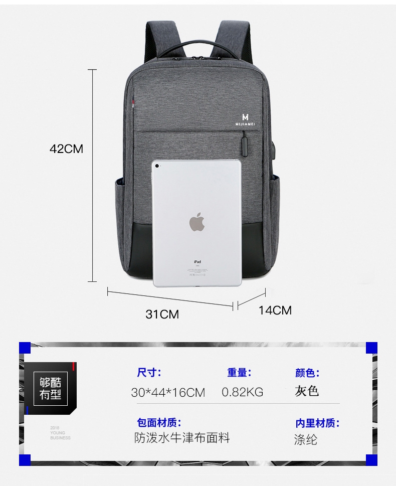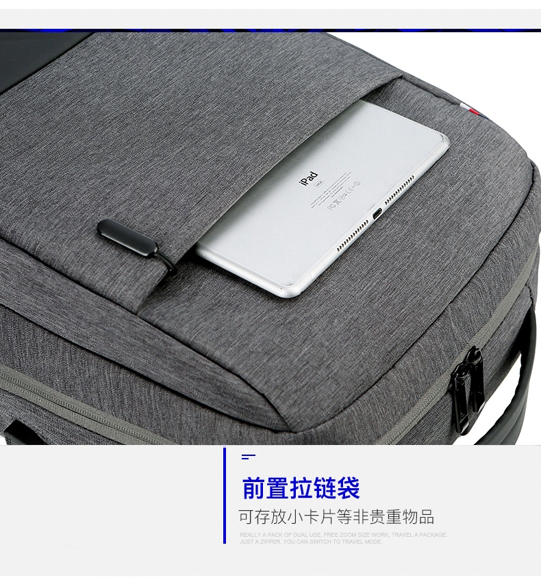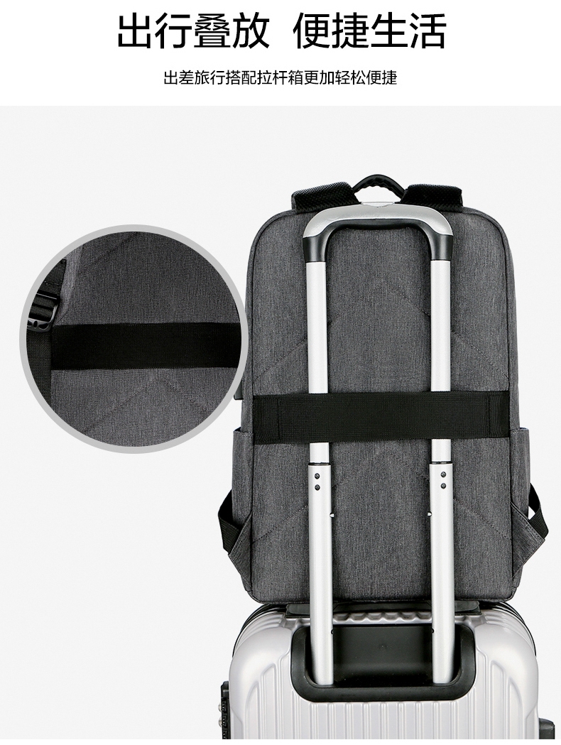 采用抗撕裂面料涤纶高弹牛津布,防泼耐磨材质;侧边配备水杯位雨伞位。时尚新潮USB充电接口;拉杆箱固定带,轻松出行,减压利器