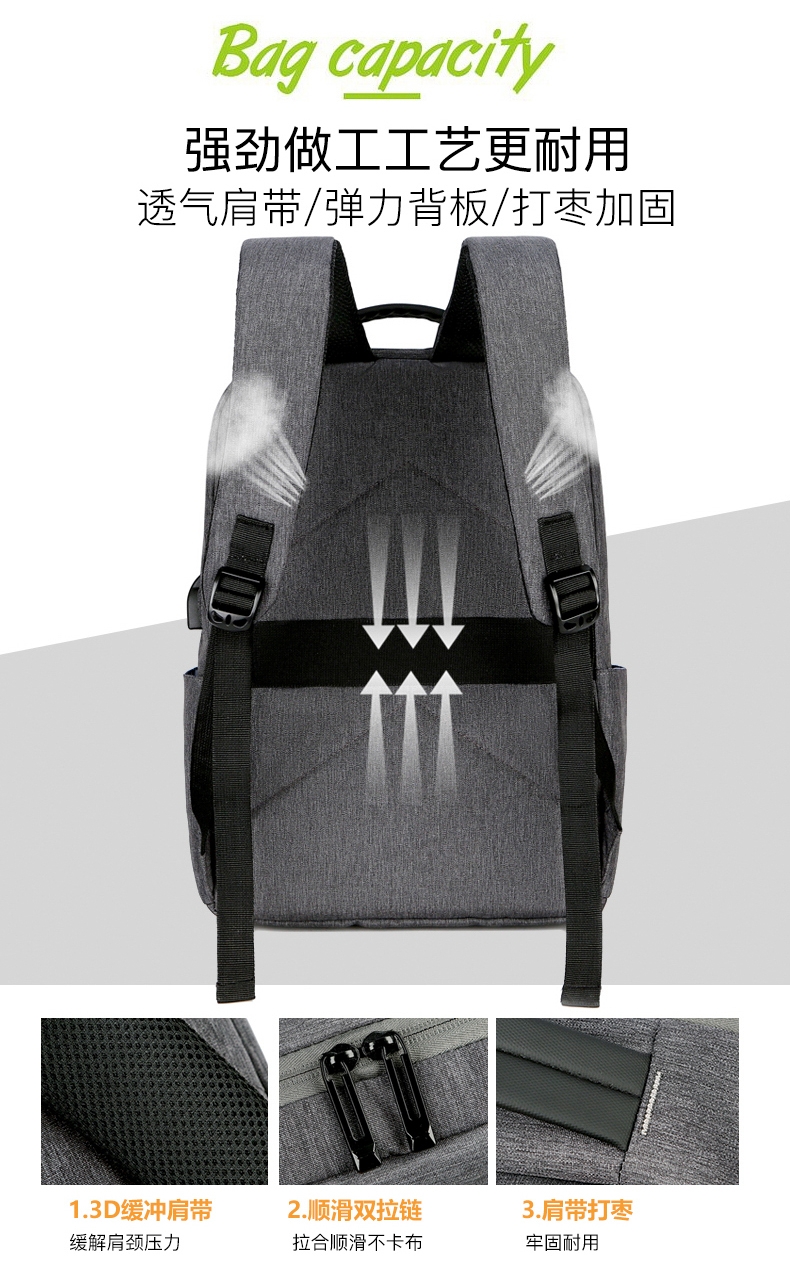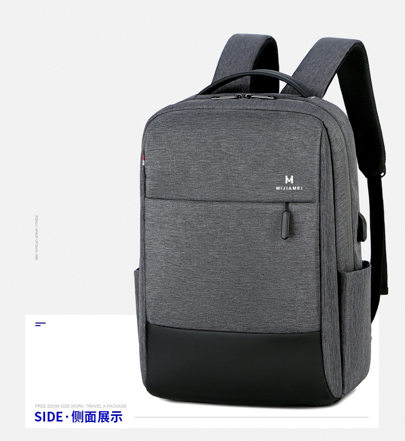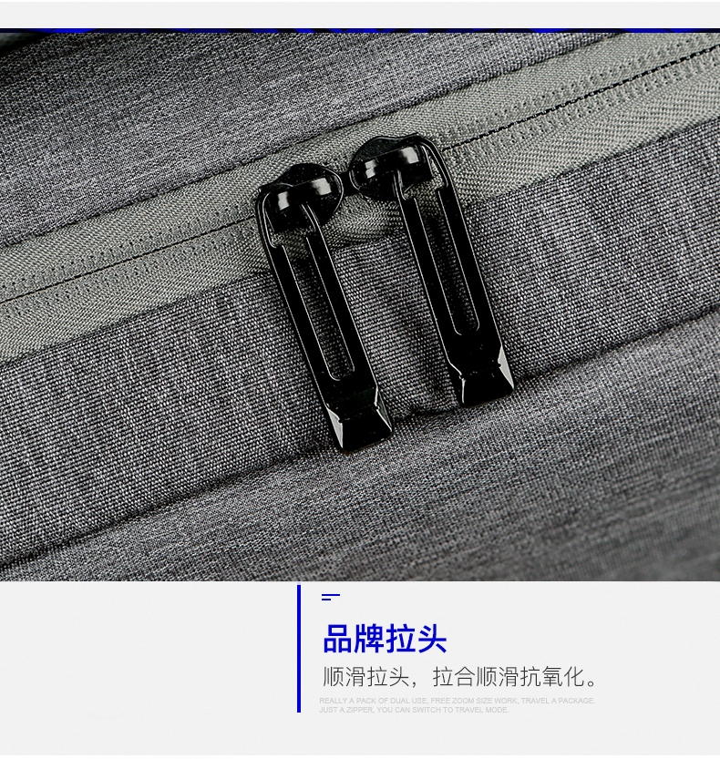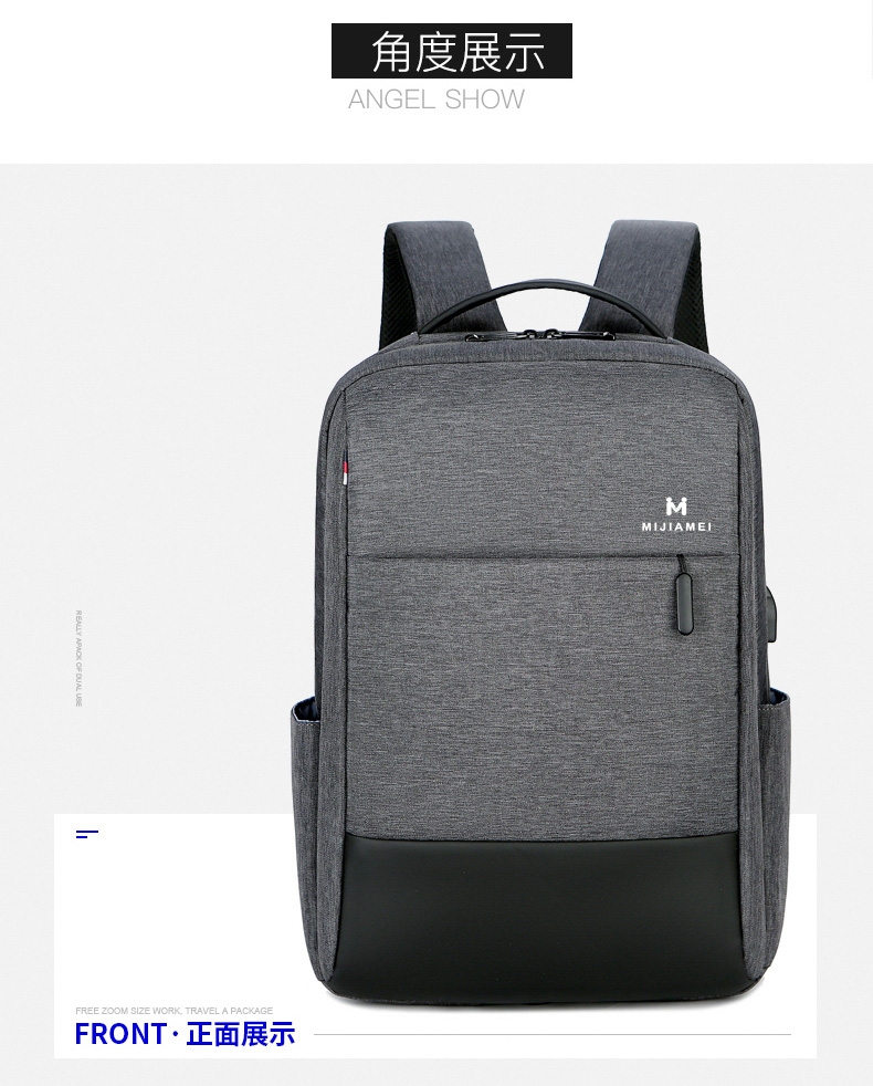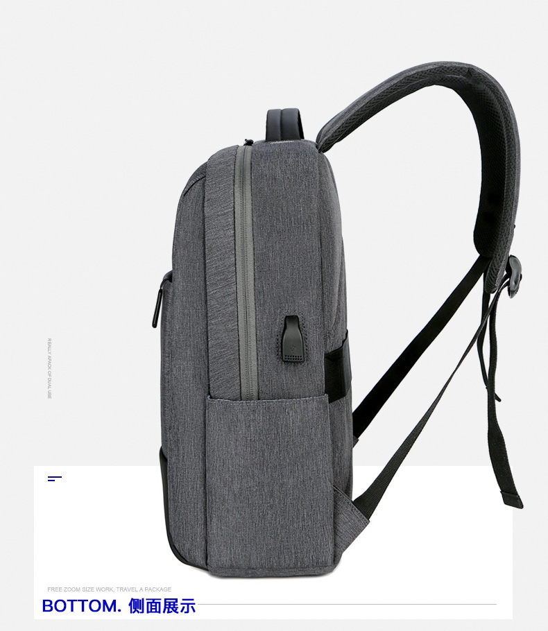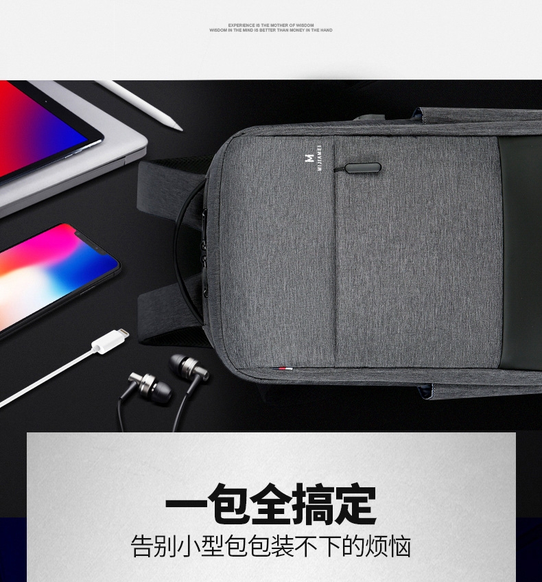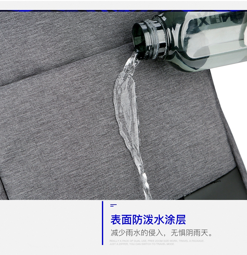 采用抗撕裂面料涤纶高弹牛津布,防泼耐磨材质;侧边配备水杯位雨伞位。时尚新潮USB充电接口;拉杆箱固定带,轻松出行,减压利器