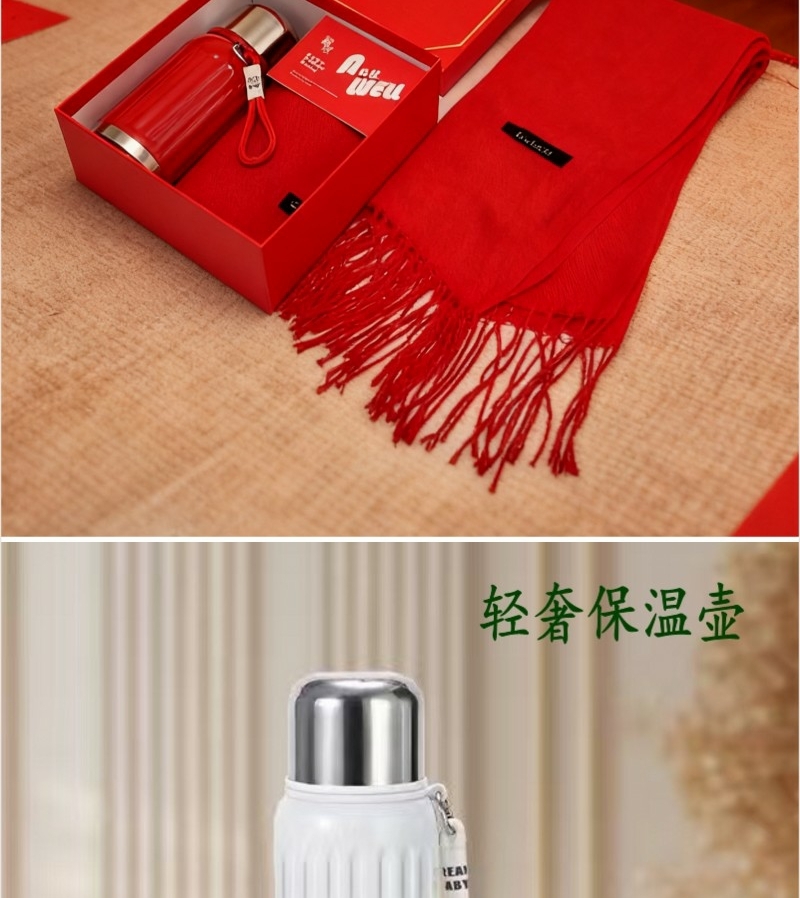轻奢保温壶靓丽外观 精品材质;围巾中国红;天地盖礼盒加手提袋设计
