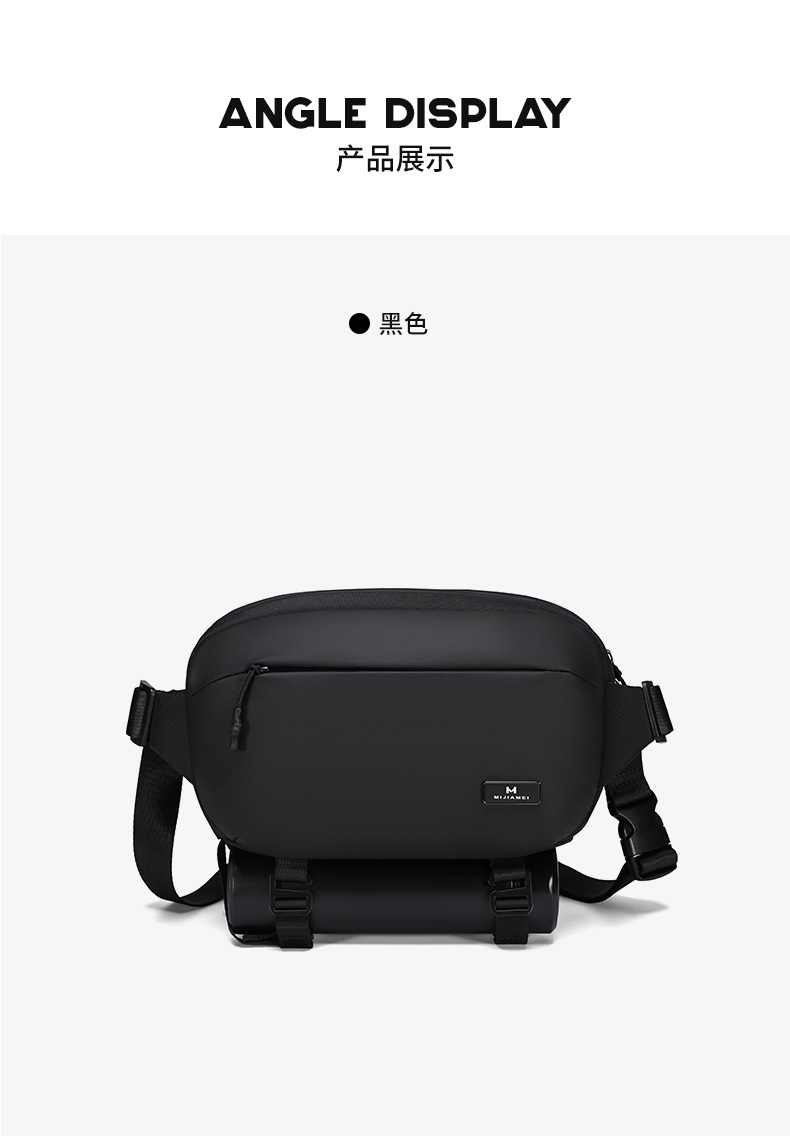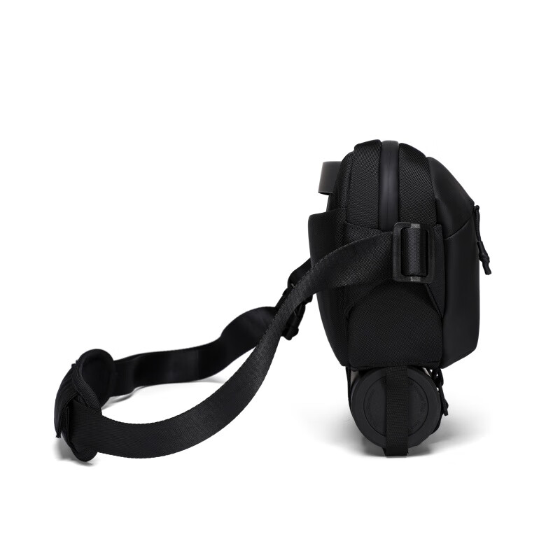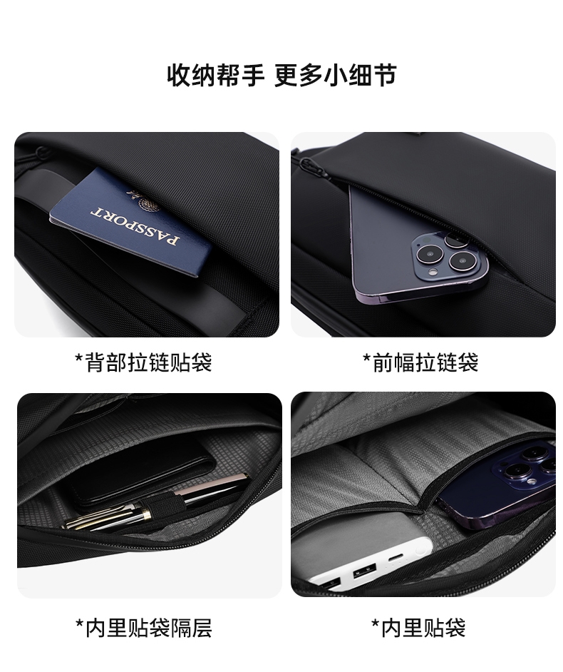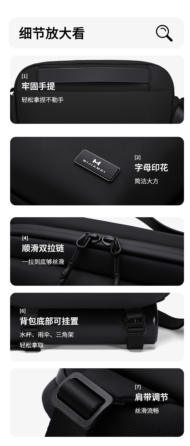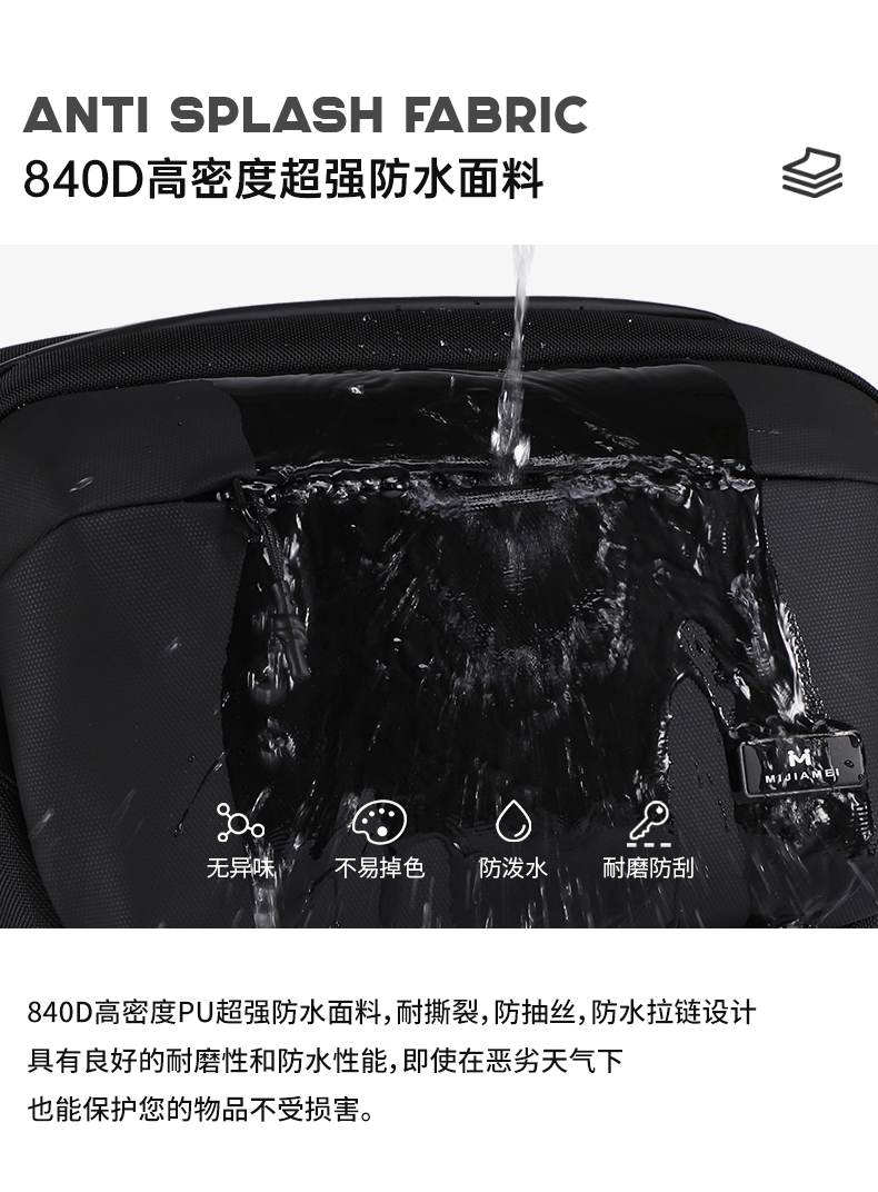 840D高密度PU超强防水面料;耐撕裂,防抽丝,防水拉链设计;底部配有织带扣,可放置水杯、雨伞
