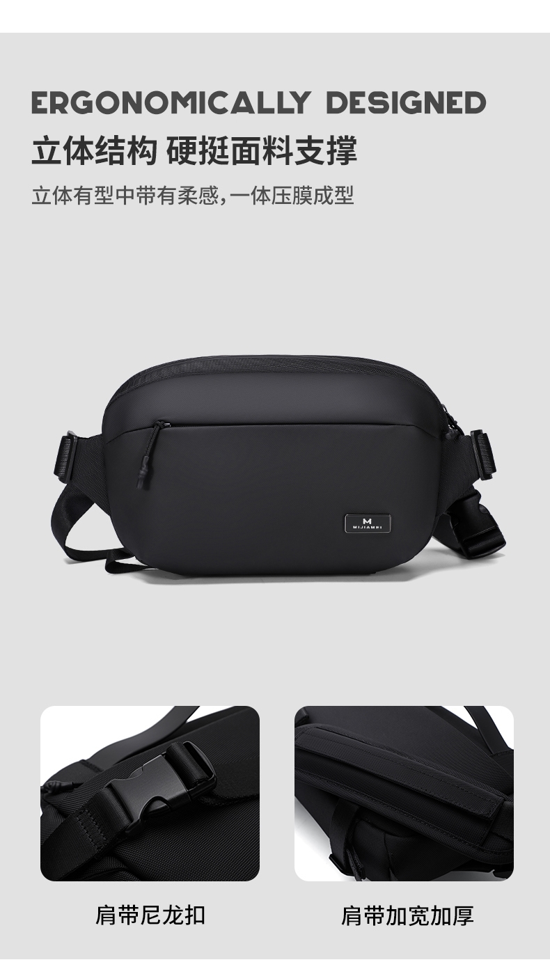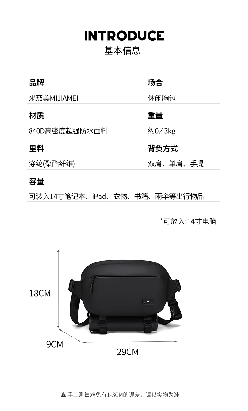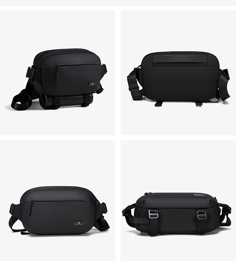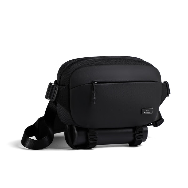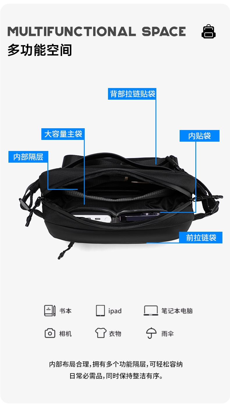 840D高密度PU超强防水面料;耐撕裂,防抽丝,防水拉链设计;底部配有织带扣,可放置水杯、雨伞