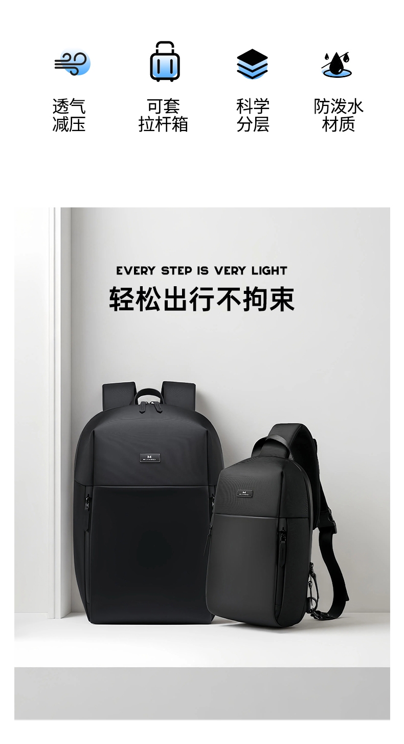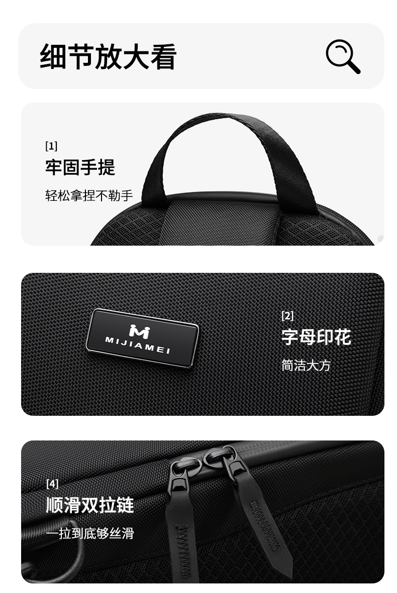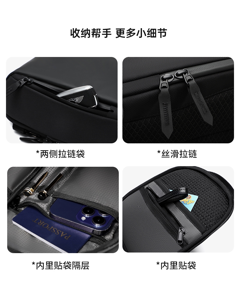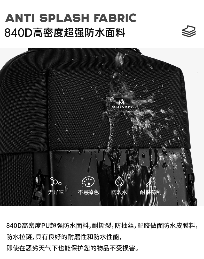 840D高密度PU超强防水面料;耐撕裂,防抽丝;配胶做面防水皮膜料,防水拉链