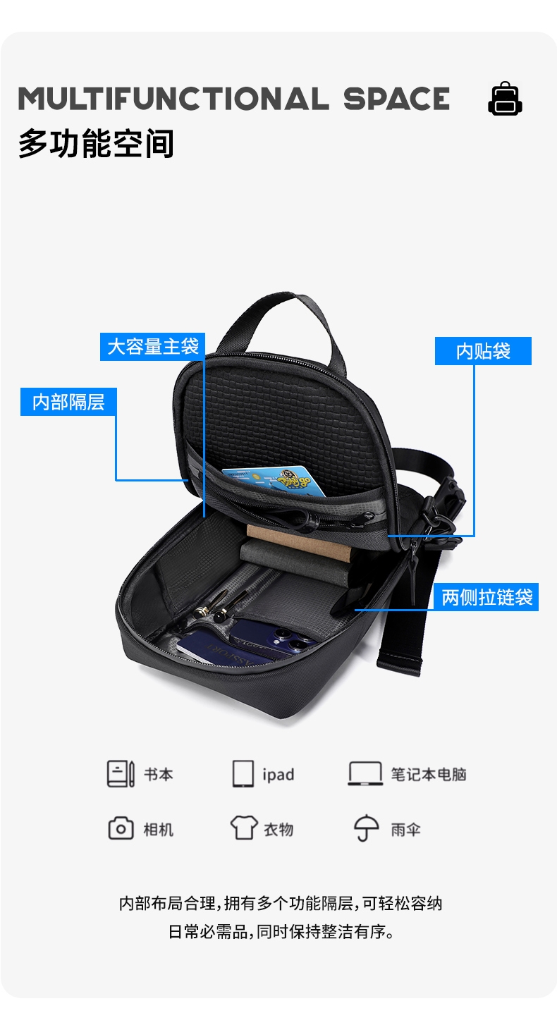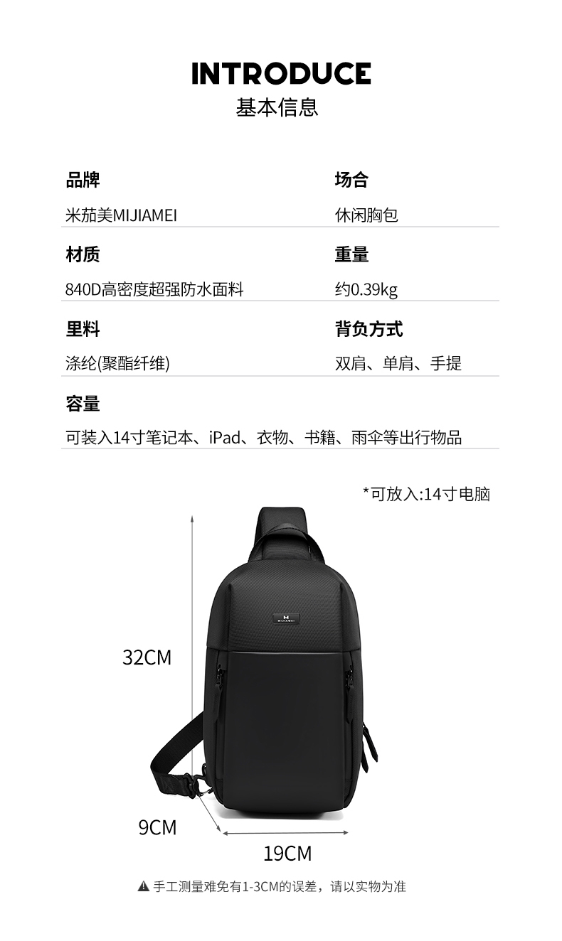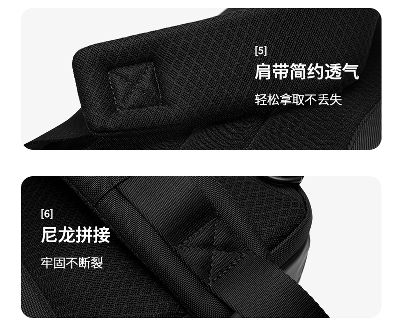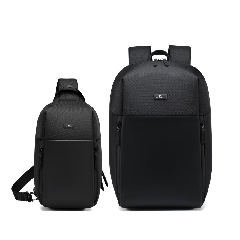 840D高密度PU超强防水面料;耐撕裂,防抽丝;配胶做面防水皮膜料,防水拉链