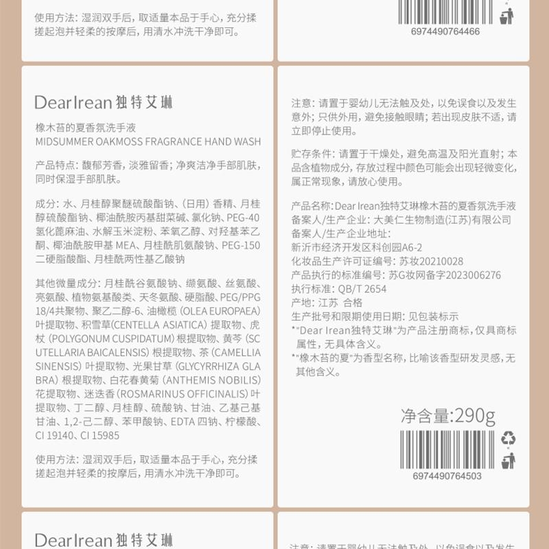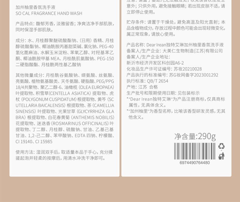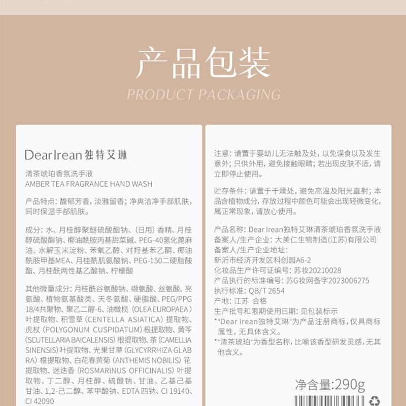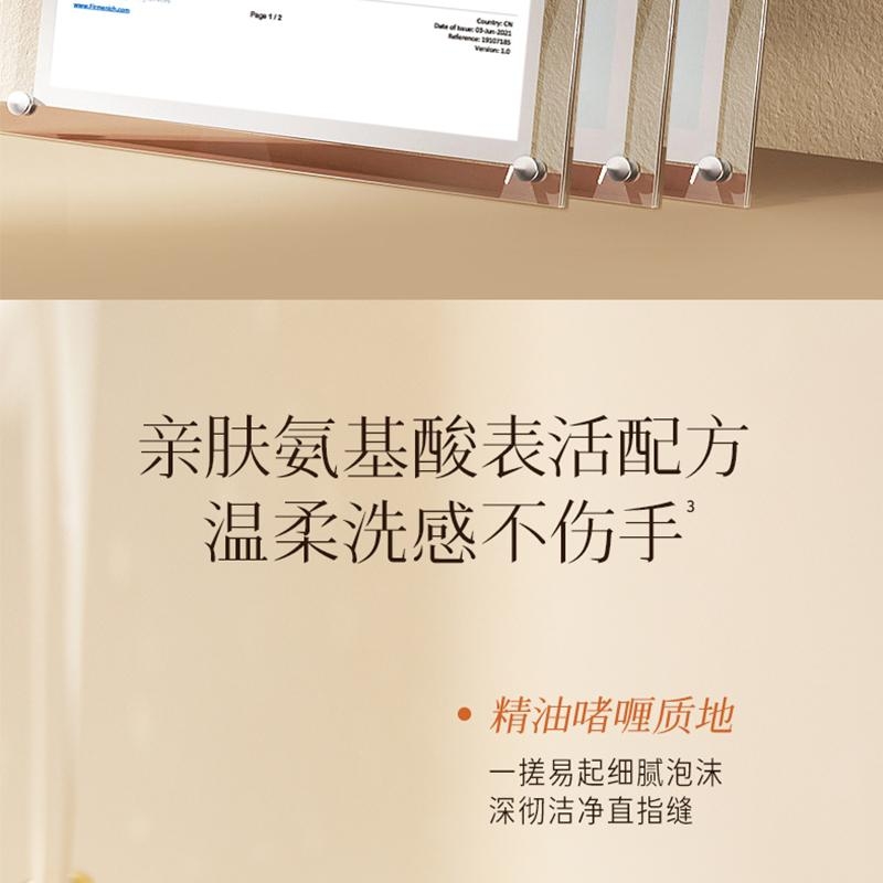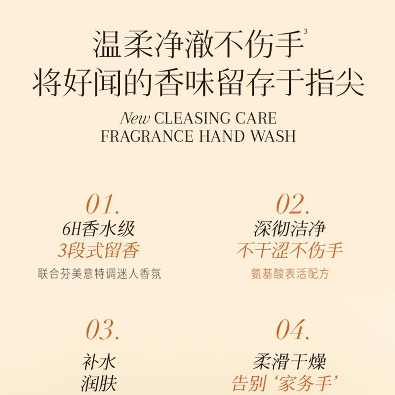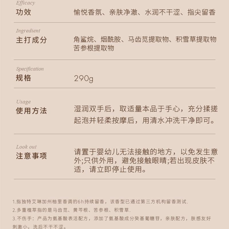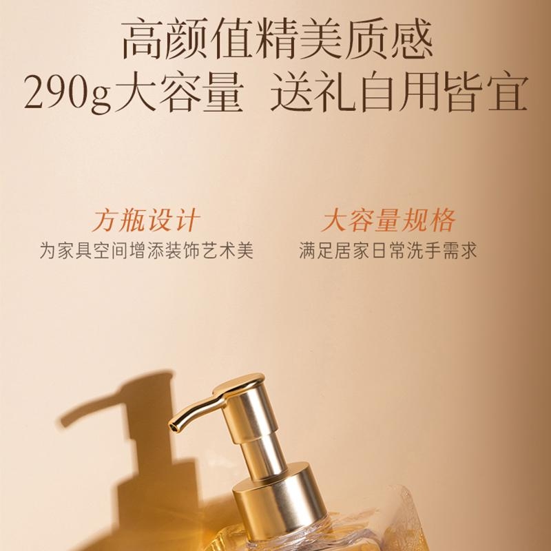 SPA级精油手护每次洗手都是香氛之旅;亲肤氨基酸表活配方温柔洗感不伤手绵密泡沫一冲即净;高级轻奢质感送礼自用皆宜打造精致的生活仪式感
