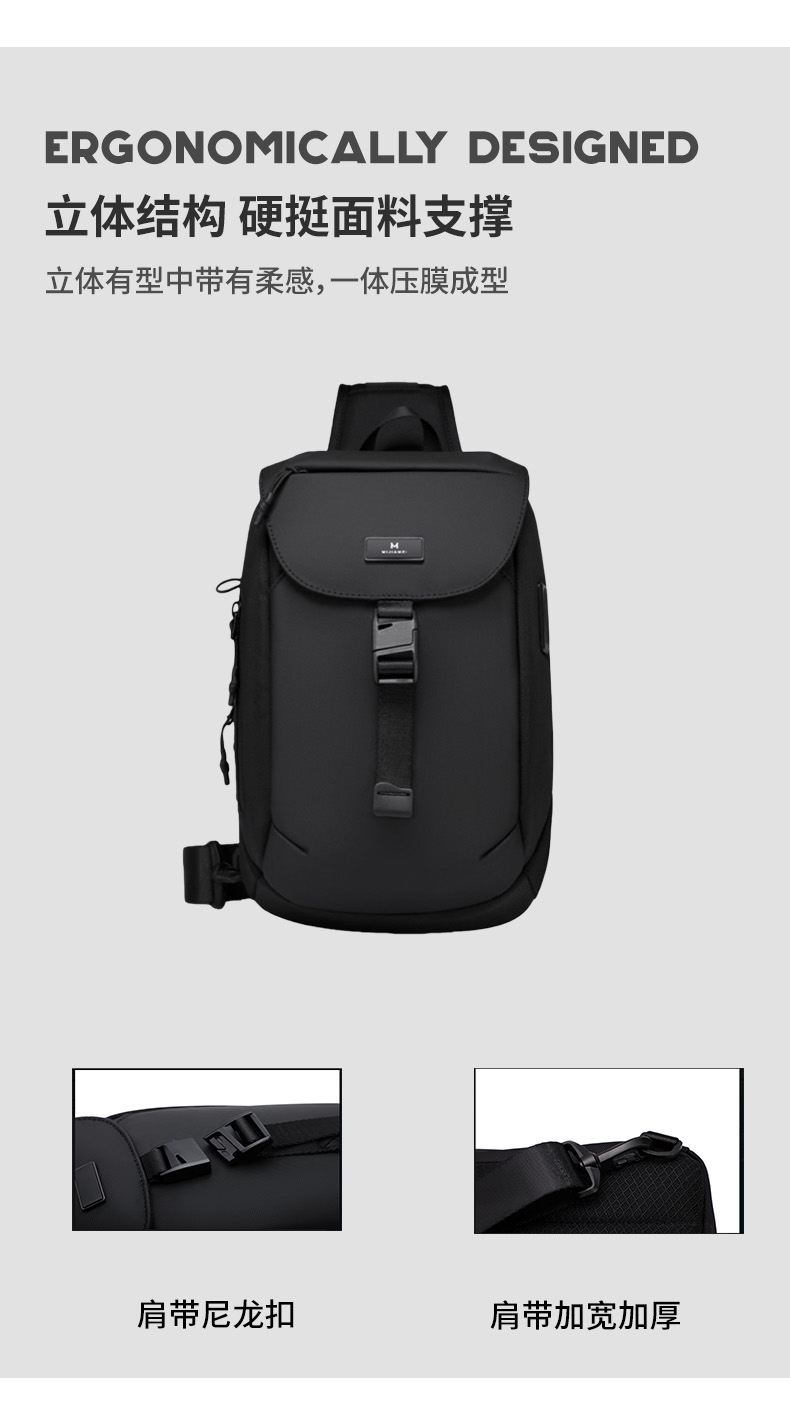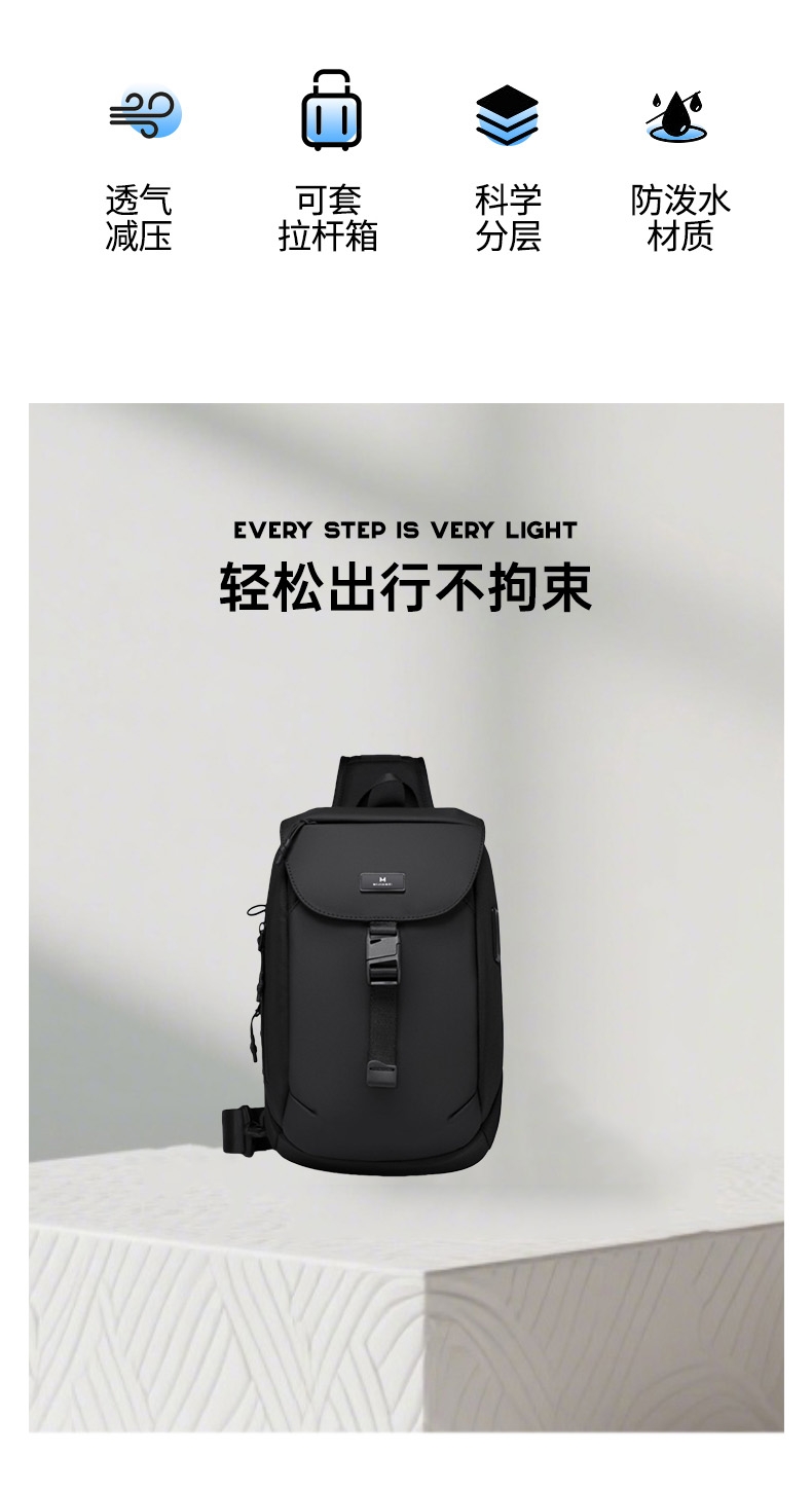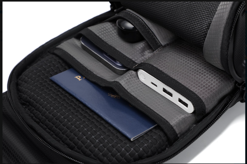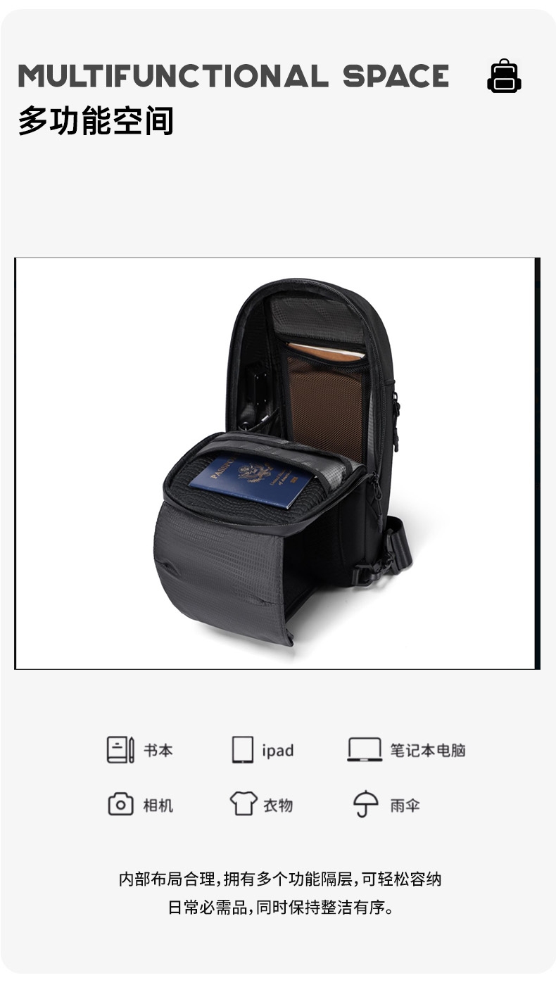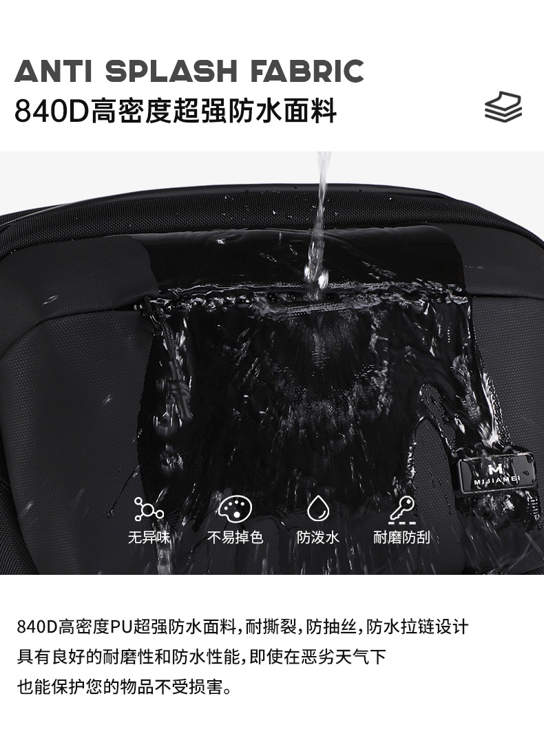840D高密度PU超强防水面料;耐撕裂,防抽丝,配胶做面防水皮膜料,防水拉链;USB/TYPE C充电接口