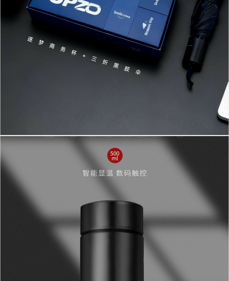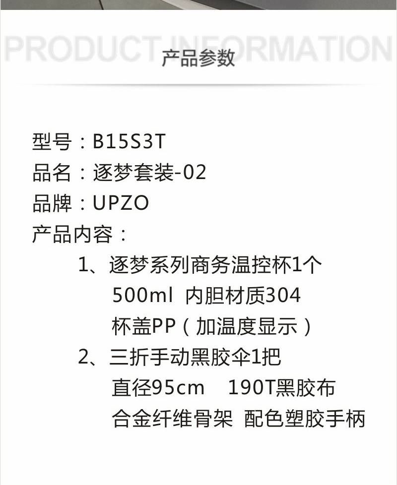 手动三折伞 黑胶面料 95直径 逐梦主题融入;保温杯带温度显示 304内胆 逐梦主题融入;主题套装礼盒融入设计 商务风