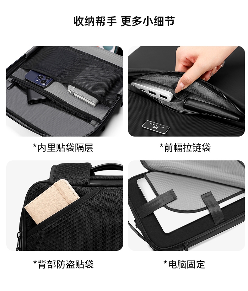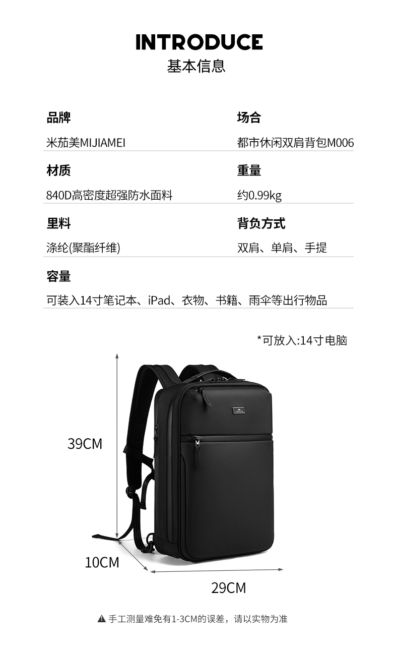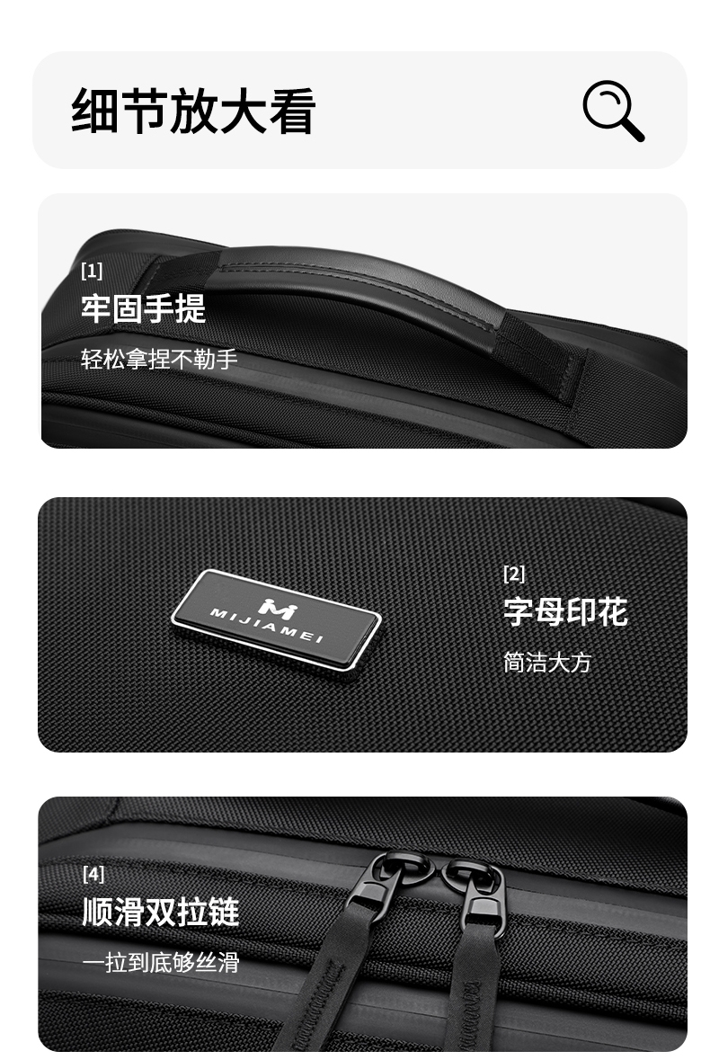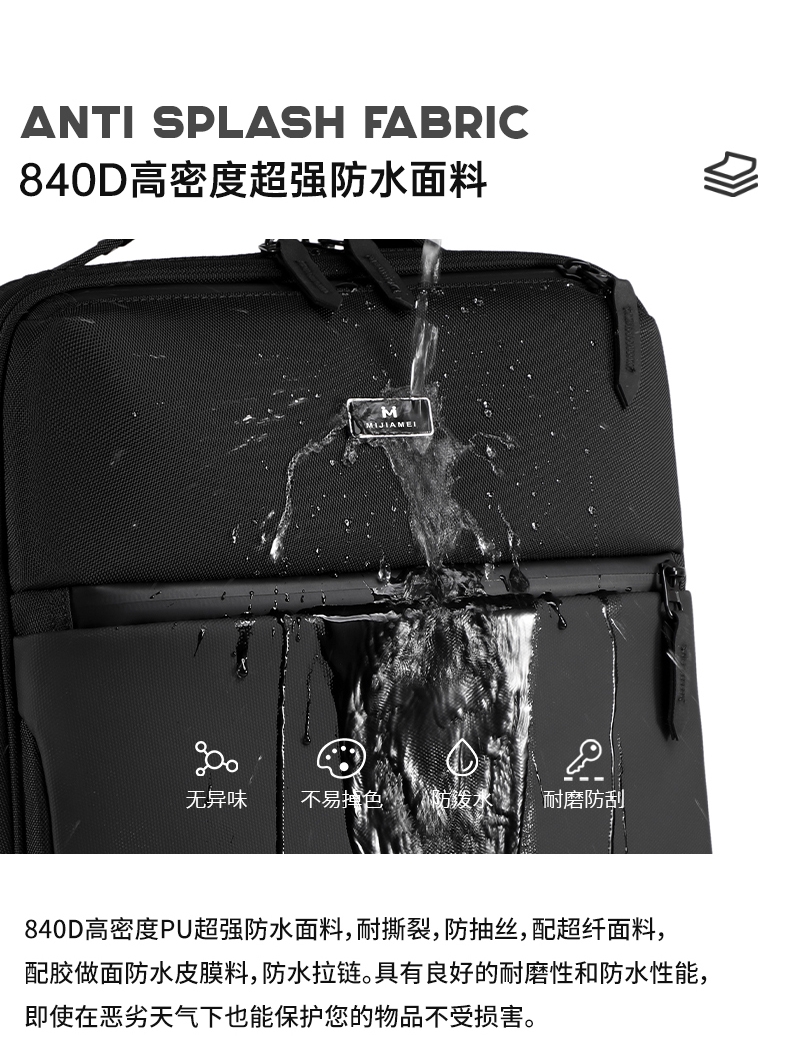 840D高密度PU超强防水面料;耐撕裂,防抽丝,配超纤面料;配胶做面防水皮膜料,防水拉链
