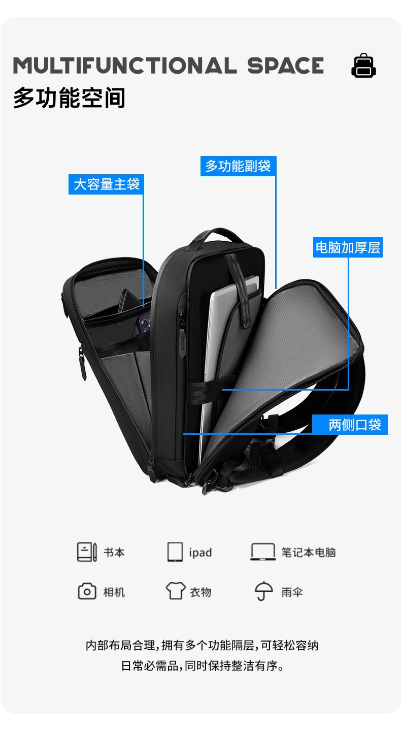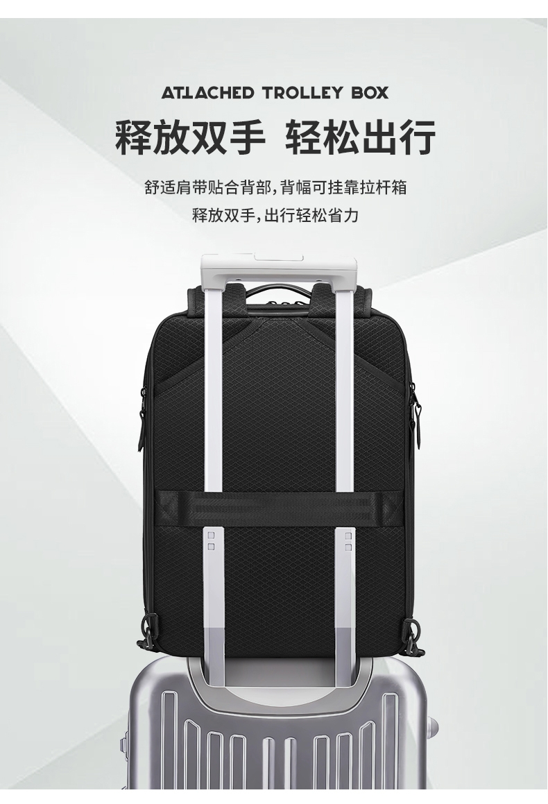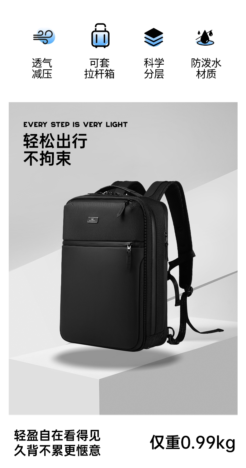 840D高密度PU超强防水面料;耐撕裂,防抽丝,配超纤面料;配胶做面防水皮膜料,防水拉链