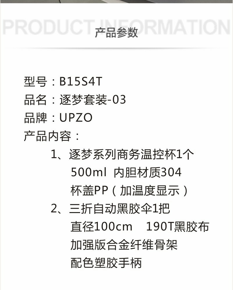 自动伞材质全面升级 防风型设计 逐梦主题融入;保温杯500毫升 304内胆 逐梦主题融入;逐梦主题套装 天地盖礼盒加手提袋