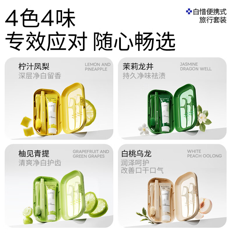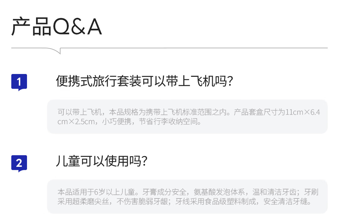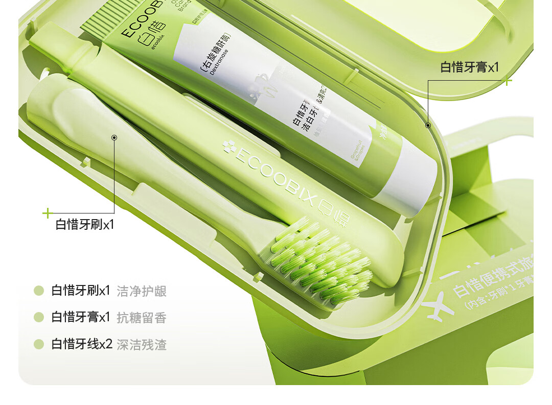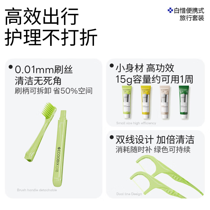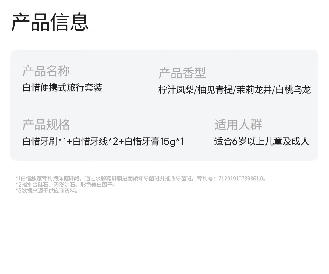 配置清单:便携式旅行装*1(牙刷*1+15g牙膏+牙线*2)