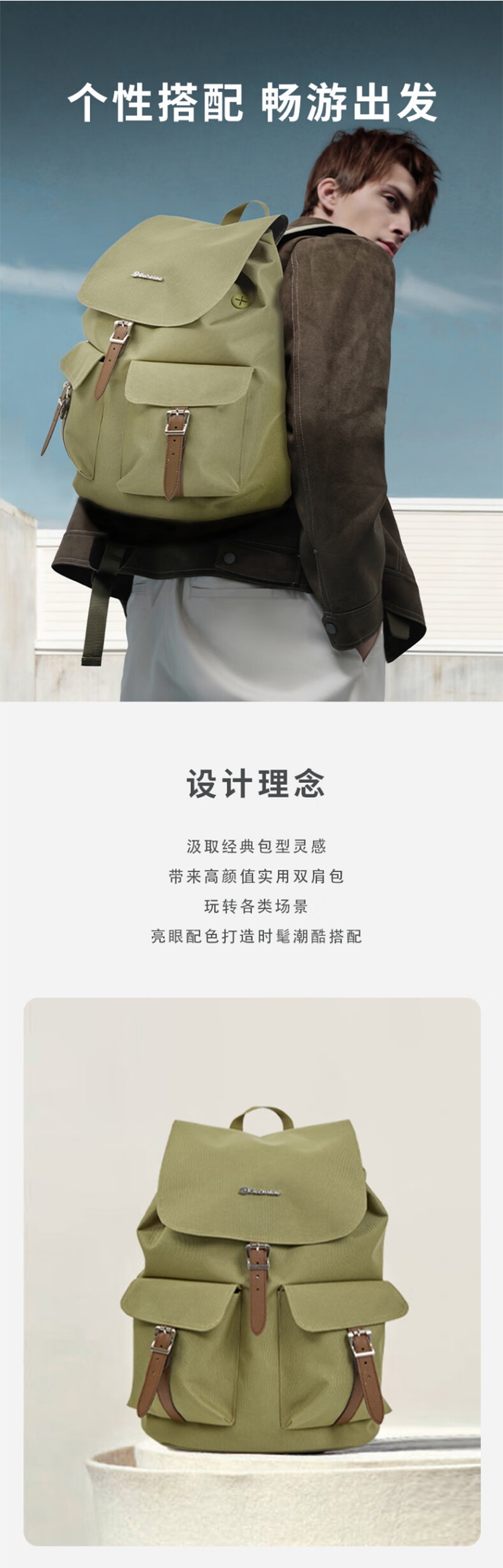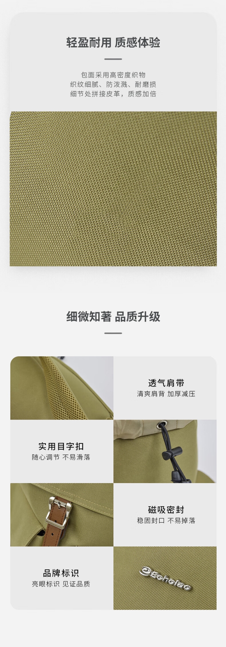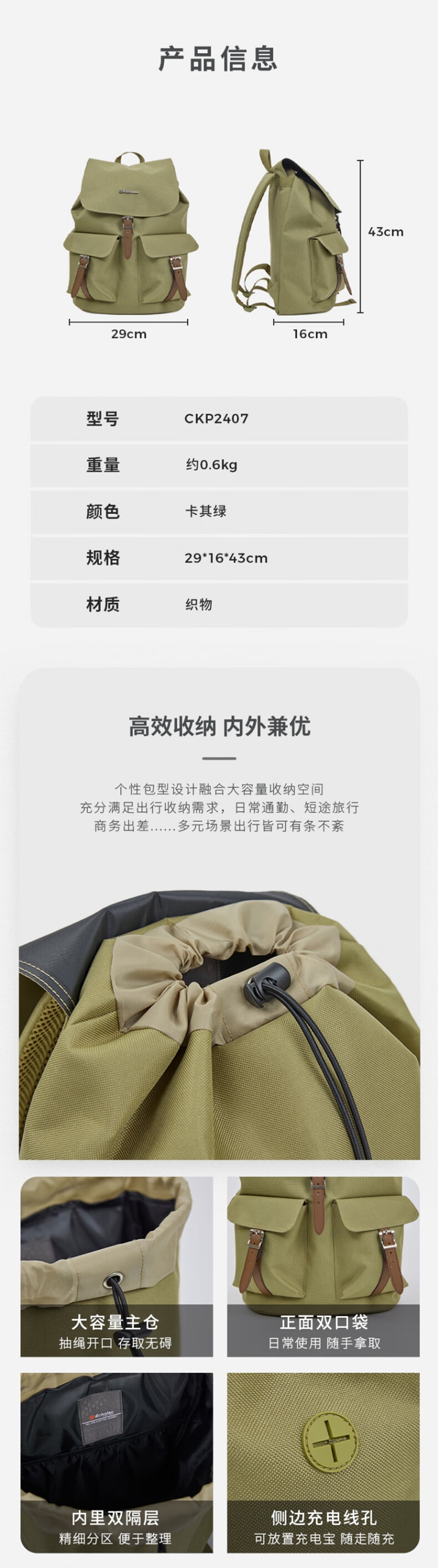 包面采用高密度织物,防泼溅、耐磨损。;大容量主仓,抽绳开口,存取便捷;面充电线孔,可放置充电宝,随走随充