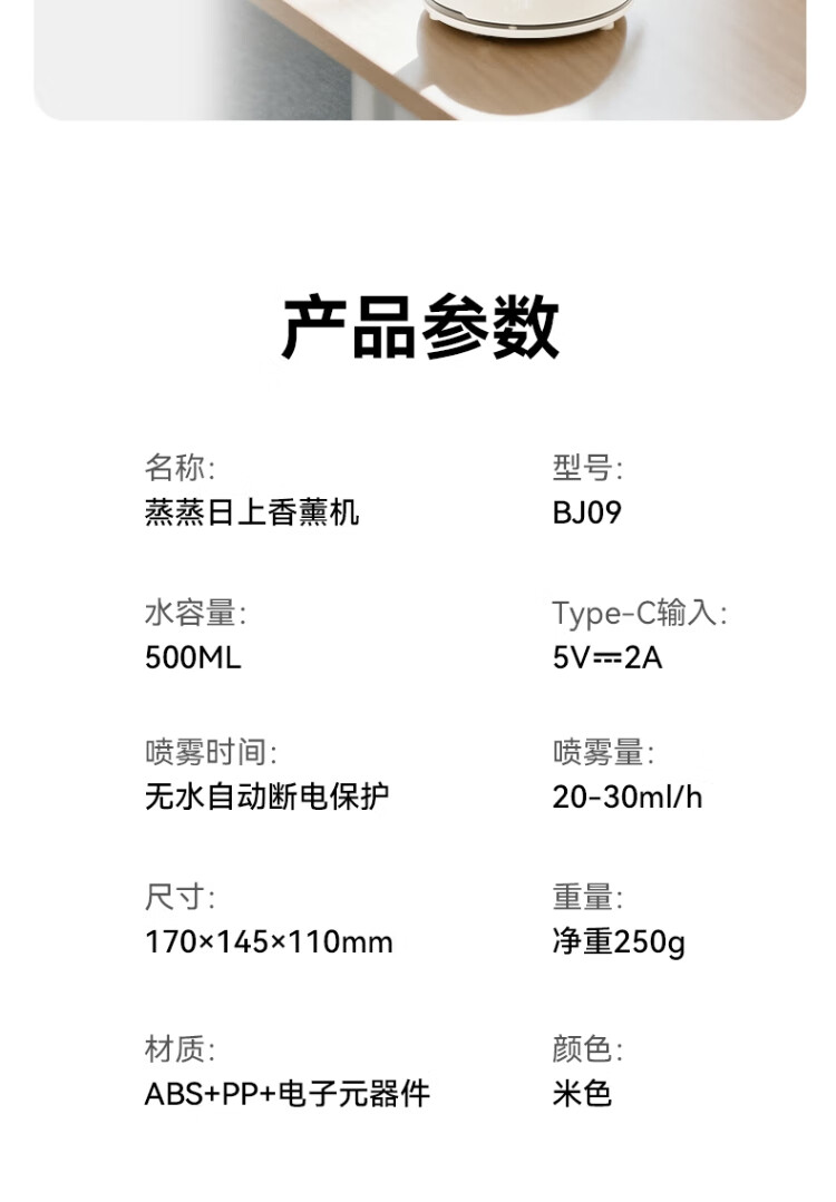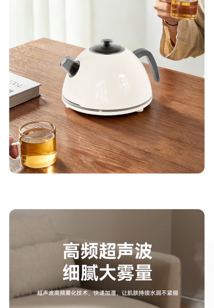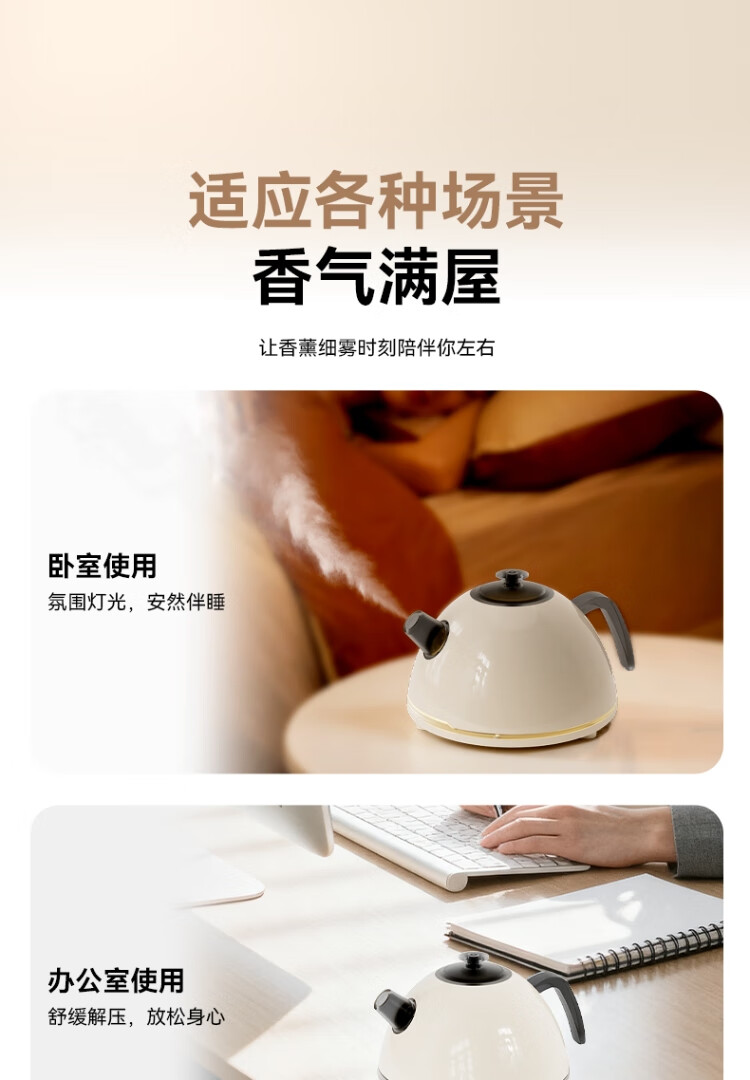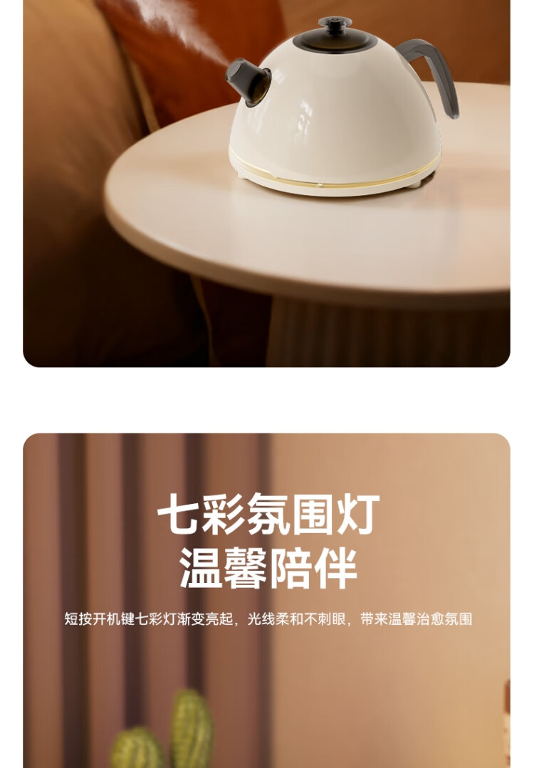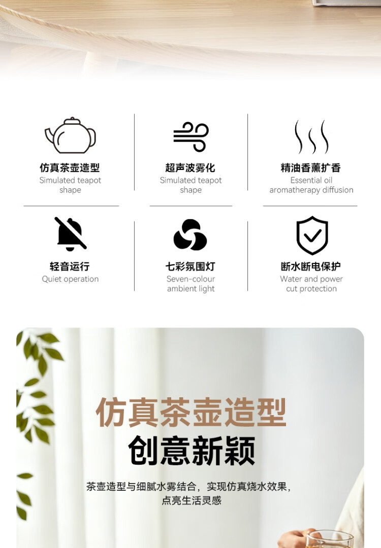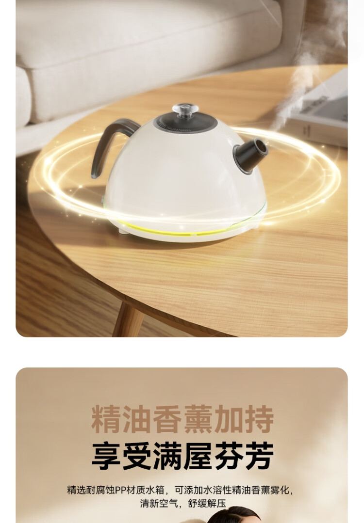 仿真烧水效果,七彩灯光效果 ;PP材质水箱可添加水溶性精油香薰雾化;彰显品质;灯光定色模式可调节