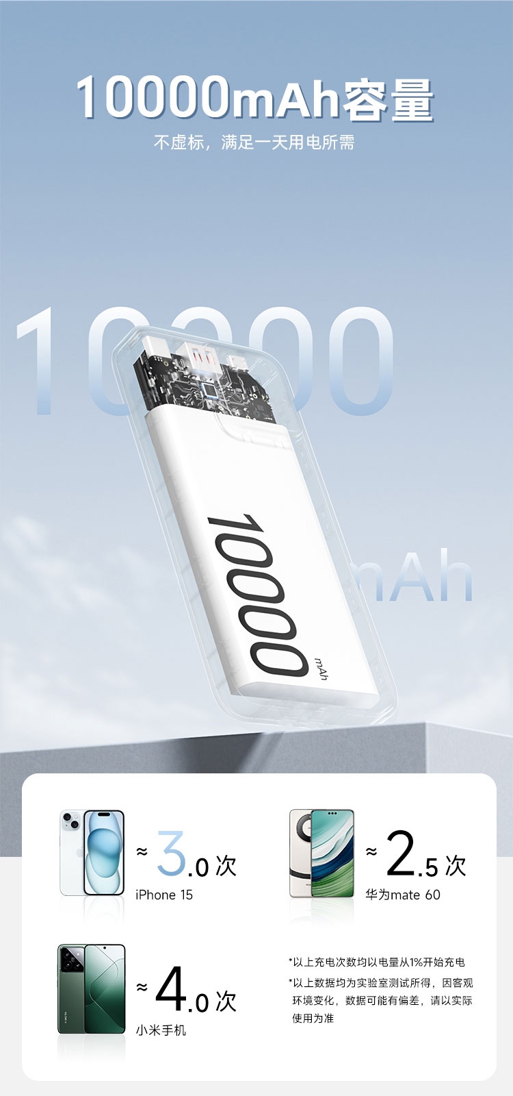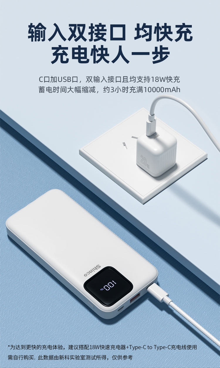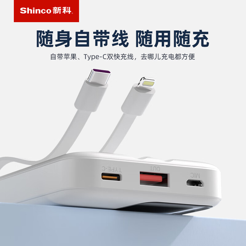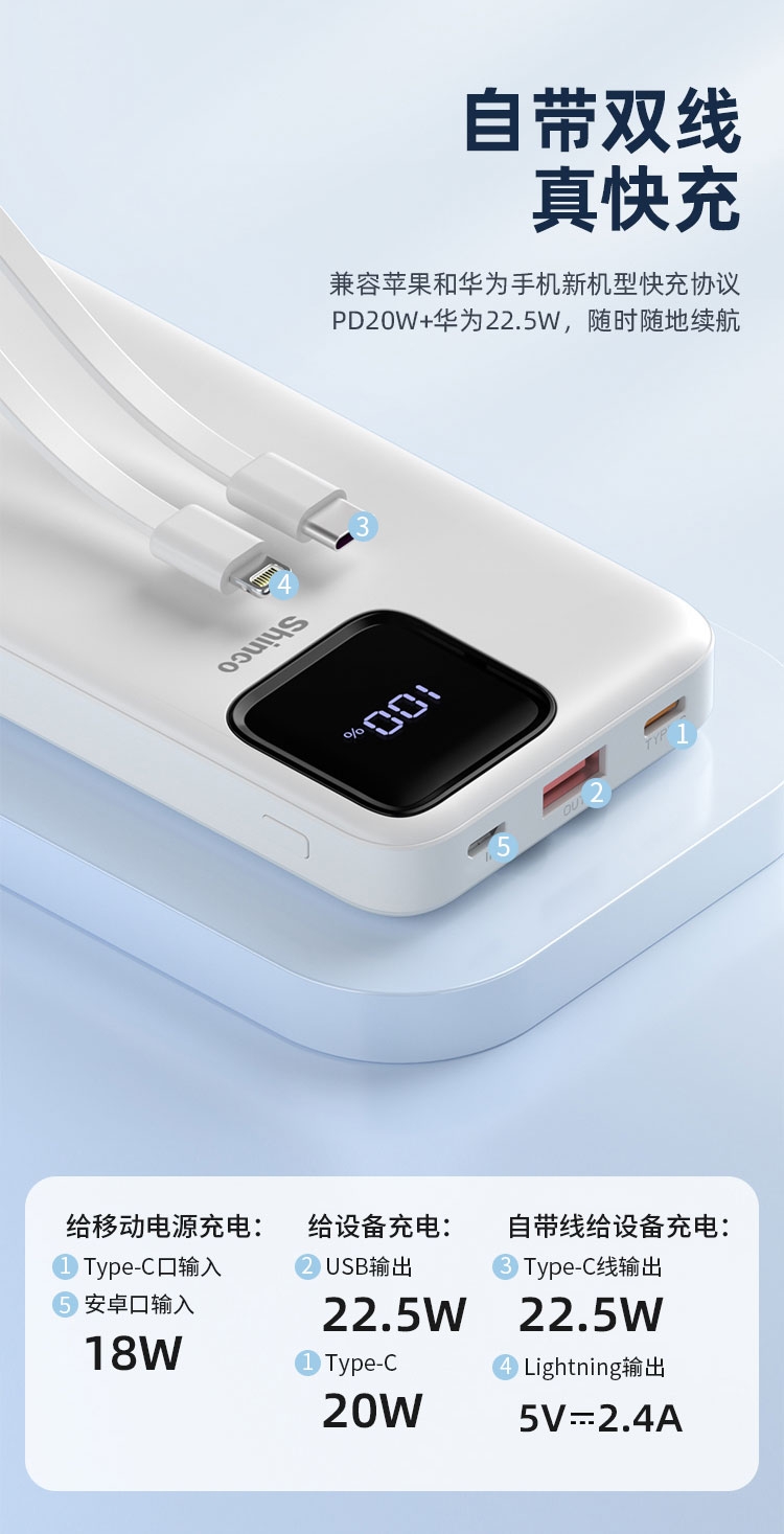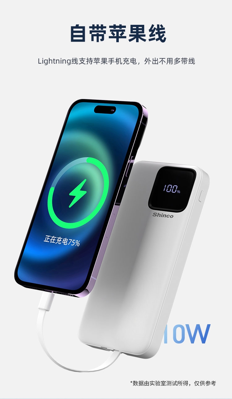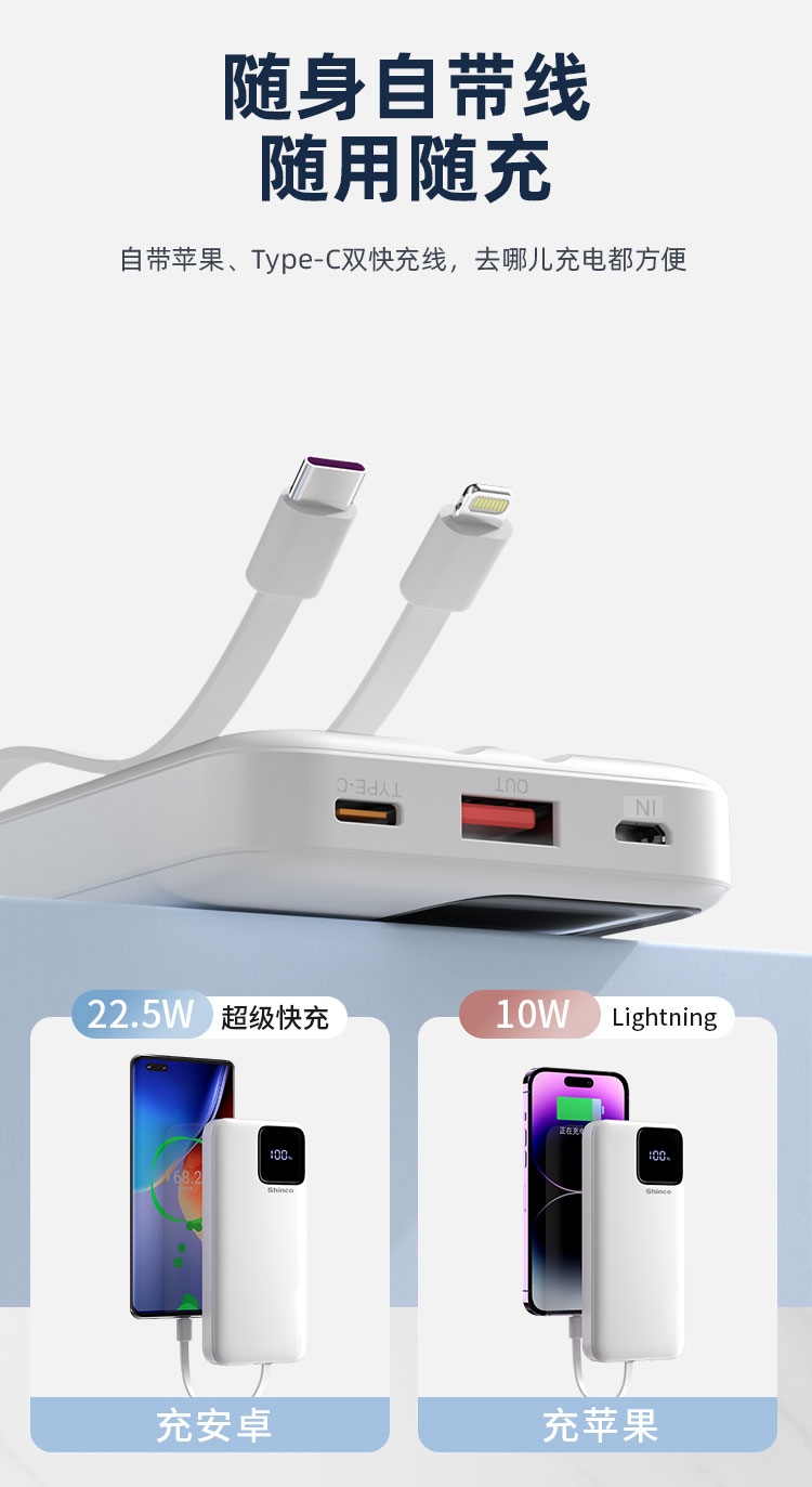 随身自带线 、充电很方便 ;大容量 10000mAh 、持久续航;支持18W双向快充,蓄电时间大幅缩减