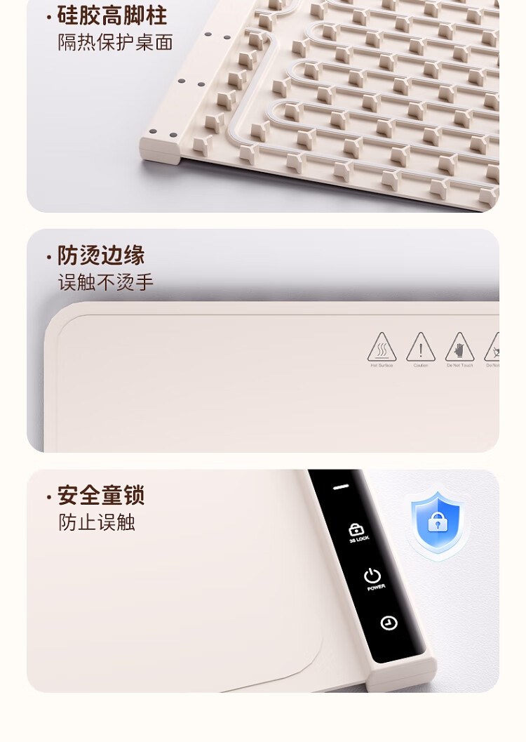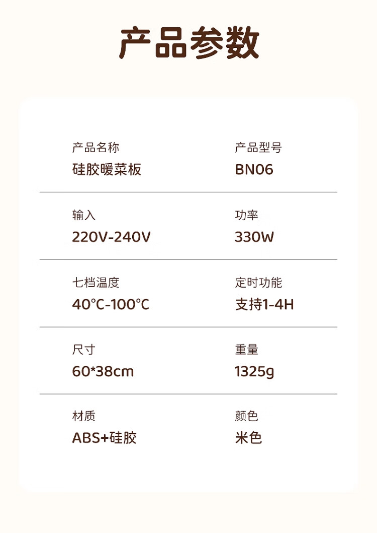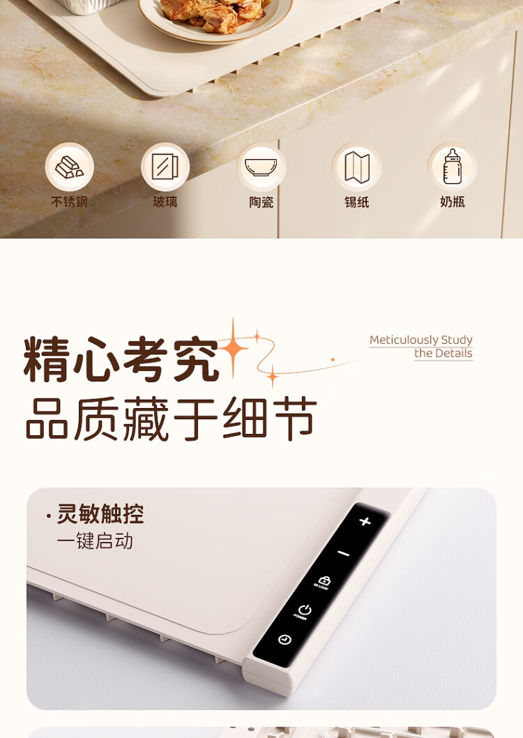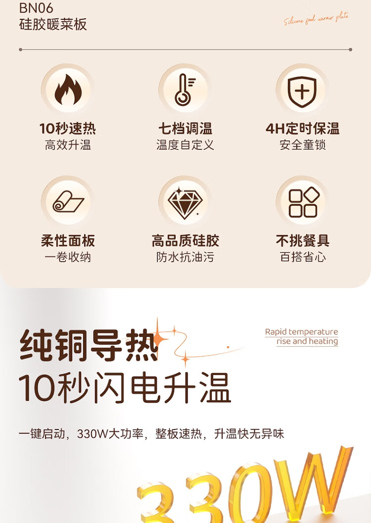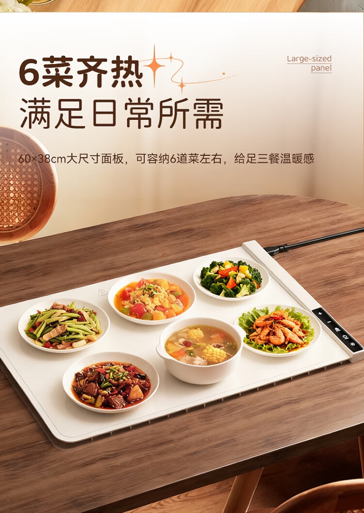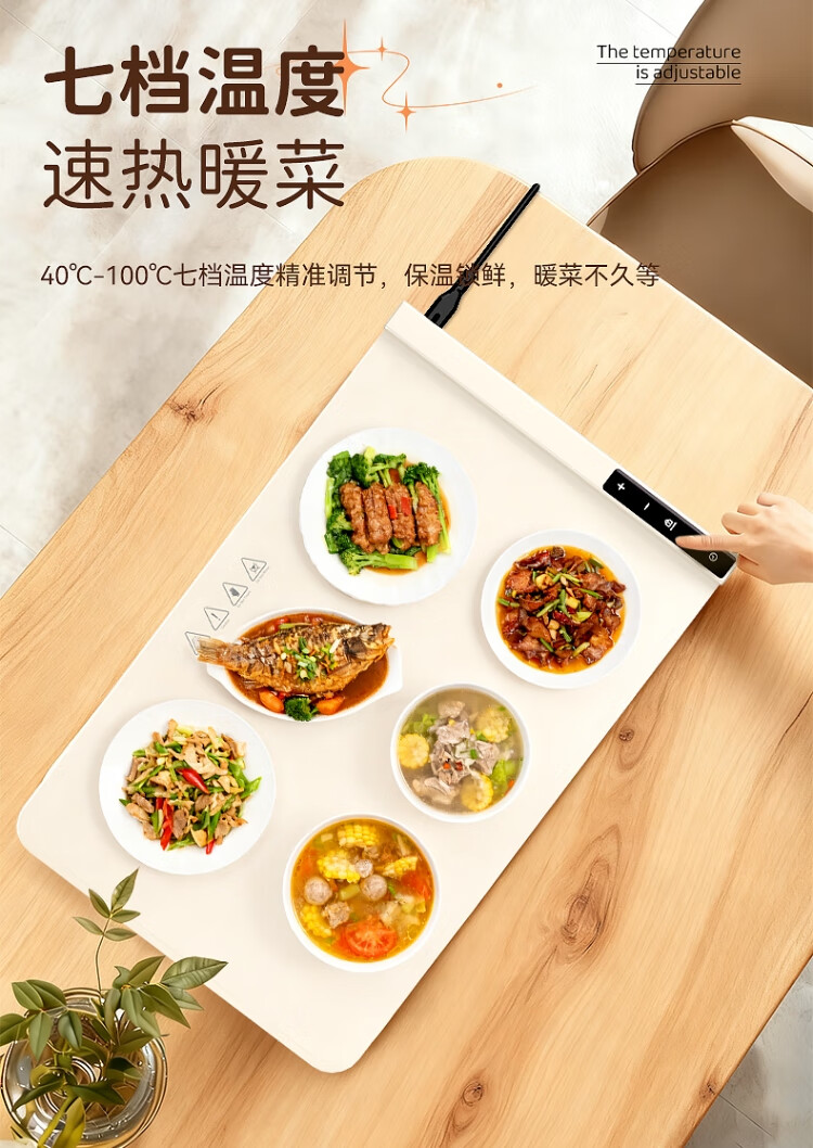 7档调温,定时通缩,整板速热,灵敏触控;发热铜线,10秒升温,速热锁温,升温无异味;1-4小时智能定时保温
