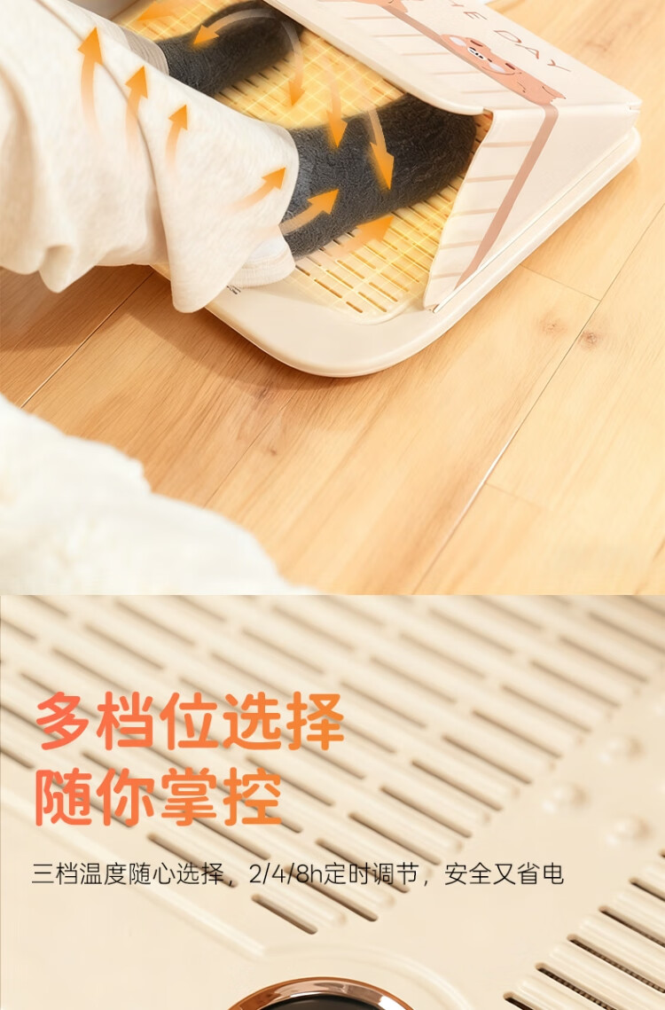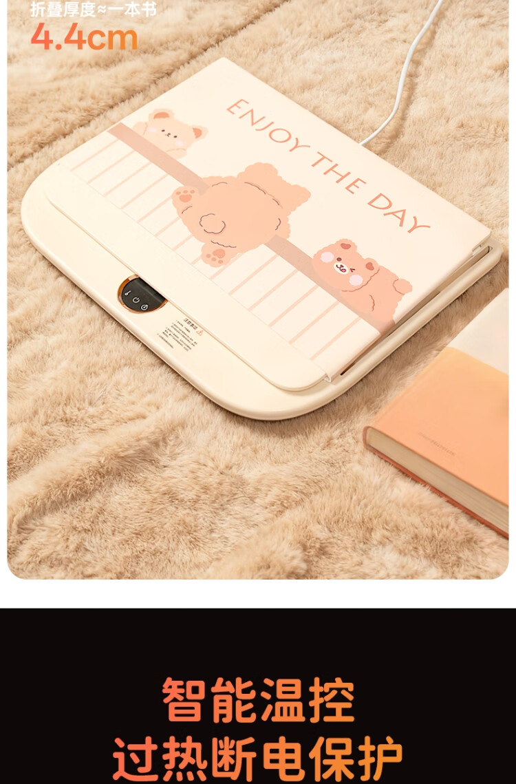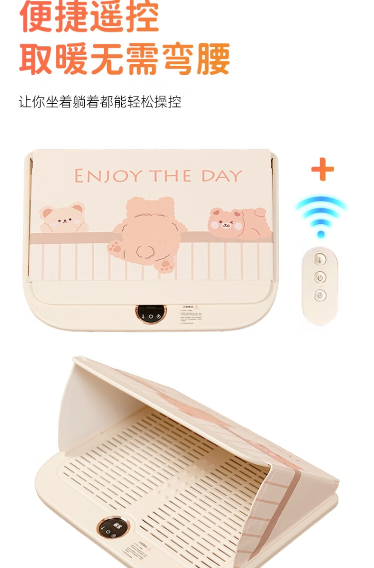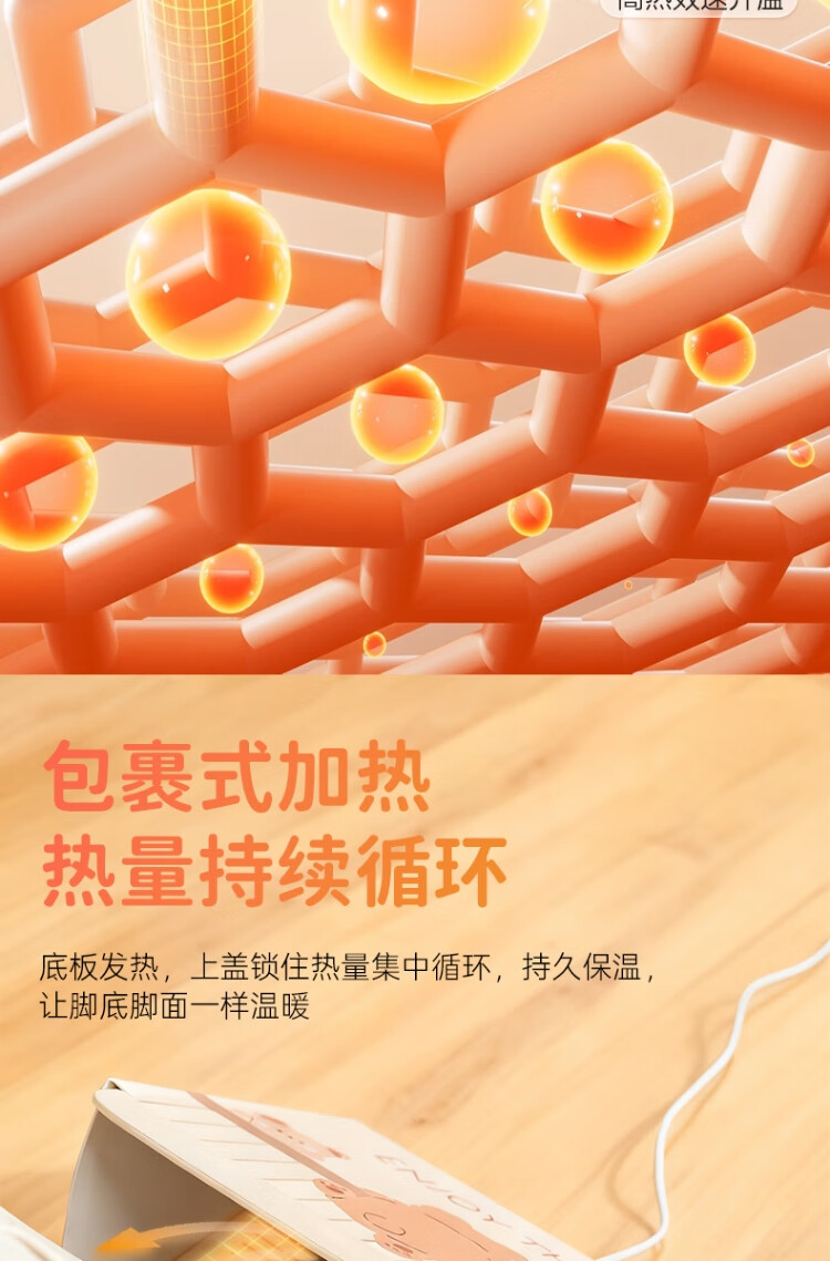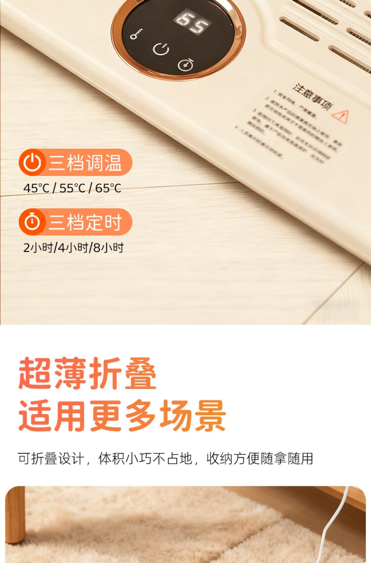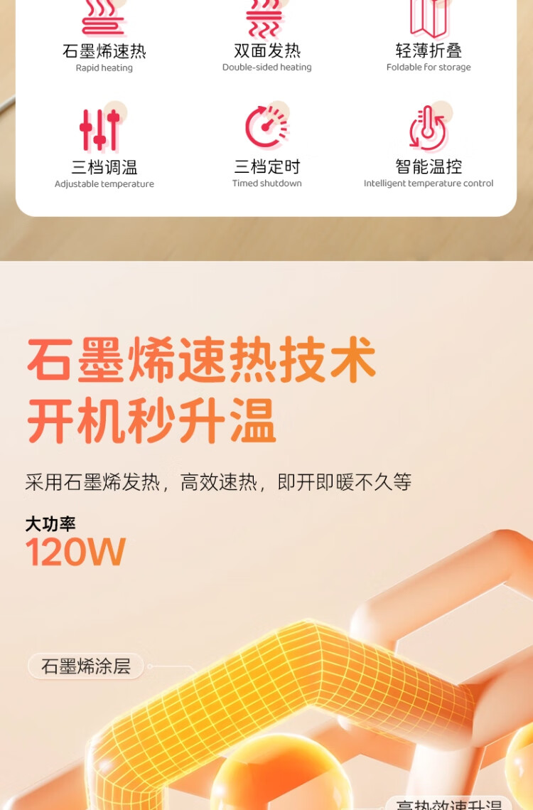 阻燃材料,石墨烯1S速热,快速温暖,上下双面发热;脚底脚面一样暖,智能温控,不烫脚,超薄折叠;0.1度/小时,带遥控器,操作更便捷