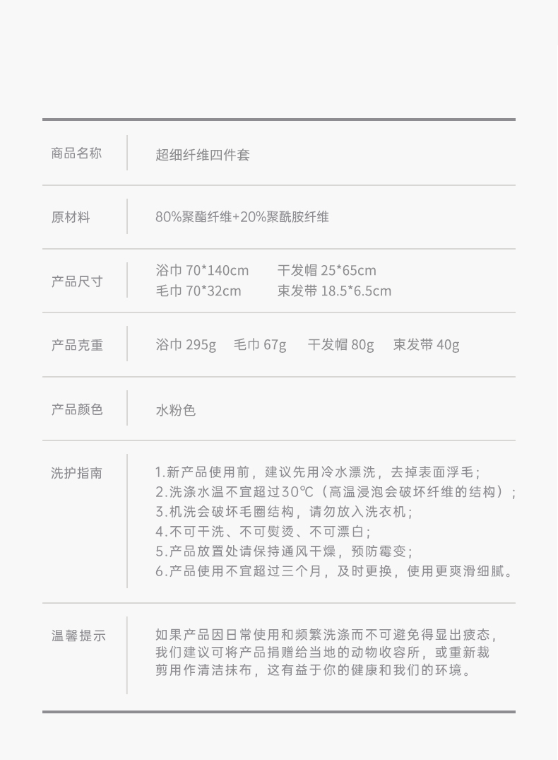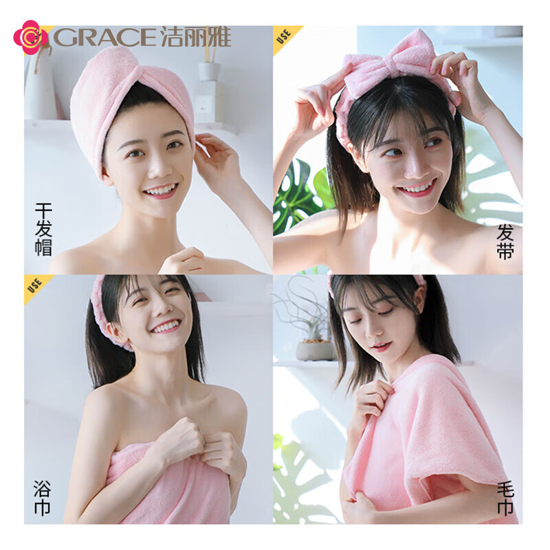 毛巾+浴巾+干发帽+束发带*1包;优选细级纤维面料 吸水性强 更柔软;匠心锁边 品质标准