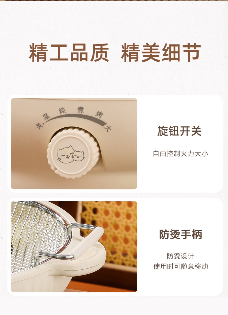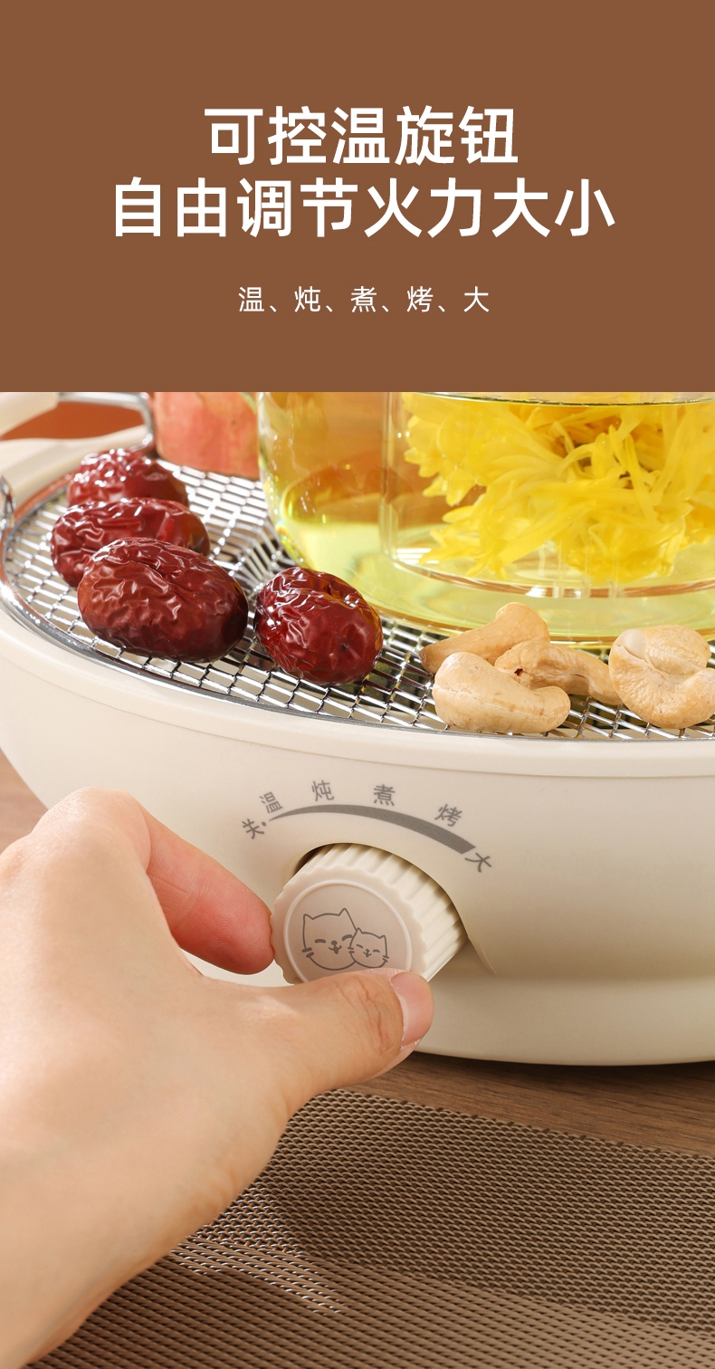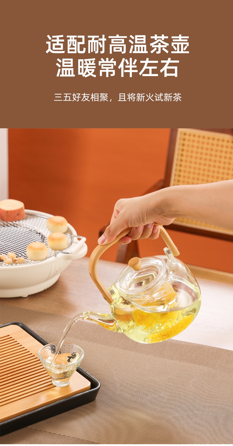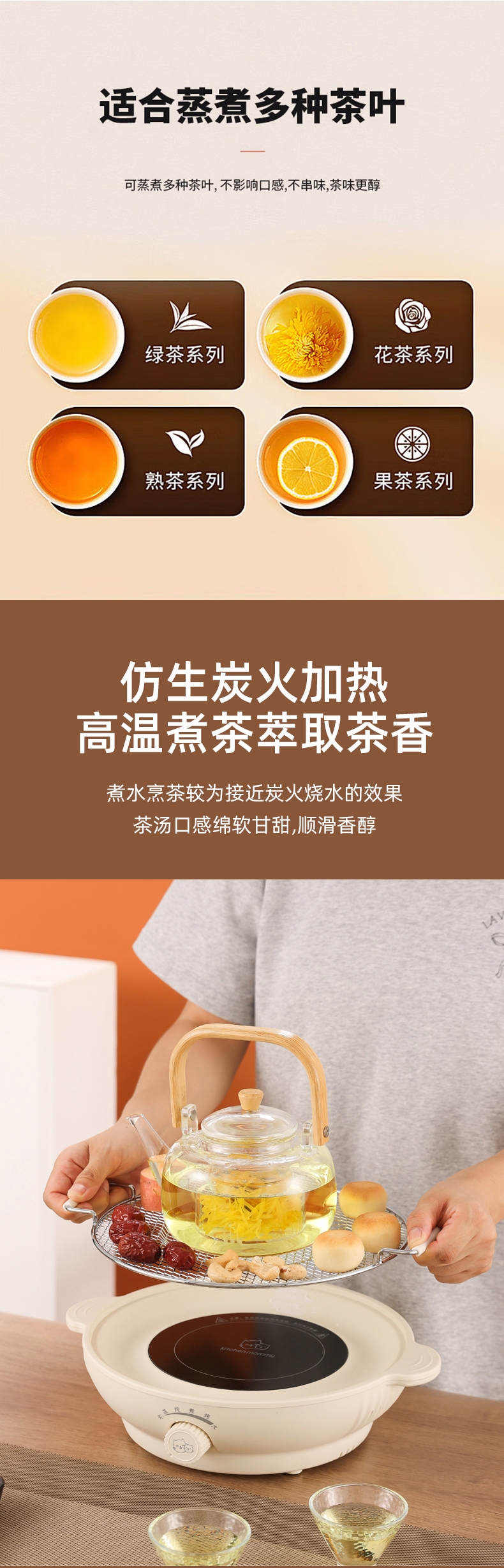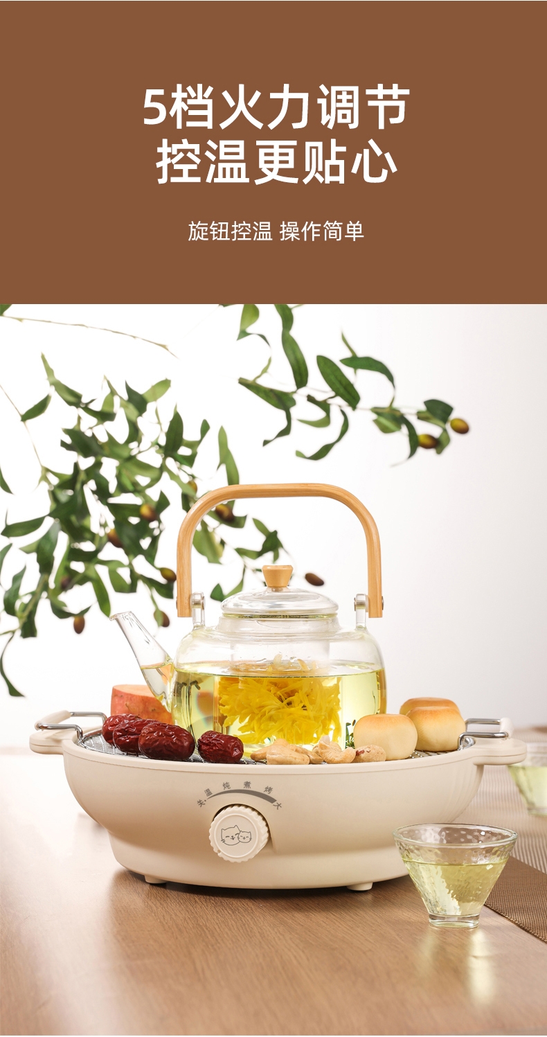 微晶面板设计,受热稳定均匀,一炉两用,可煮可烤;无烟无明火安全更放心,居家围炉煮茶更惬意;5档调温,随心所控,轻音围炉煮茶,慢品茶香;高功率,瞬间升温,不挑器具,贴心双耳把手,方便端拿;机身外壳采用尼龙防阻燃材质,材质更安全,带硅胶防烫