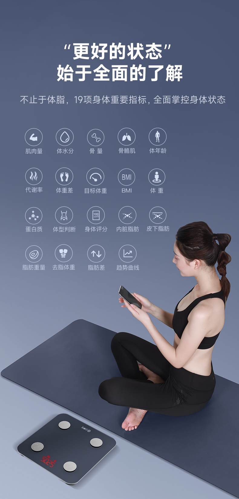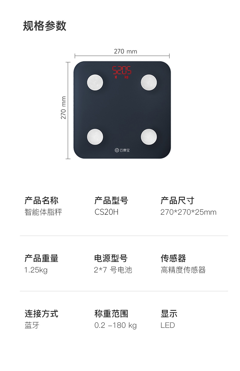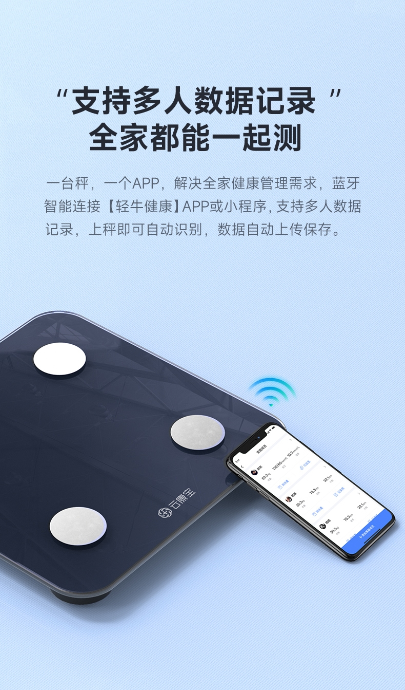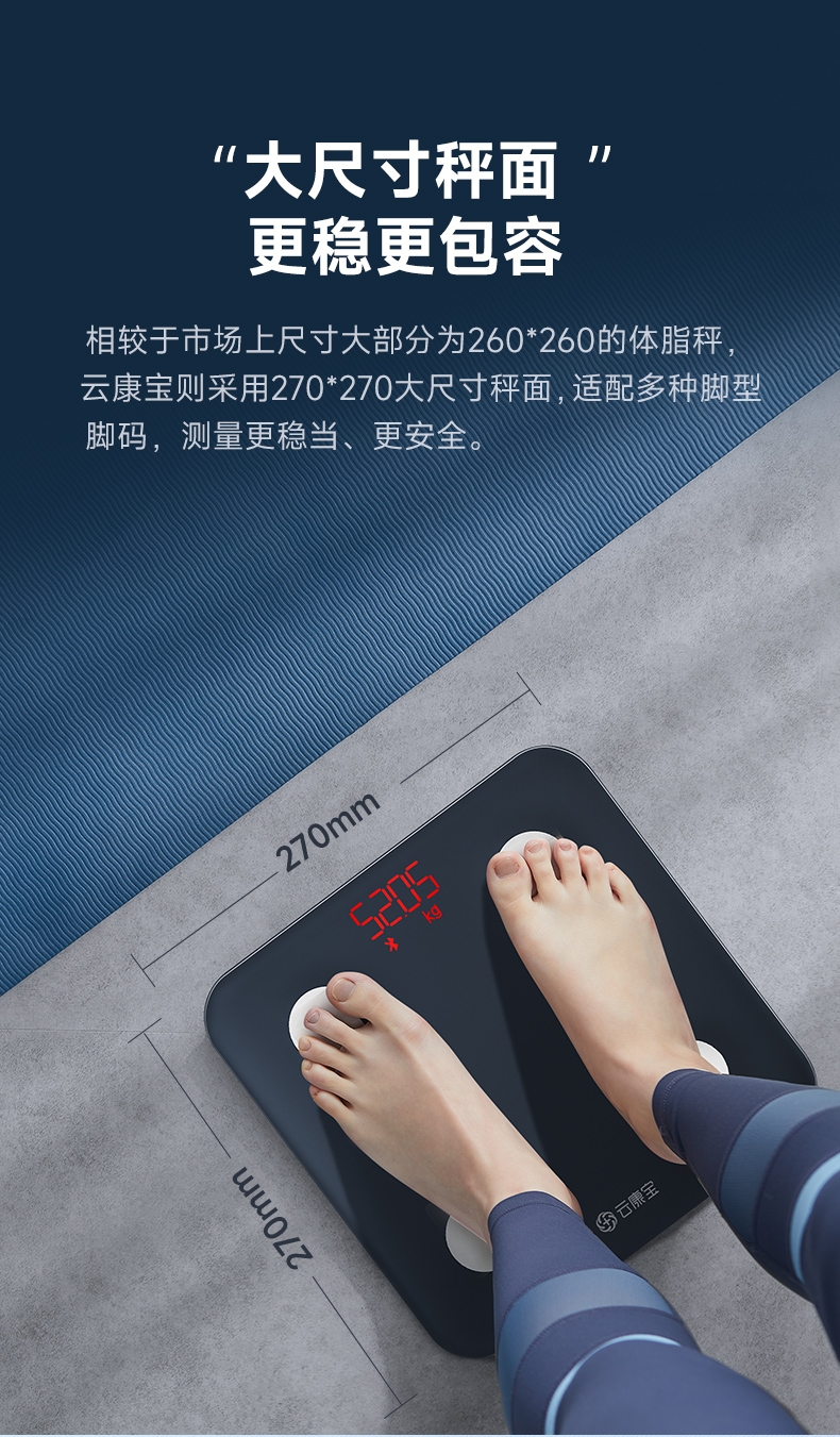 云康宝采用270*270大尺寸适配家庭成员;可以测量19项身体数据;精准到小数点后两位数,支持多人数据记录