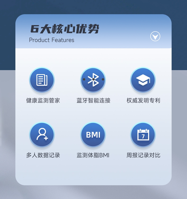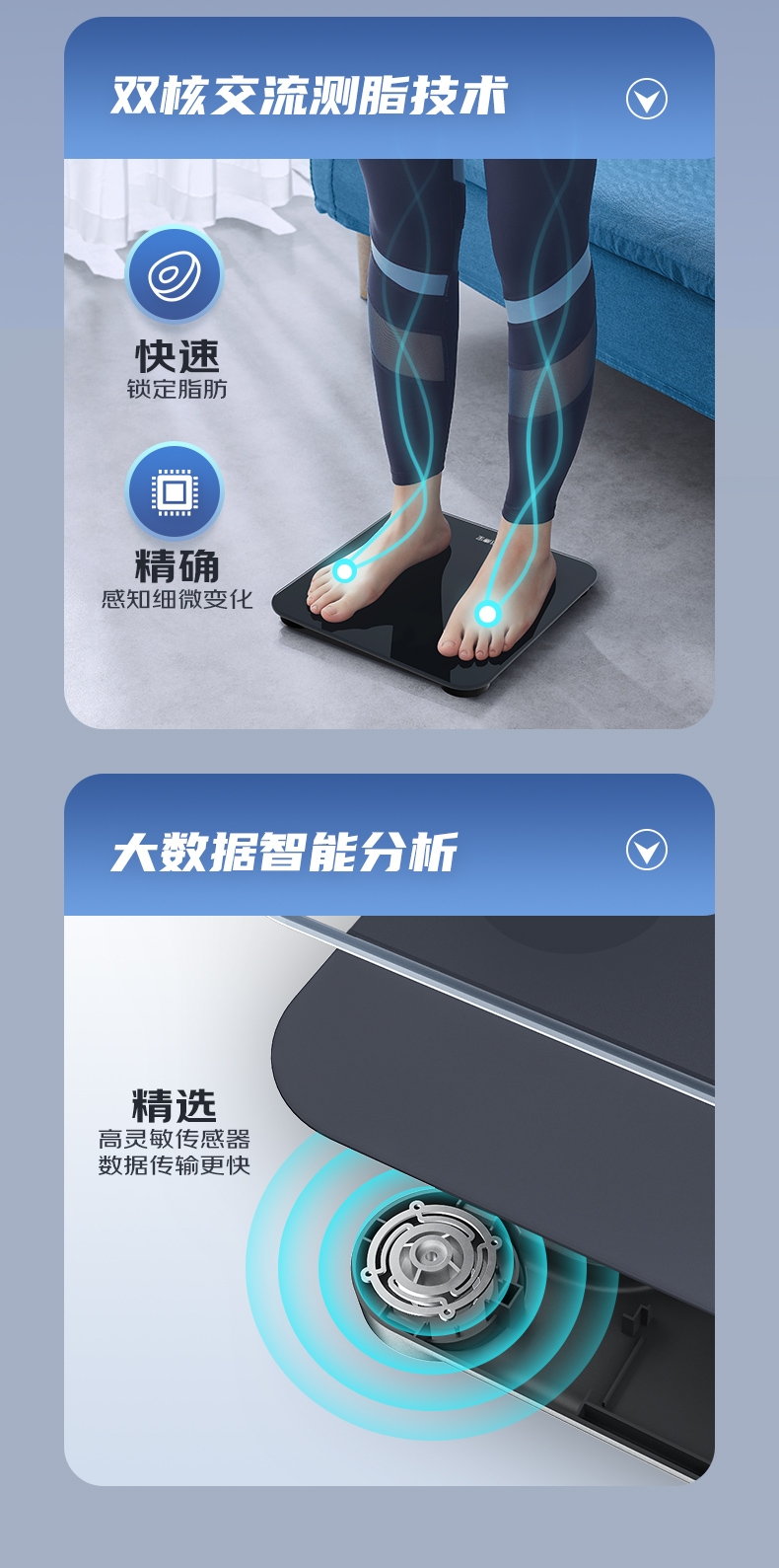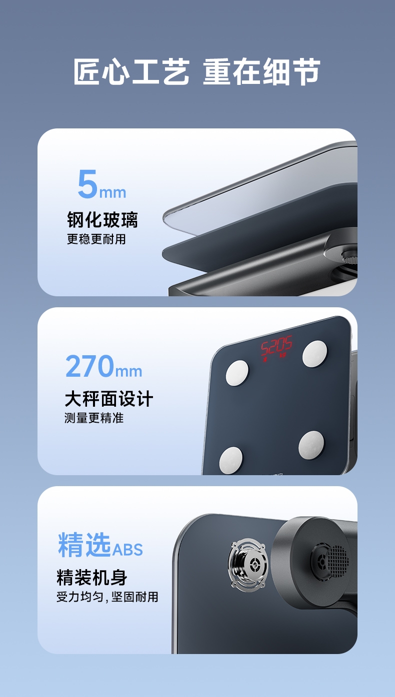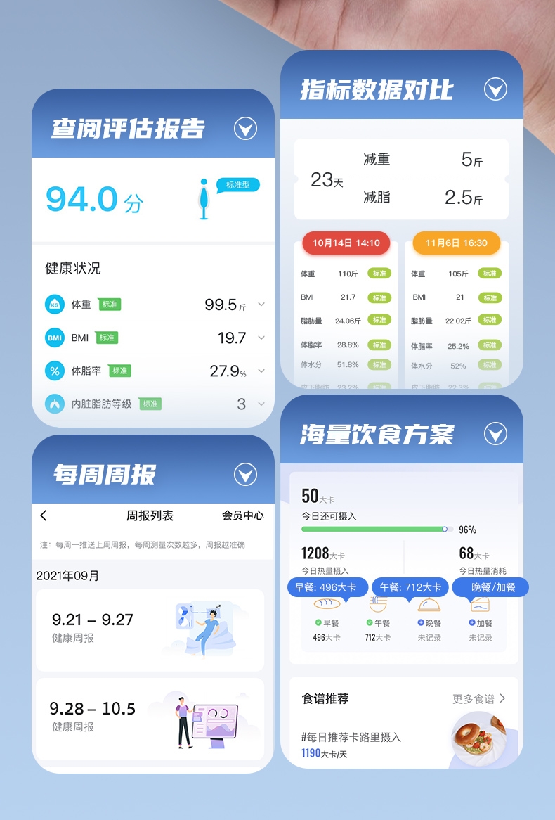 云康宝采用270*270大尺寸适配家庭成员;可以测量19项身体数据;精准到小数点后两位数,支持多人数据记录