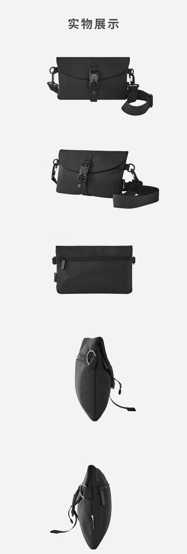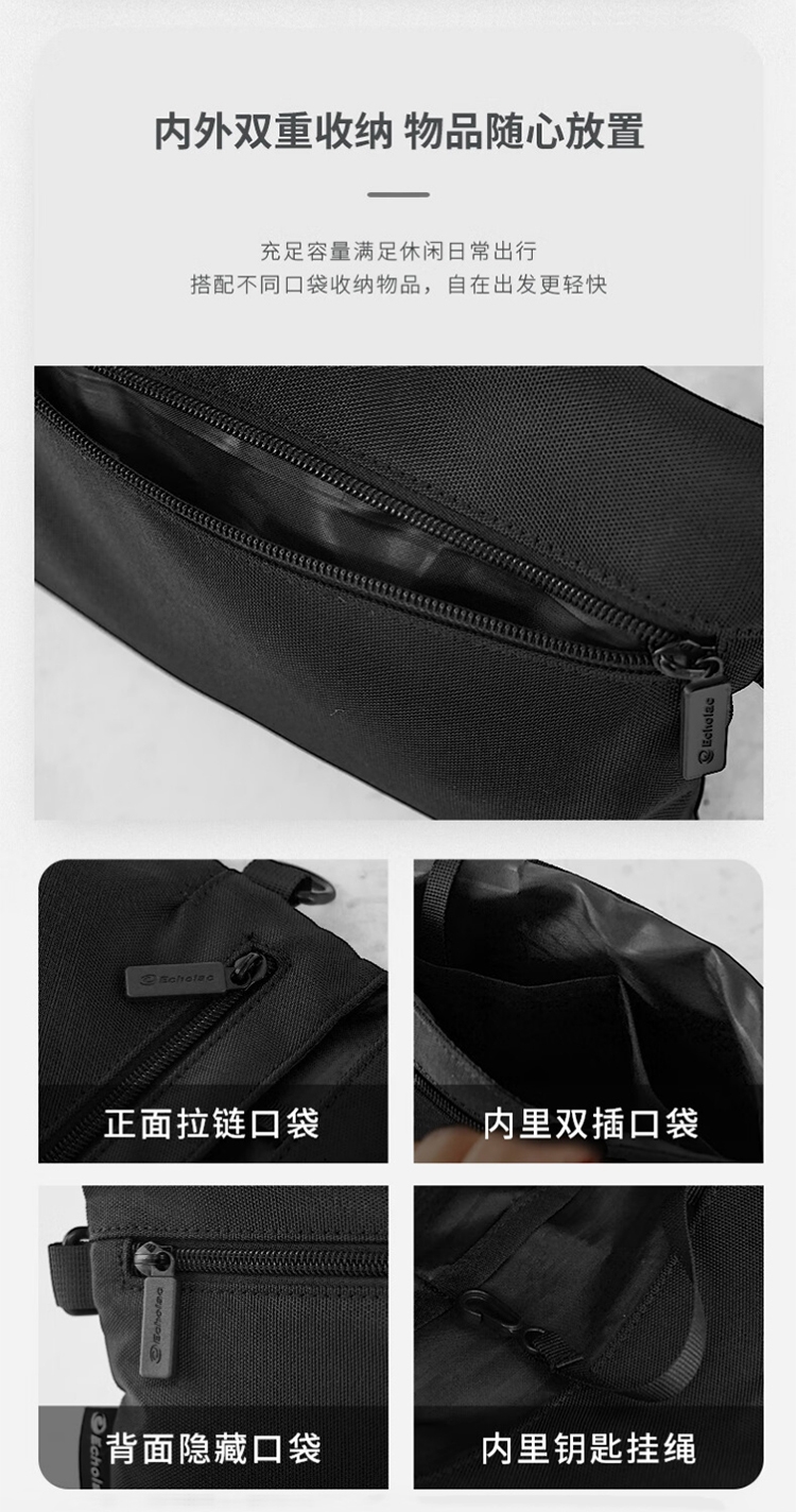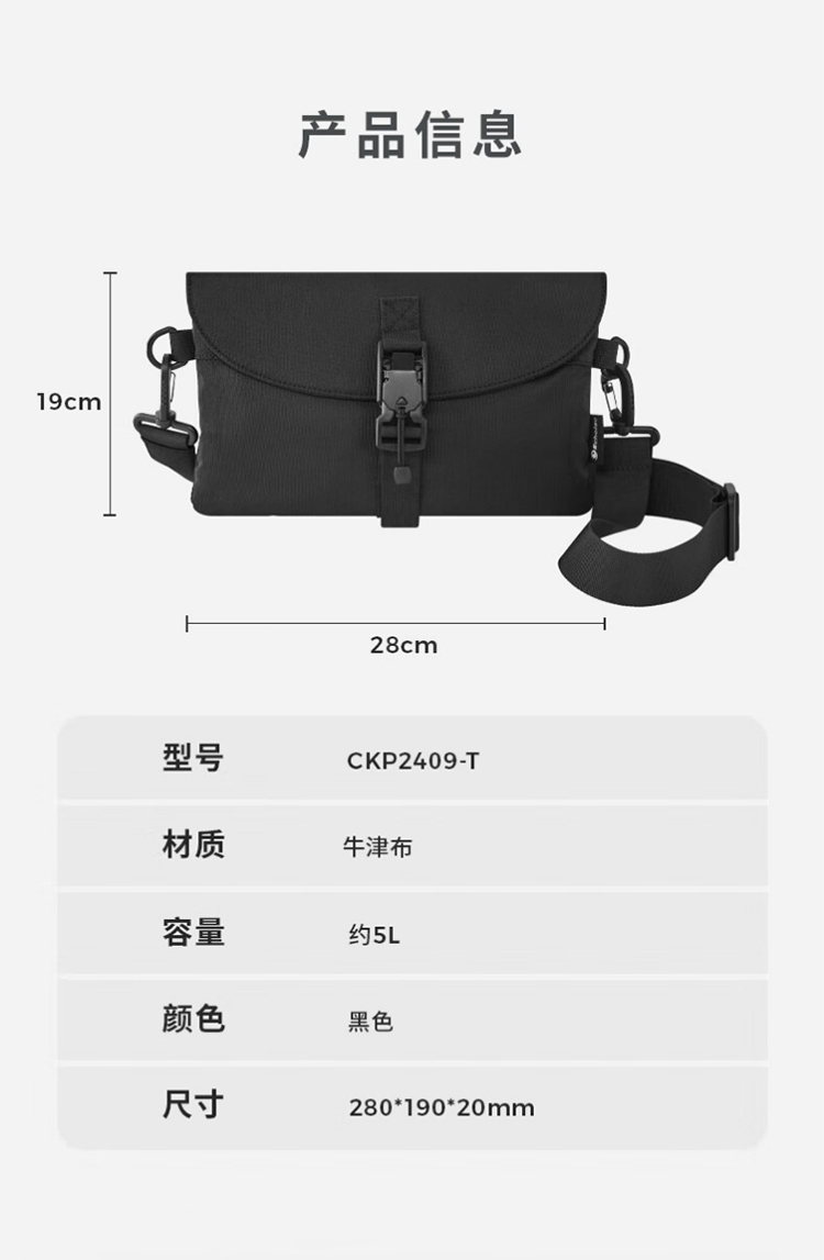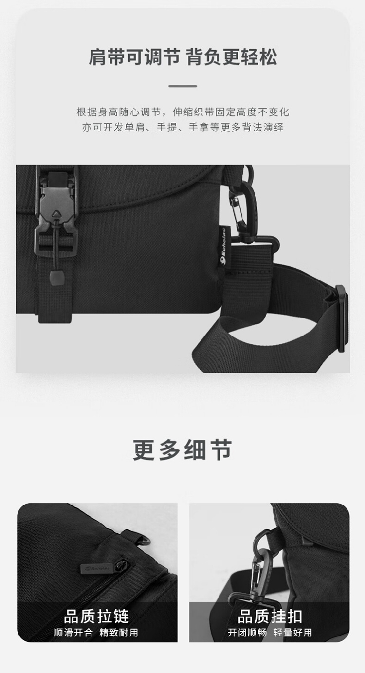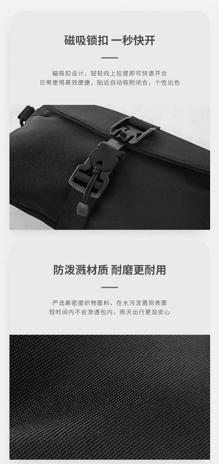 高密度织物面料在水污泼溅到表面的短时间内不会渗透;磁吸扣设计,轻轻向上拉提即可快速开合;伸缩织带固定高度不变化,亦可开发单肩、手提、手拿等
