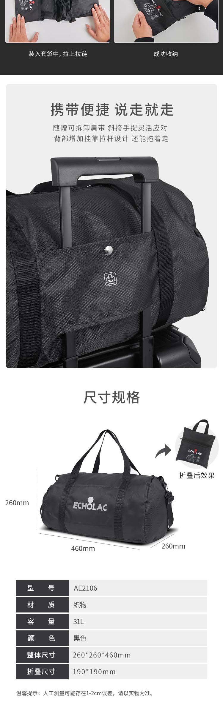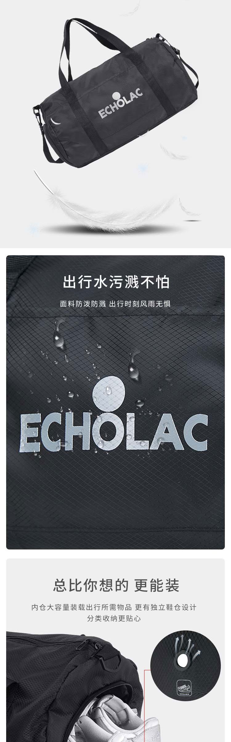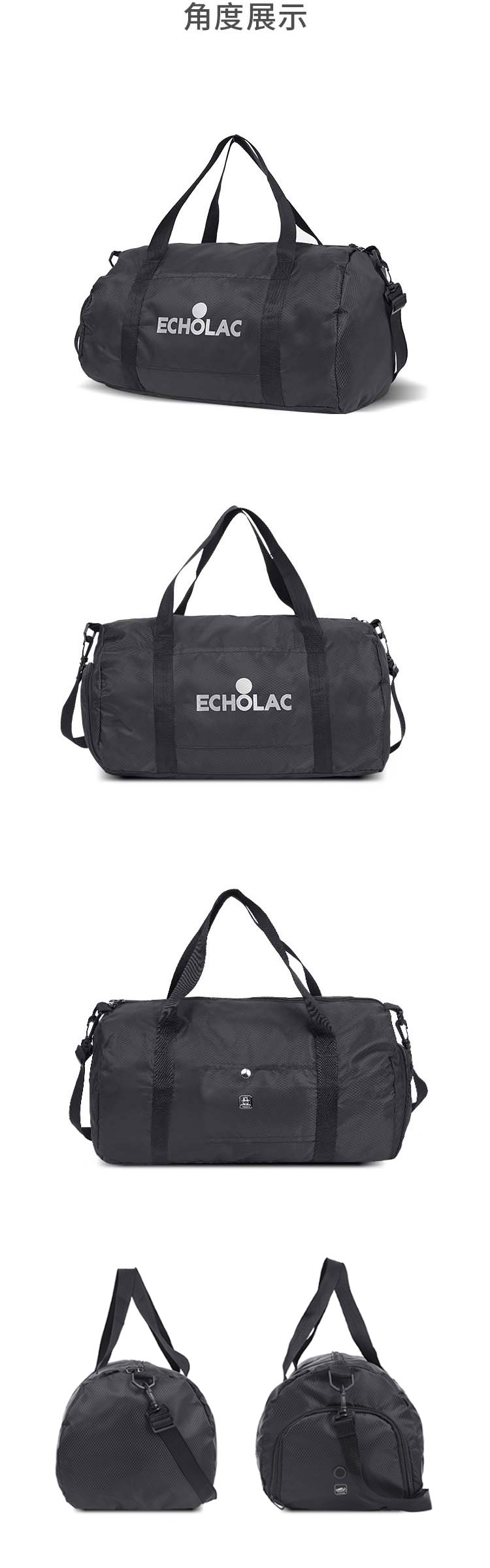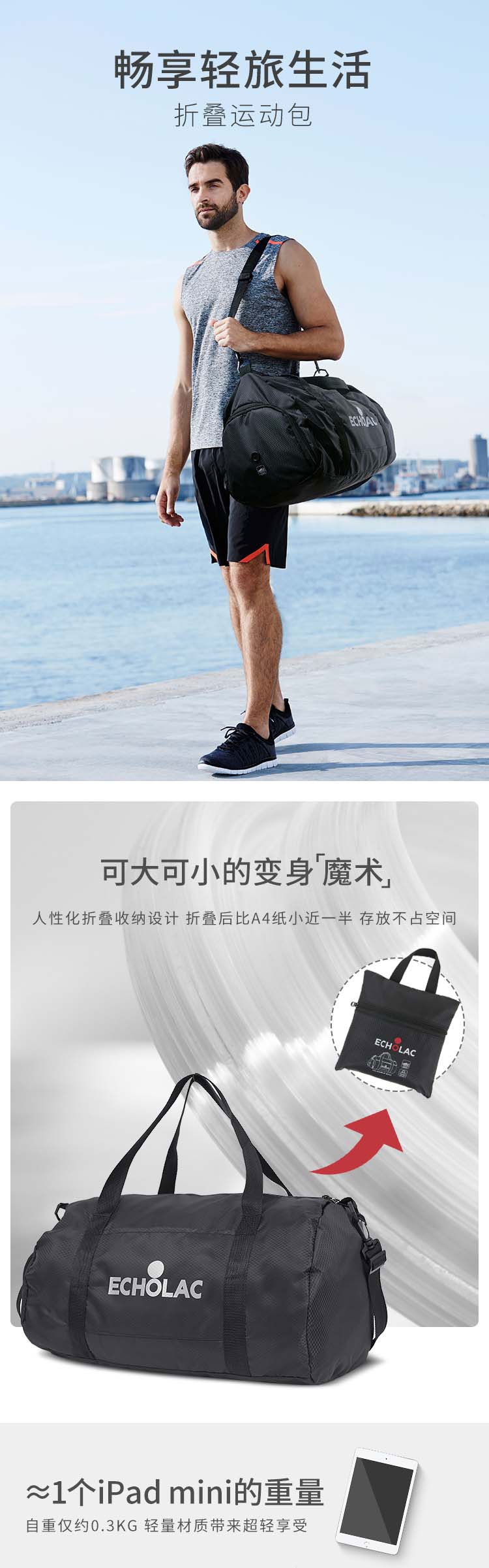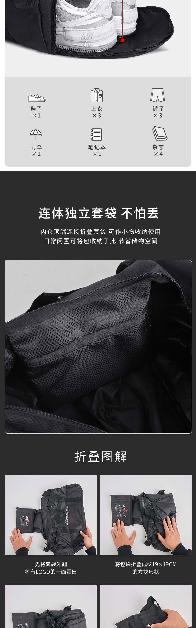 简易折叠收纳,便携出行;大容量,干湿分离层、舒适透气;高弹性涤纶面料强韧、耐磨损、防泼水
