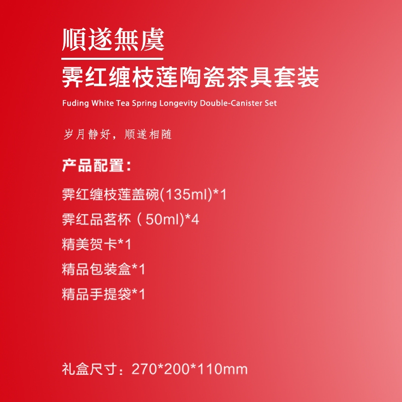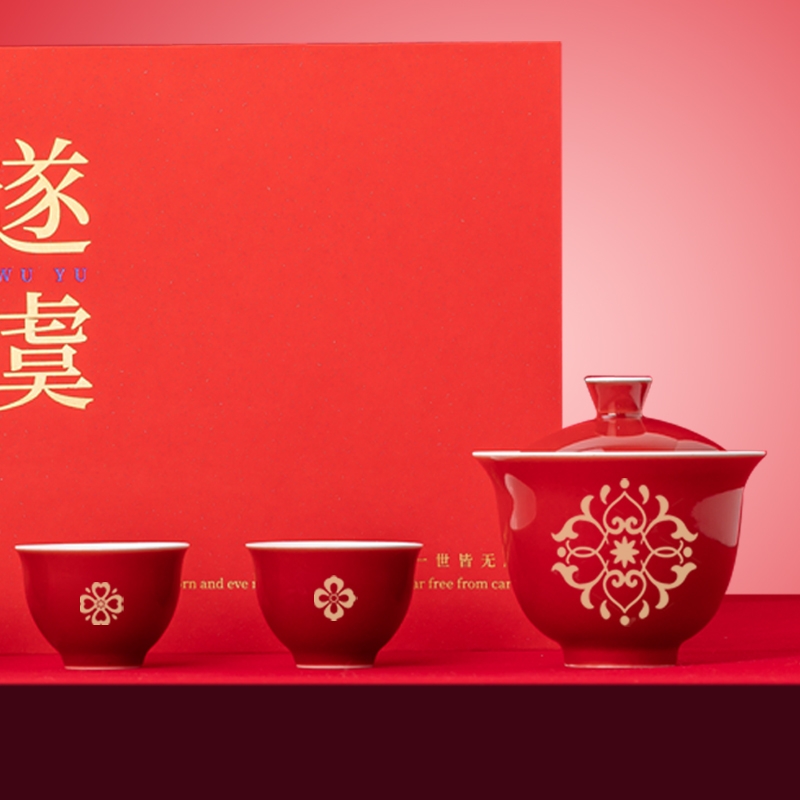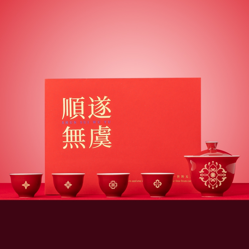 霁红缠枝莲设计,中式典雅,开门红喜庆吸睛;盖碗 + 4 杯 + 礼盒,配置齐全,满足品饮送礼;顺遂无虞美好寓意,送礼传递祝福心意;陶瓷霁红工艺,质感细腻,茶具品质上乘;精品礼盒手提袋,包装精致,送礼体面有档次