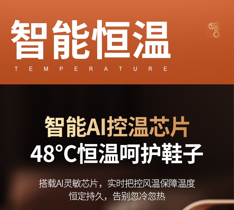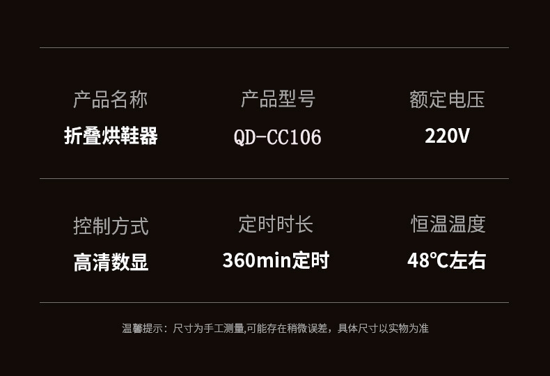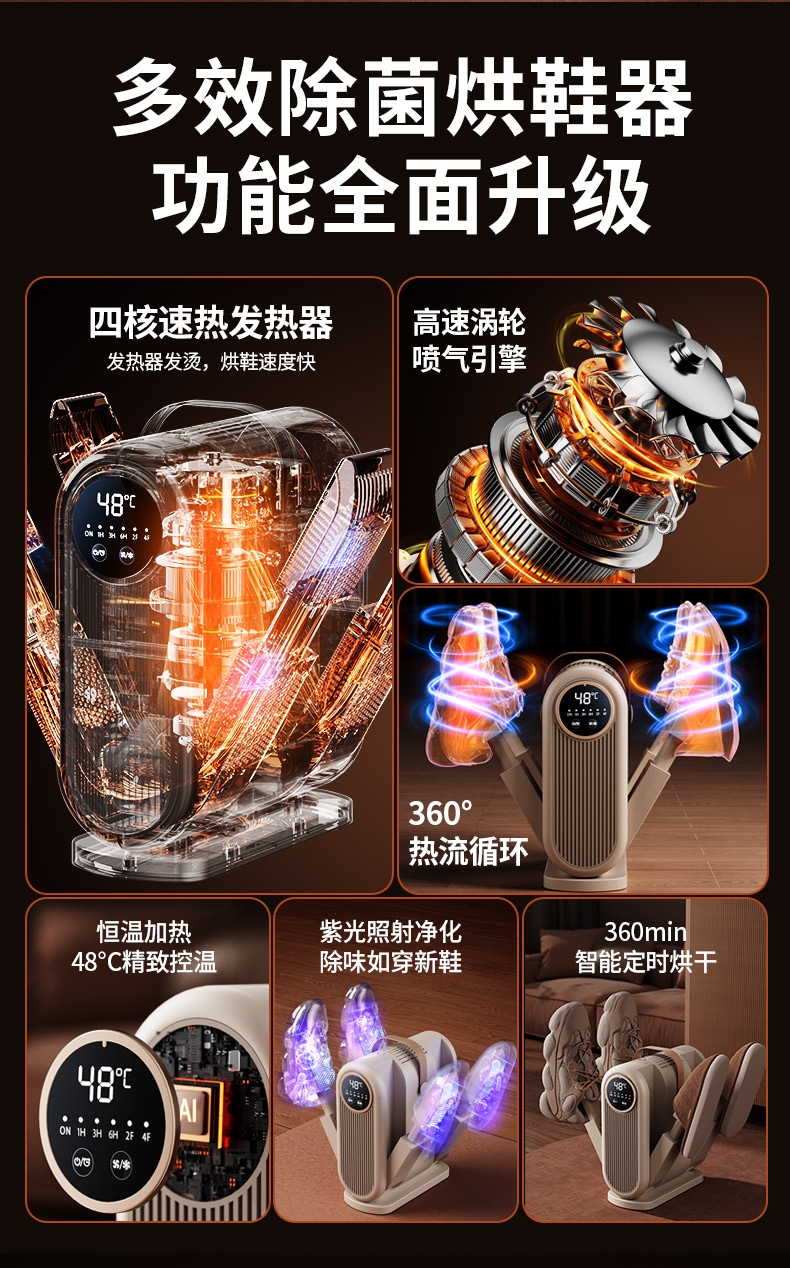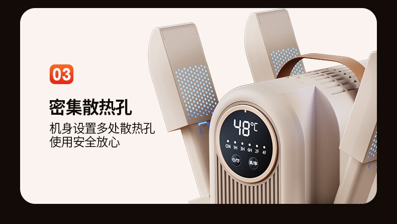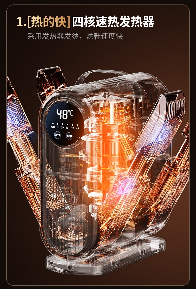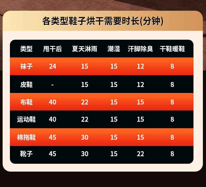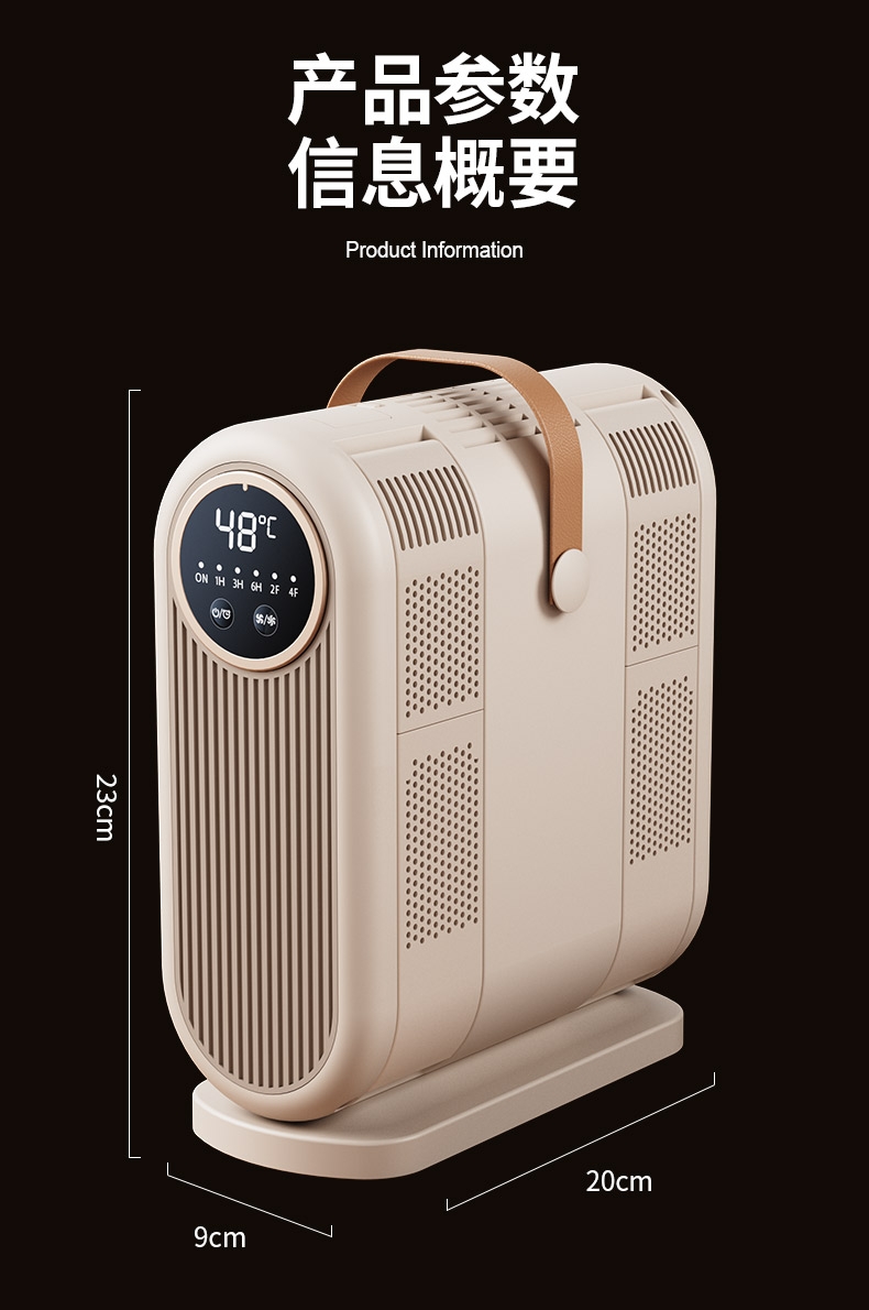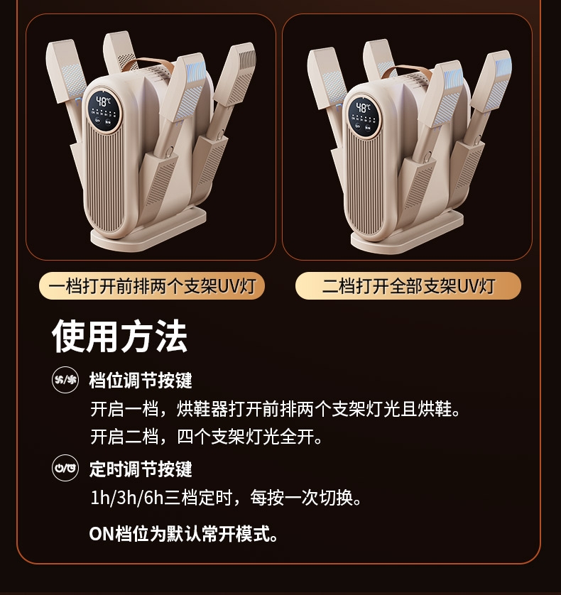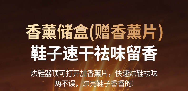 一至六小时定时按需求可调节鞋干自停无需看侯安心使用;立体环绕式热循环暖风搅动,速热高效均匀热度整鞋烘干;高密集紫光均匀照射,让细菌无处滋生繁衍多重杀菌除臭;智能恒温控温芯片安全烘干鞋不会因温度过高而损伤鞋子;顶部设计香薰储盒,快速烘鞋去味留香两不误全鞋型通用