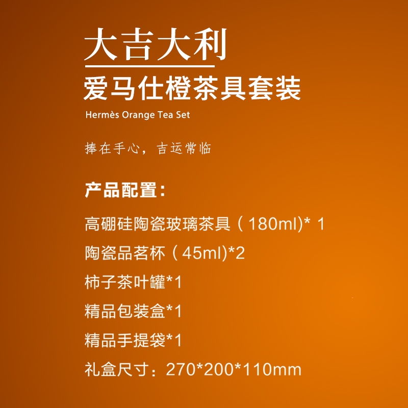配置清单:高硼硅陶瓷玻璃茶具(180ml)*1 陶瓷品茗杯(45ml)*2 柿子茶叶罐*1 精品包装盒*1 精品手提袋*1