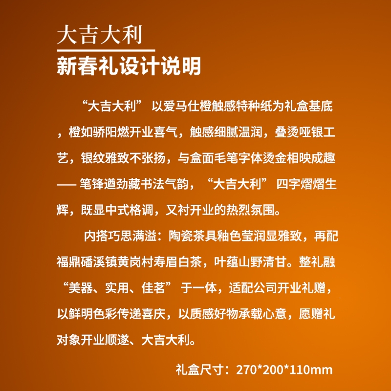 爱马仕橙配色 + 大吉大利寓意,高端喜庆,送礼吸睛;柿柿如意茶叶罐 + 双品茗杯,吉祥实用,茶礼心意足;高硼硅玻璃 + 陶瓷材质,耐热耐用,茶具品质过硬;开门红新品,适配商务、节日、伴手礼等多场景送礼;精品礼盒 + 手提袋,包装精致,商务送礼显档次
