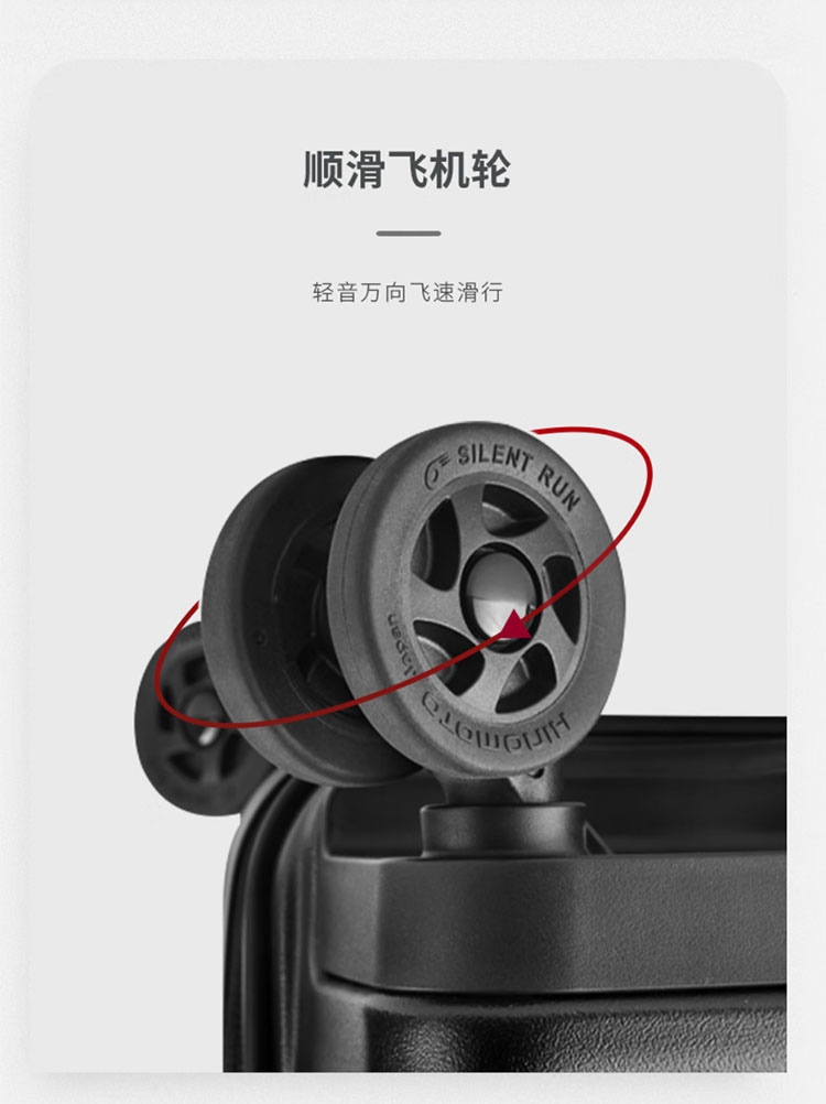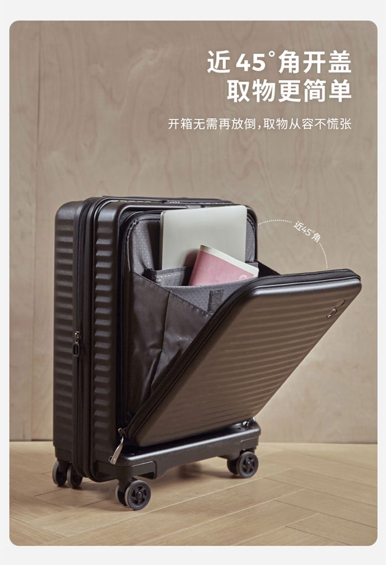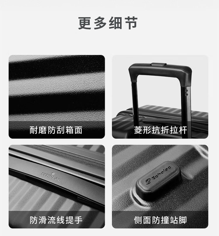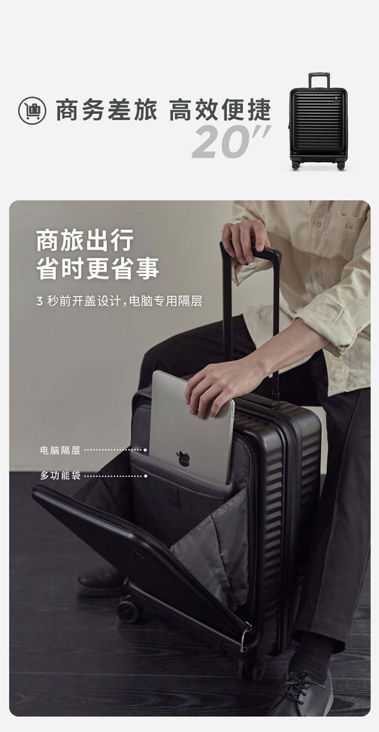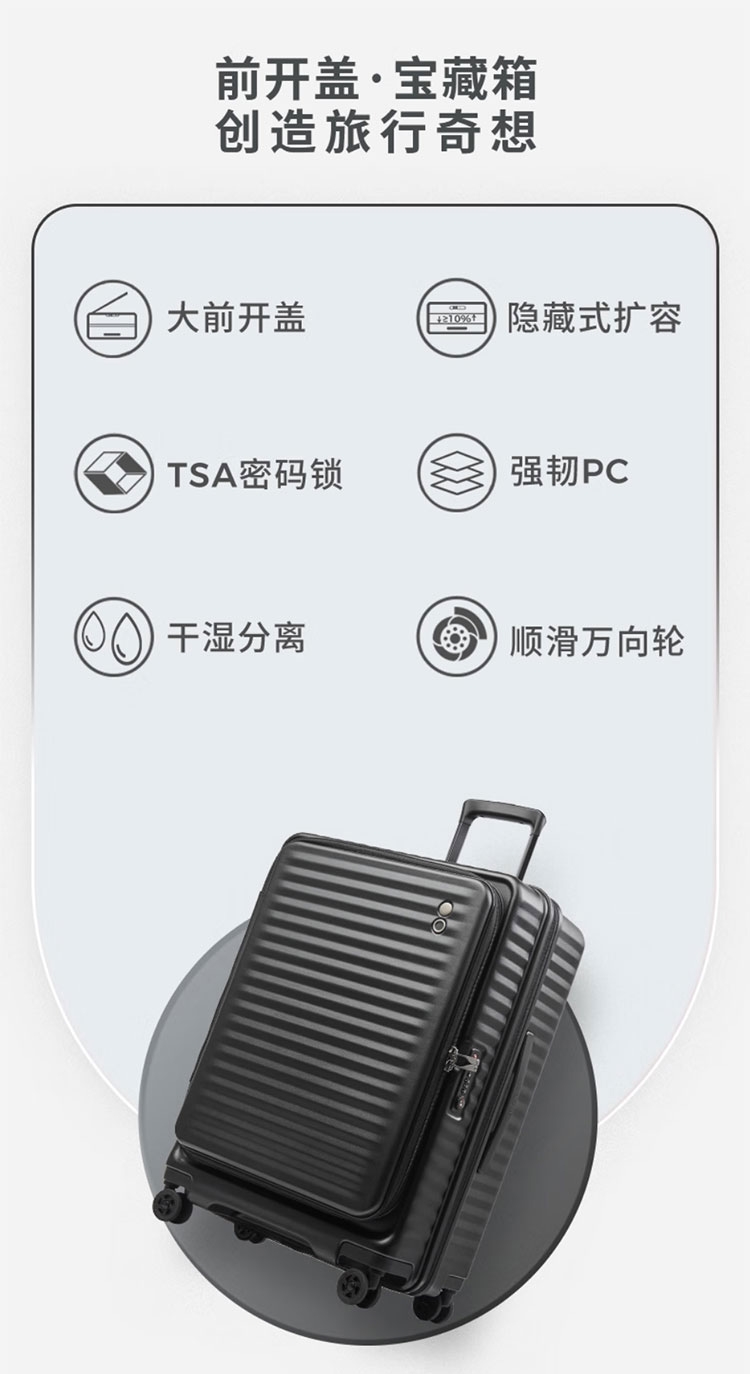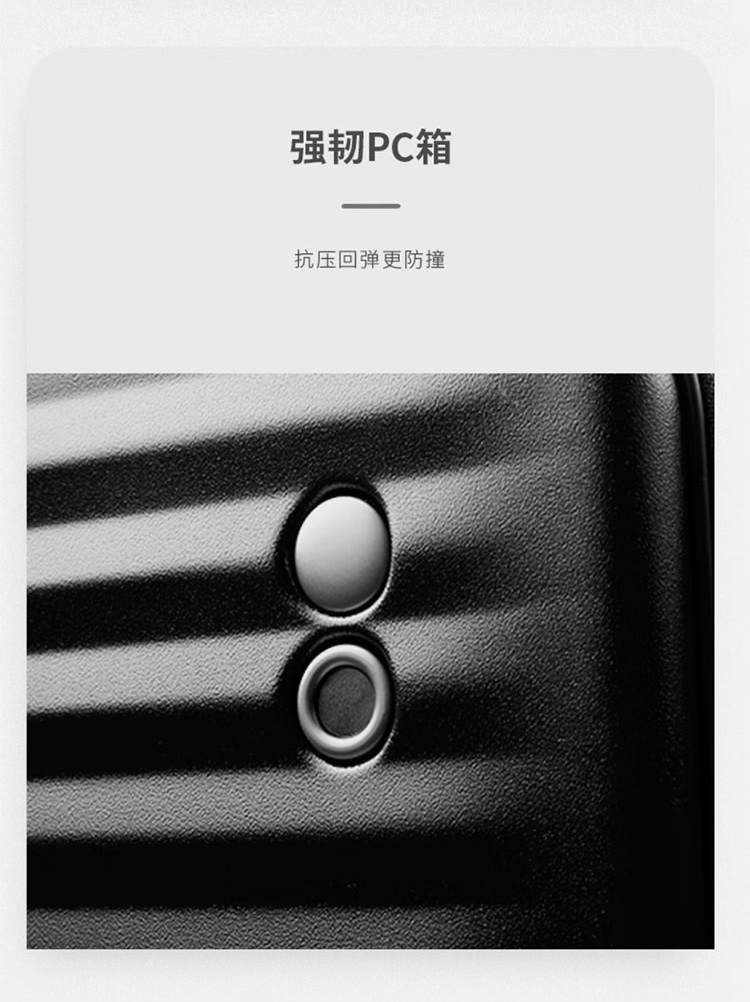 箱体采用坚韧PC材质,抗压回弹更防撞。;使用万向八轮,能适应各种路面,顺畅无阻碍;3秒前开盖设计,电脑隔层,多功能袋,省时更省事