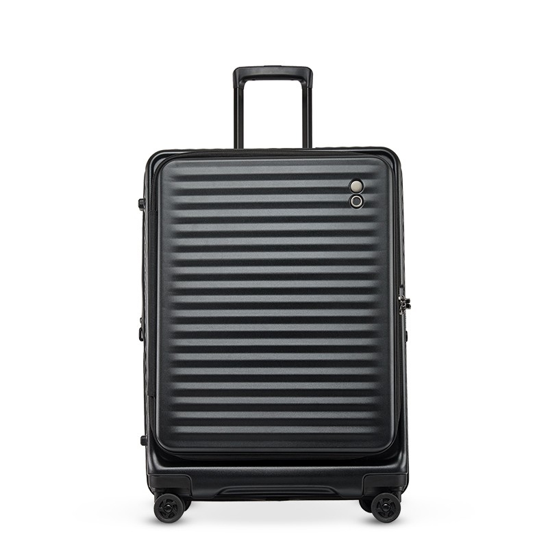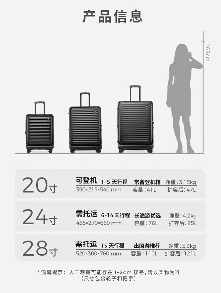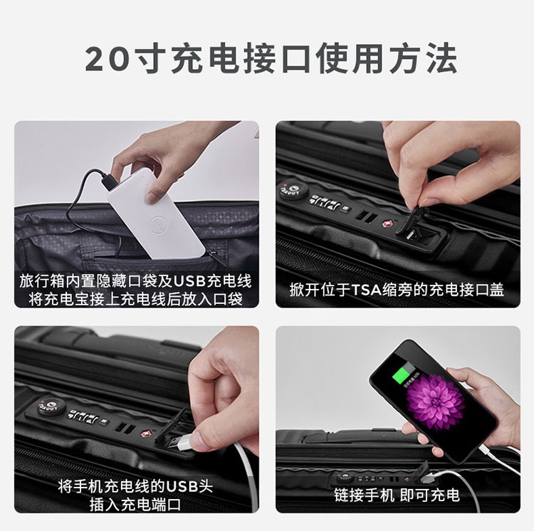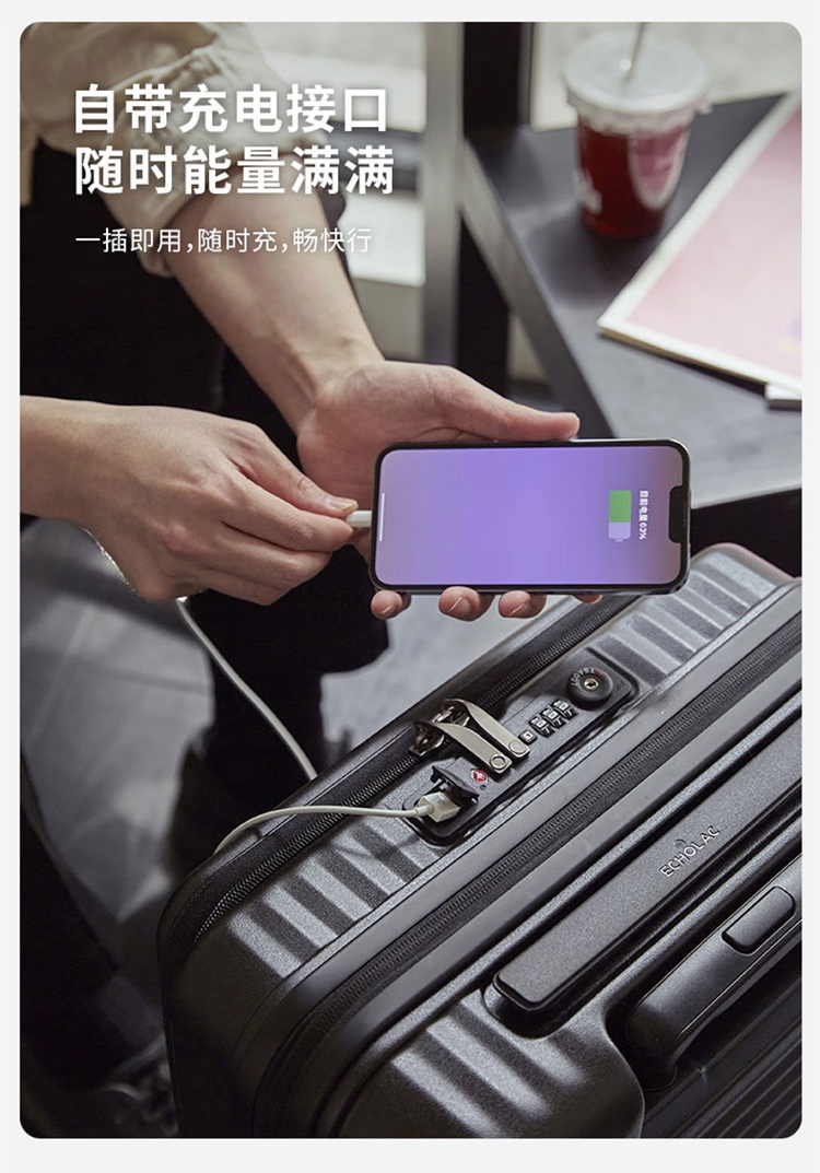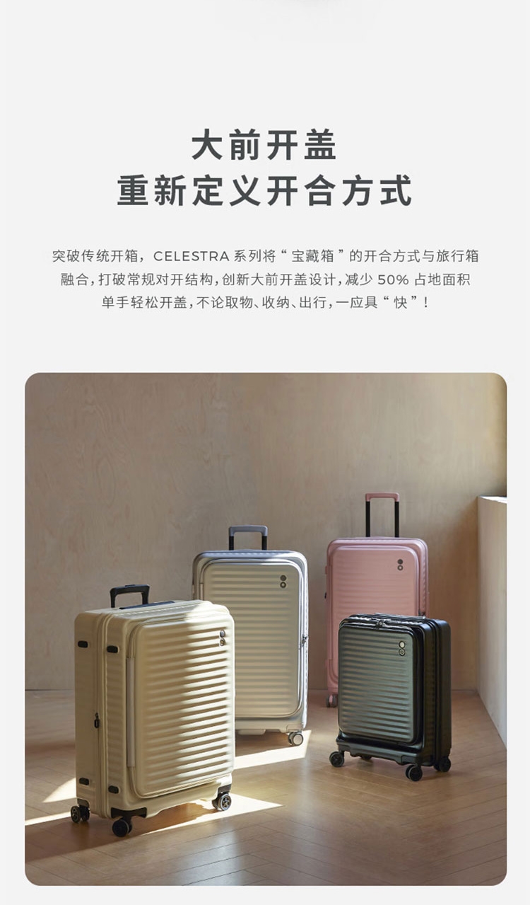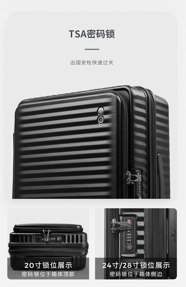 箱体采用坚韧PC材质,抗压回弹更防撞。;使用万向八轮,能适应各种路面,顺畅无阻碍;3秒前开盖设计,电脑隔层,多功能袋,省时更省事