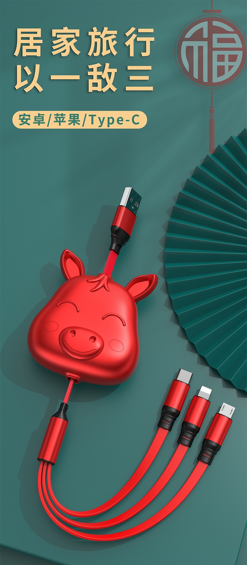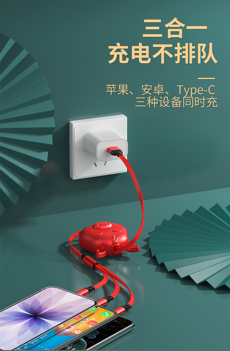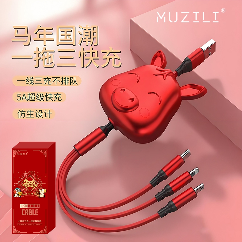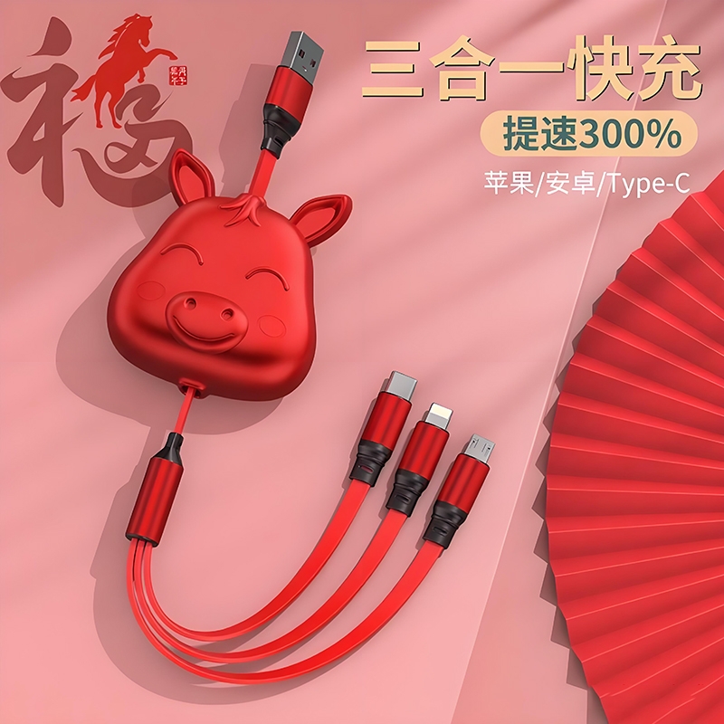 66W超级快充,充电更快;马年元素造型,一体成型充电头;三种接口满足各种手机;1.2米长度设计,使用方便;编织线耐磨耐用,不易折断