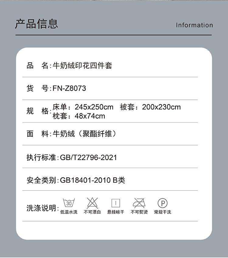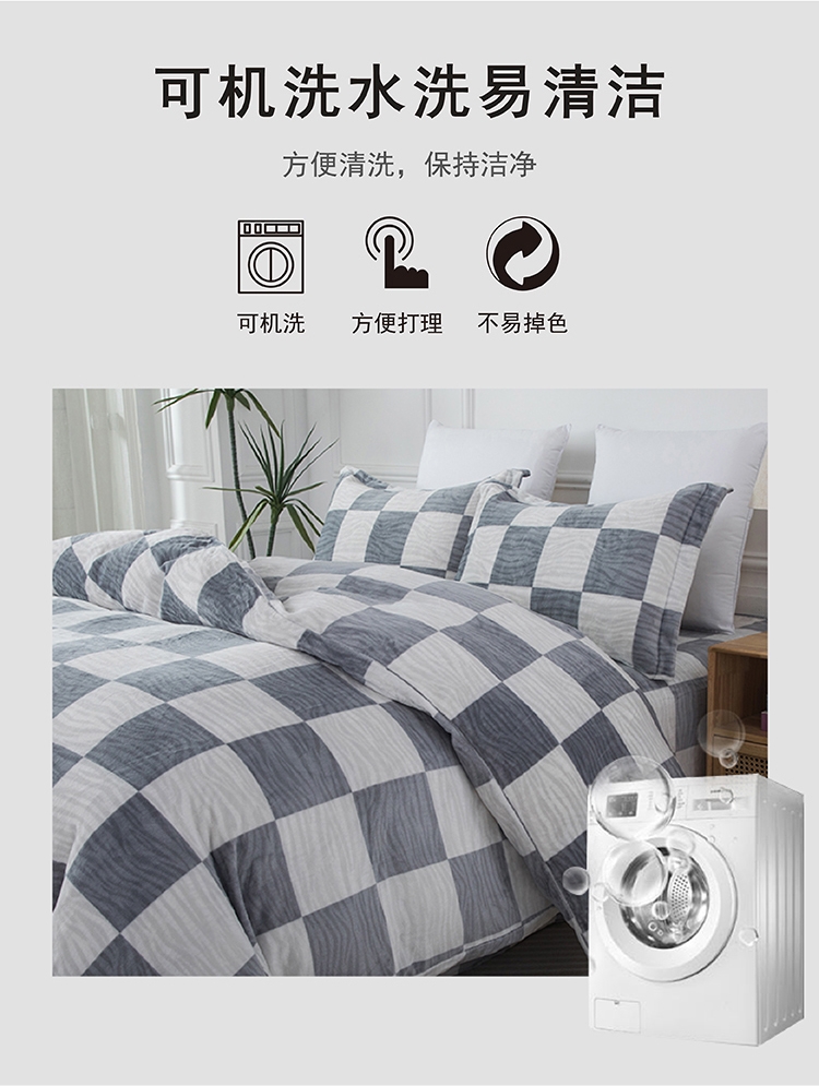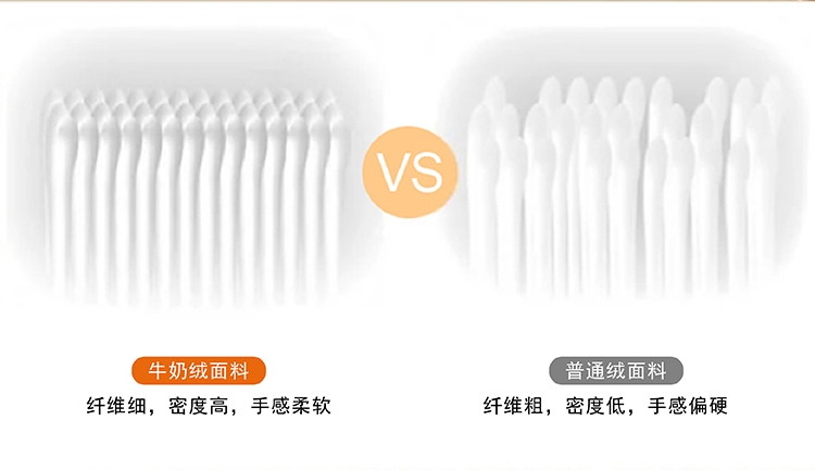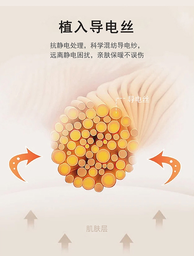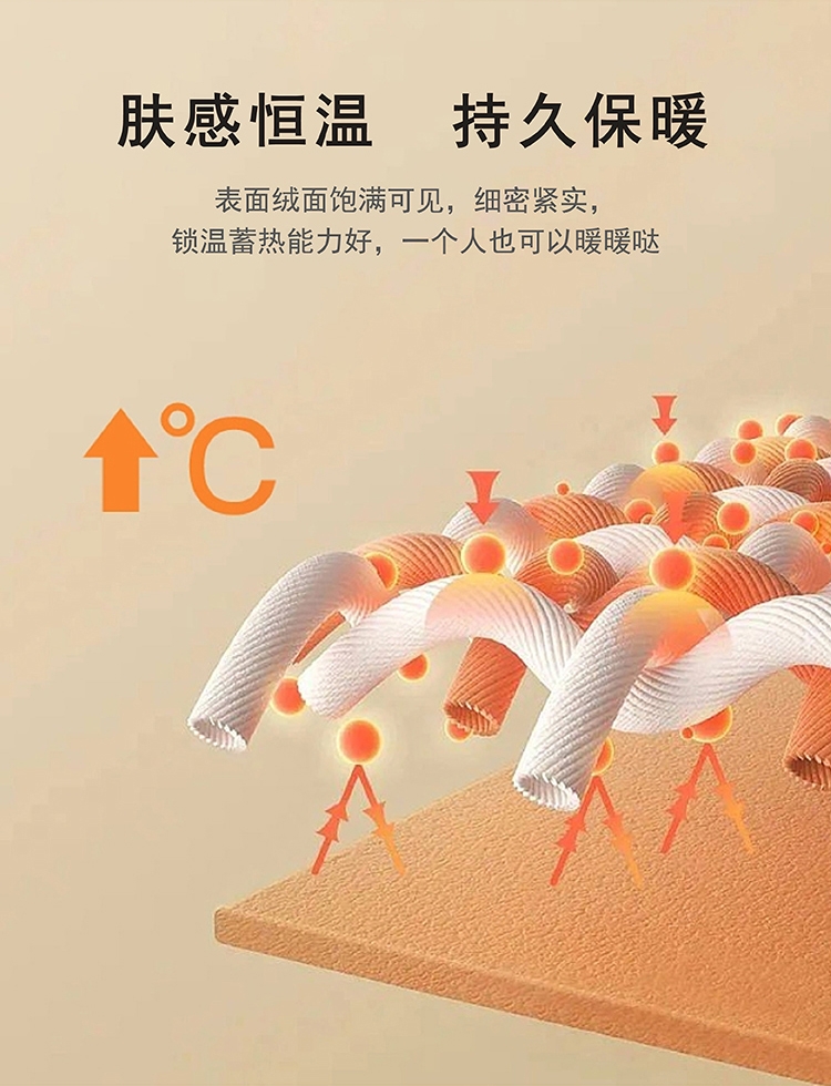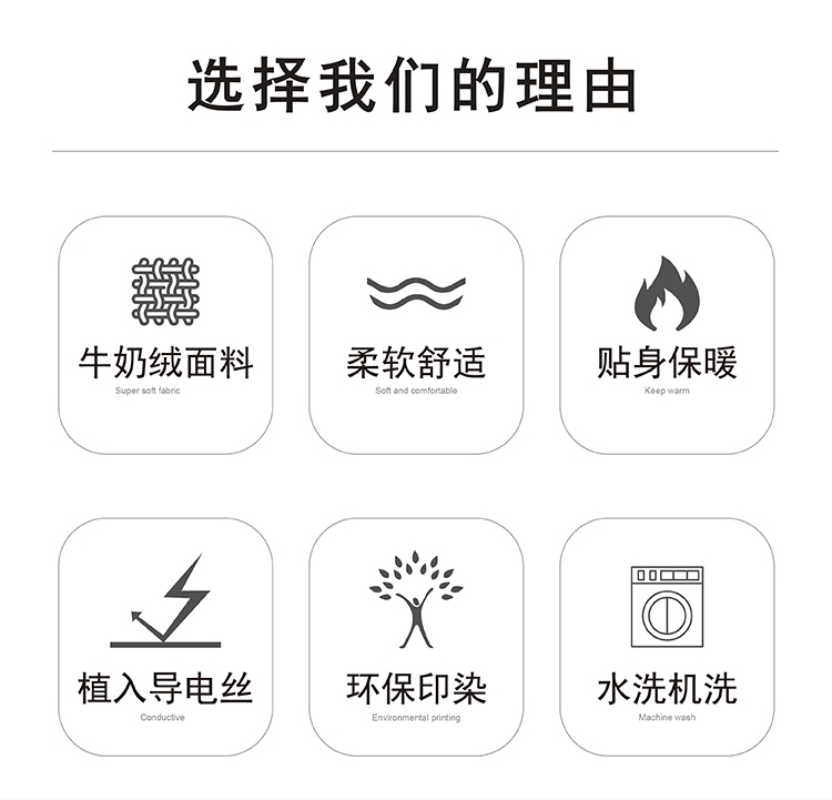 高密牛奶绒面料,柔软亲肤,保暖透气;活性印染工艺,色彩均匀;内植入导电丝,告别静电烦恼