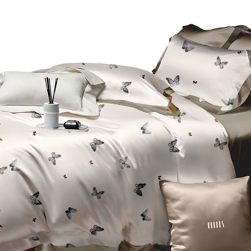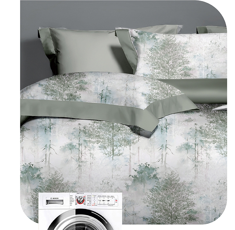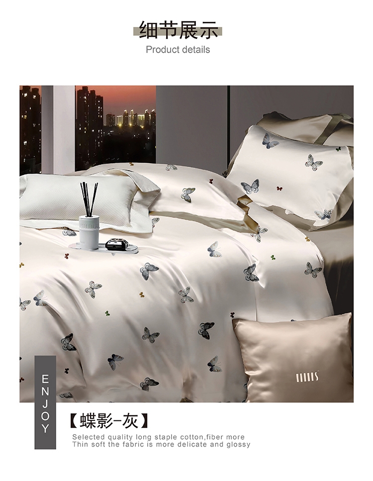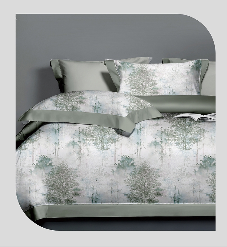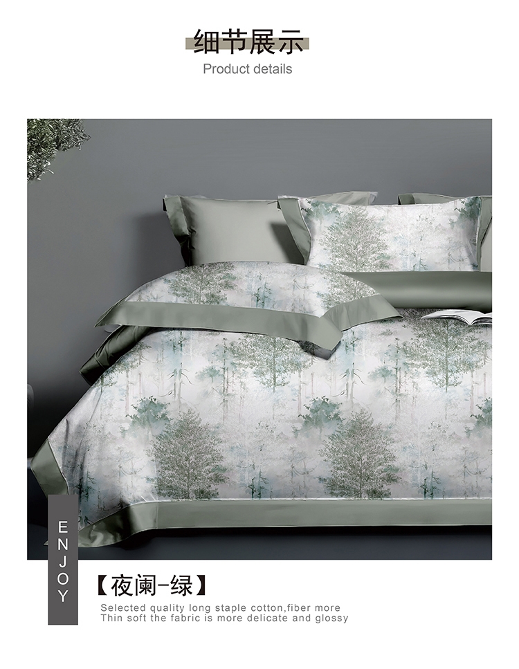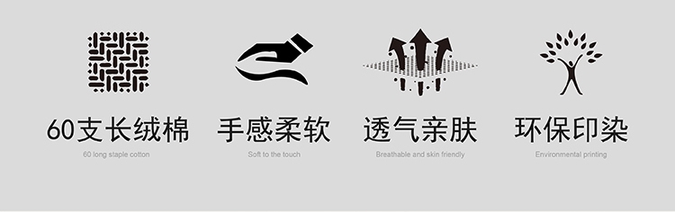 选用60支高密度全棉面料,手感柔软舒适,透气性能强;锁边内缝式被套,圆角贴边床单,做工扎实精细;花型时尚、艳丽、明亮,数码印染