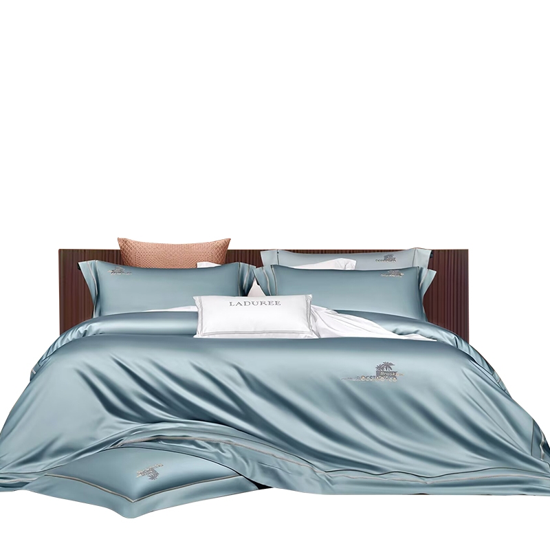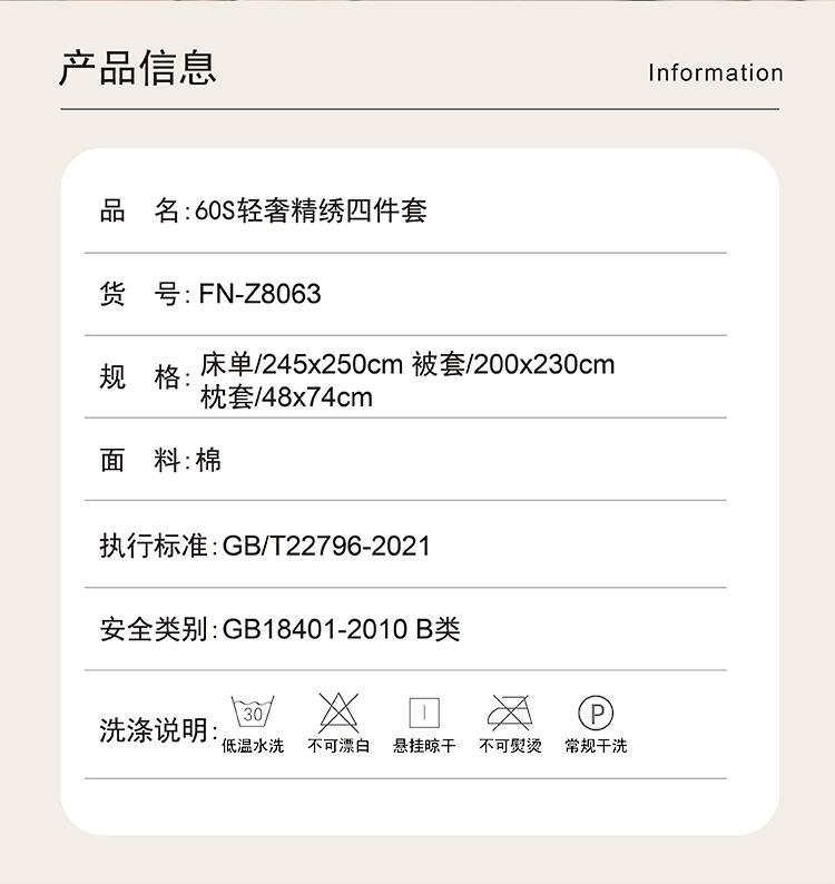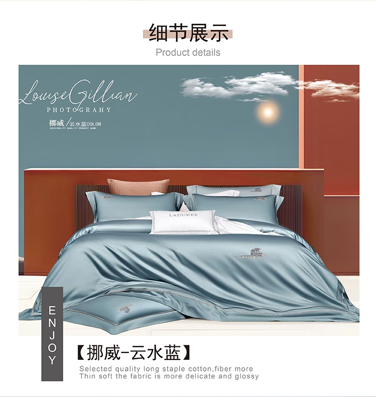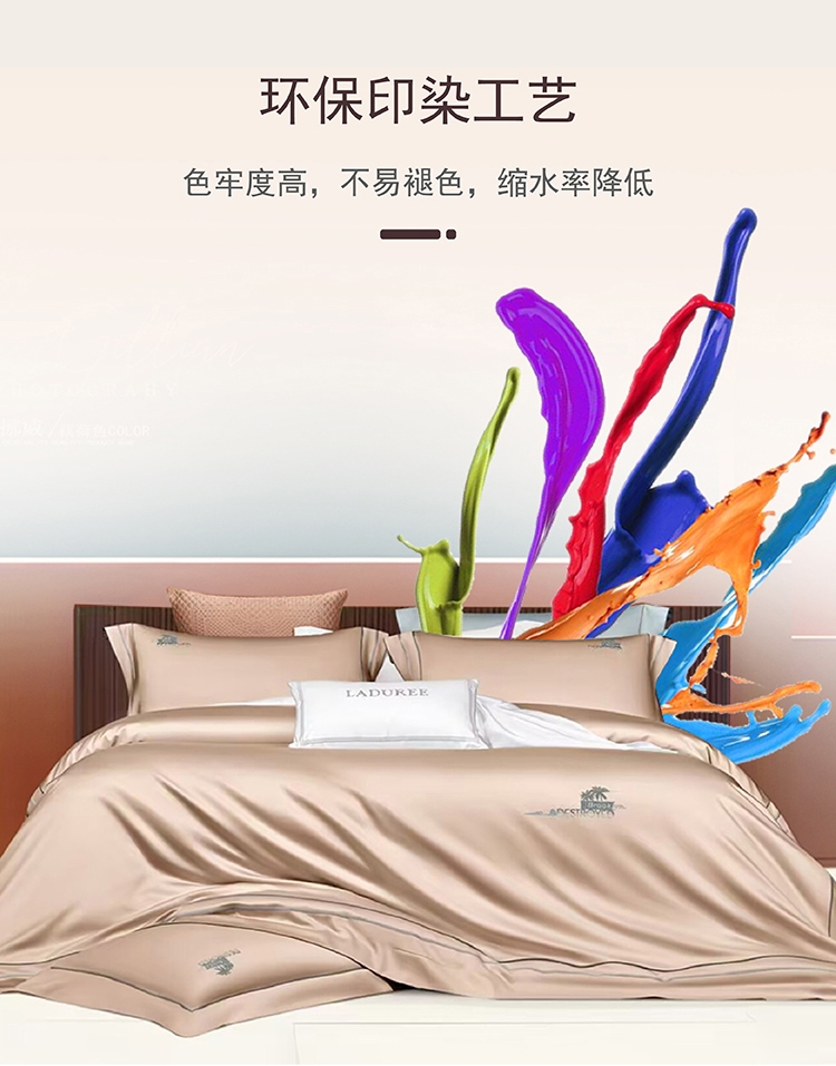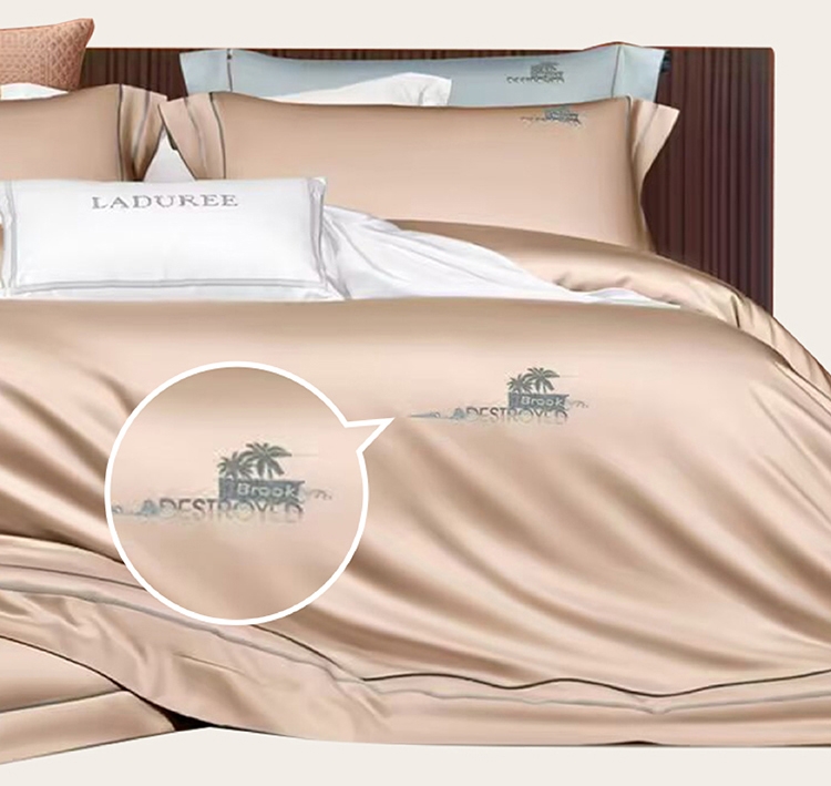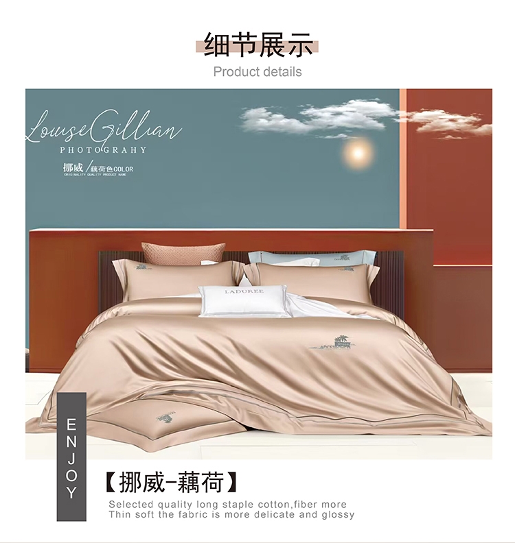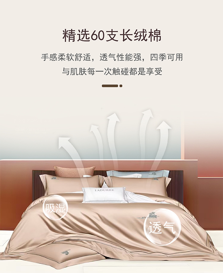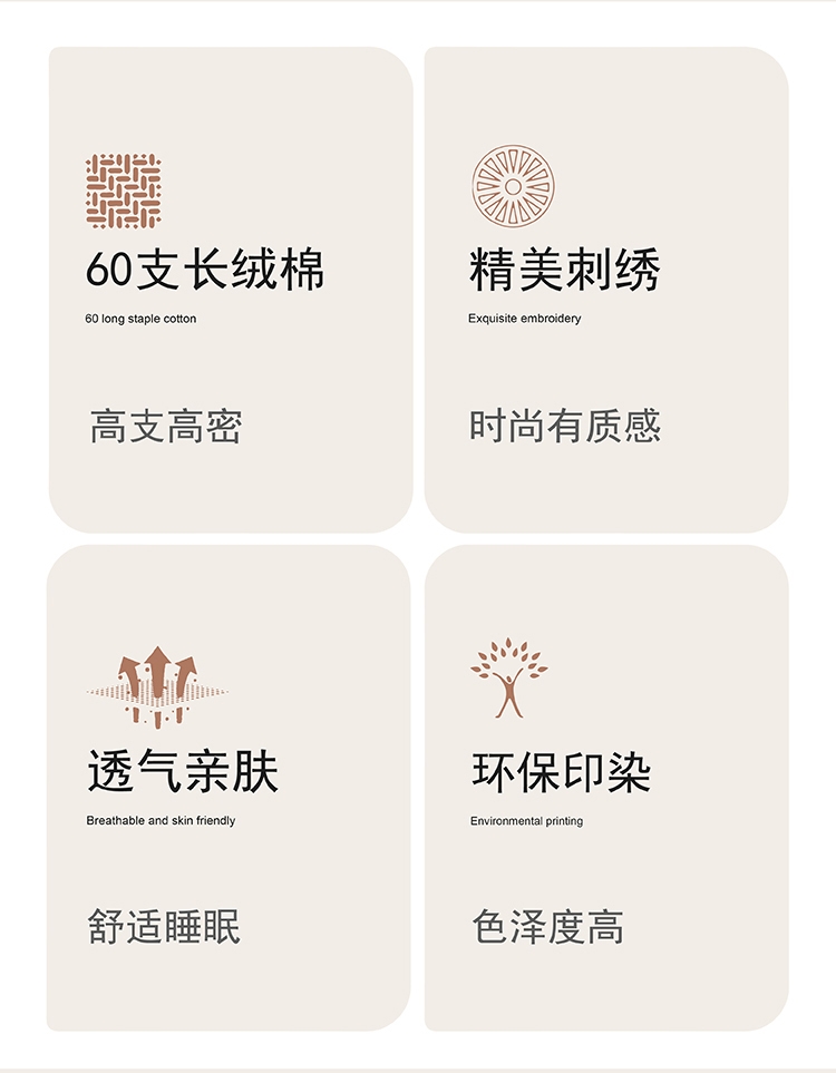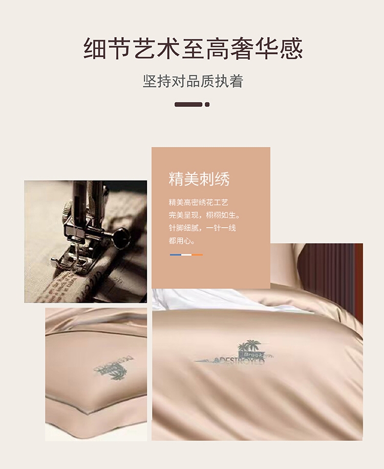 选用60支高密度全棉面料,手感柔软舒适,透气性能强;锁边内缝式被套,圆角贴边床单,做工扎实精细;精致高密定位刺绣工艺